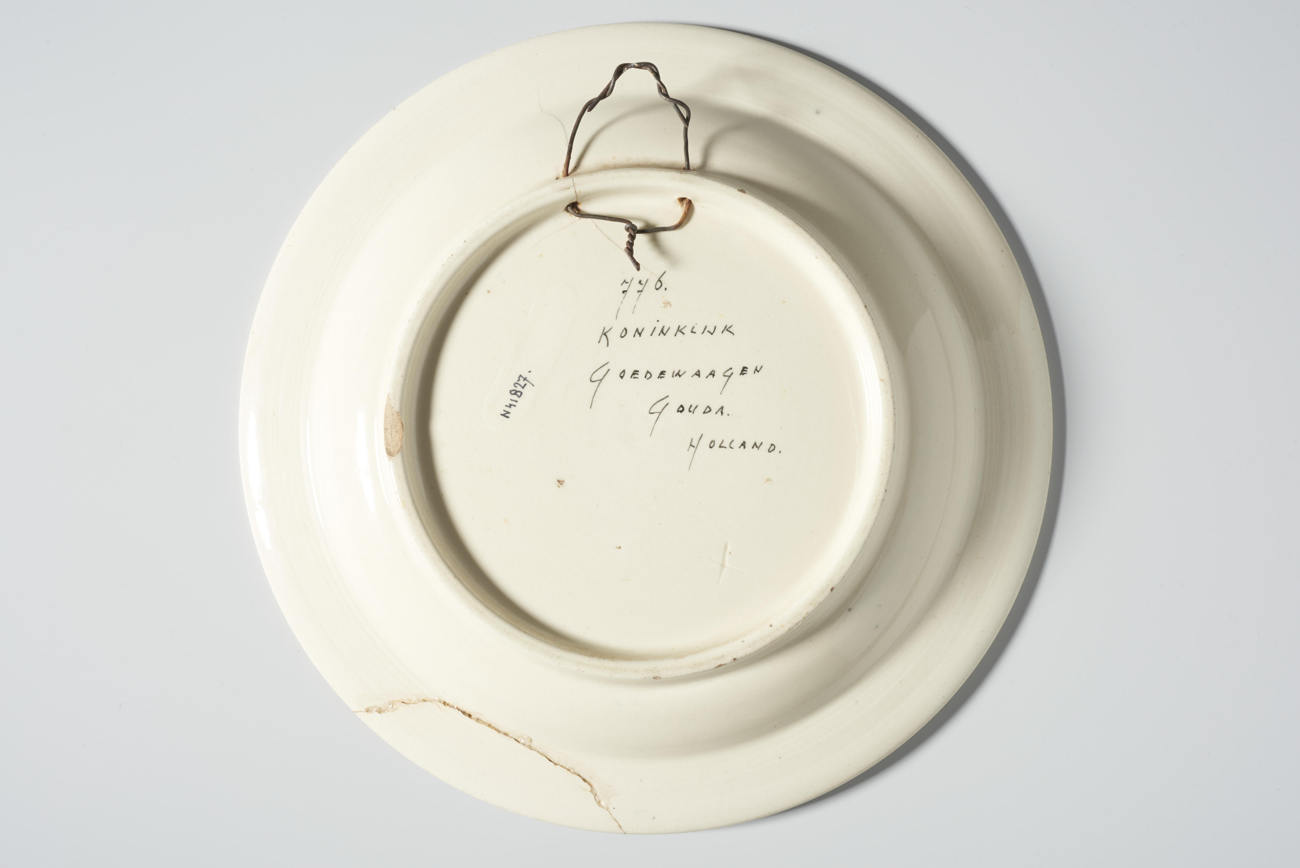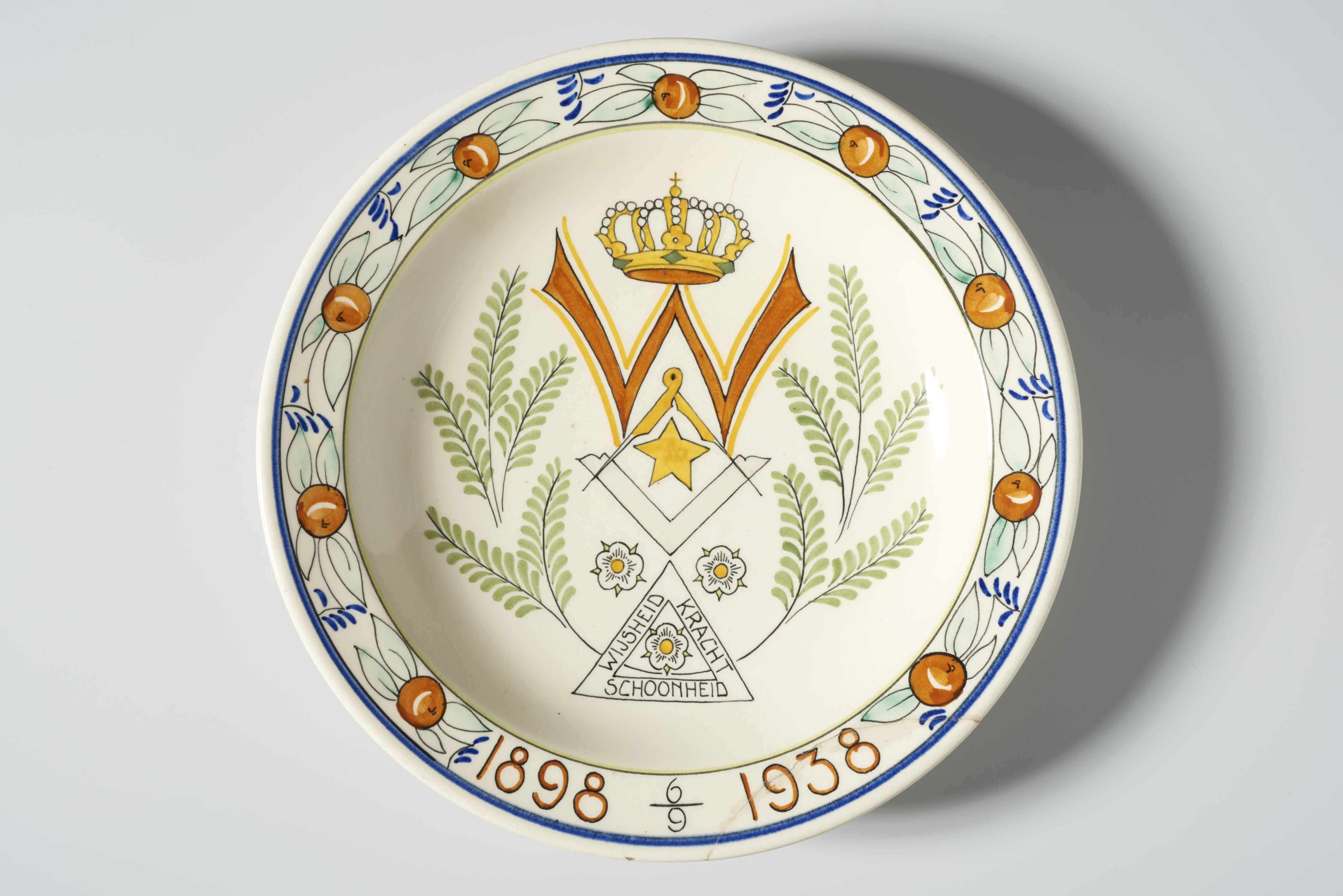 Gedenkbord, uitgebracht ter herinnering aan het veertigjarig jubileum van de inhuldiging van koningin Wilhelmina. In het midden van het bord staat een afbeelding van een gekroonde ‘W’ tussen varens. Onder de W is een ster in een fantasieruit afgebeeld, met daaronder bloemen en een driehoek met daarin de tekst: ‘WIJSHEID, KRACHT, SCHOONHEID’. De rand is ...