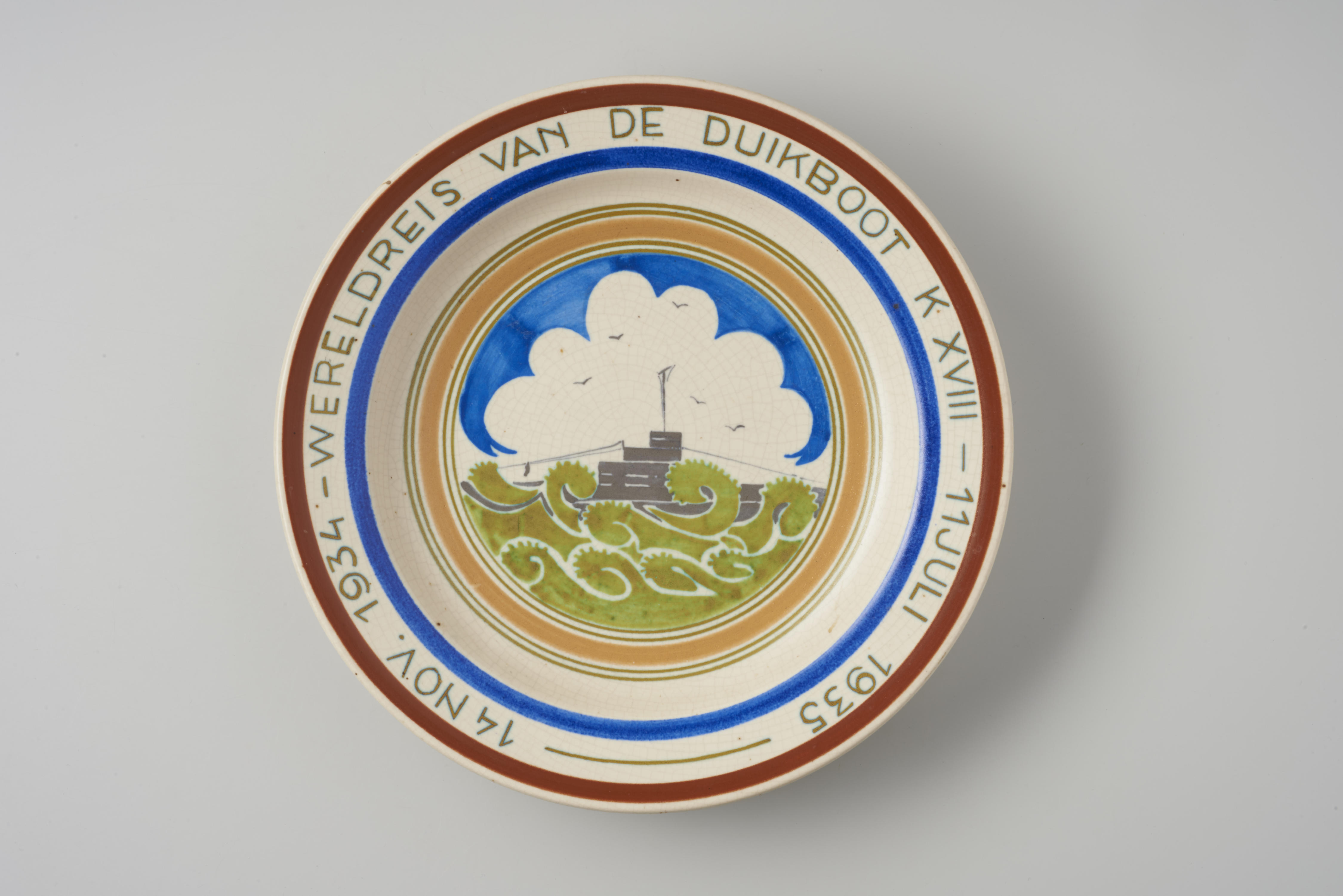 Gedenkbord, uitgebracht ter herinnering aan de wereldreis van de onderzeeboot K XVIII tussen 14 november 1934 en 11 juli 1935. In het midden van het bord is een duikboot in zee afgebeeld.