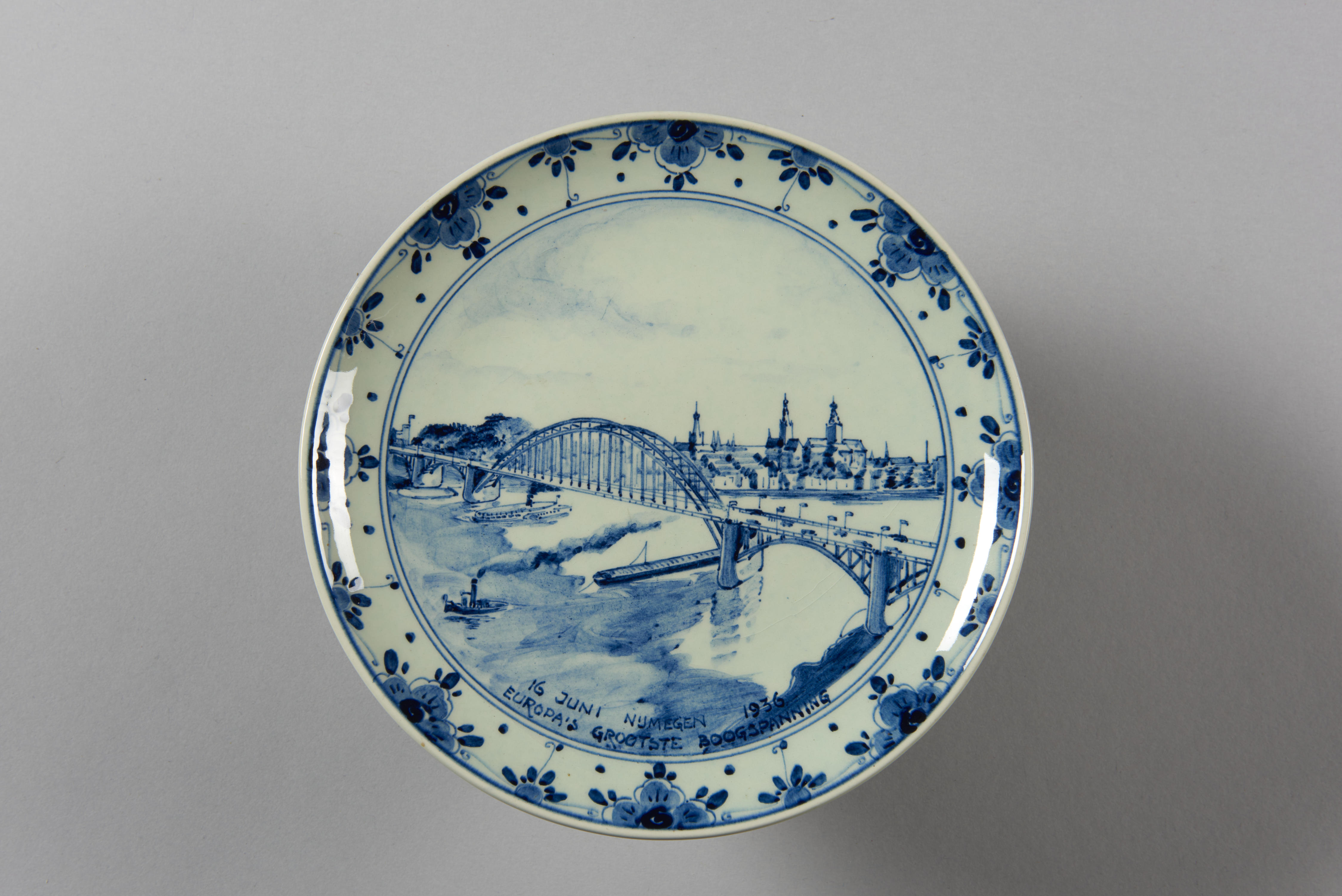 Blauw beschilderd gedenkbord, uitgebracht ter herinnering aan de opening van de Waalbrug in Nijmegen. Op het bord staat een afbeelding van de Waalbrug en de stad Nijmegen, met daaronder de tekst: ‘16 juni Nijmegen 1936 Europa’s grootste boogspanning.’ De rand van het bord is versierd met bloemen.