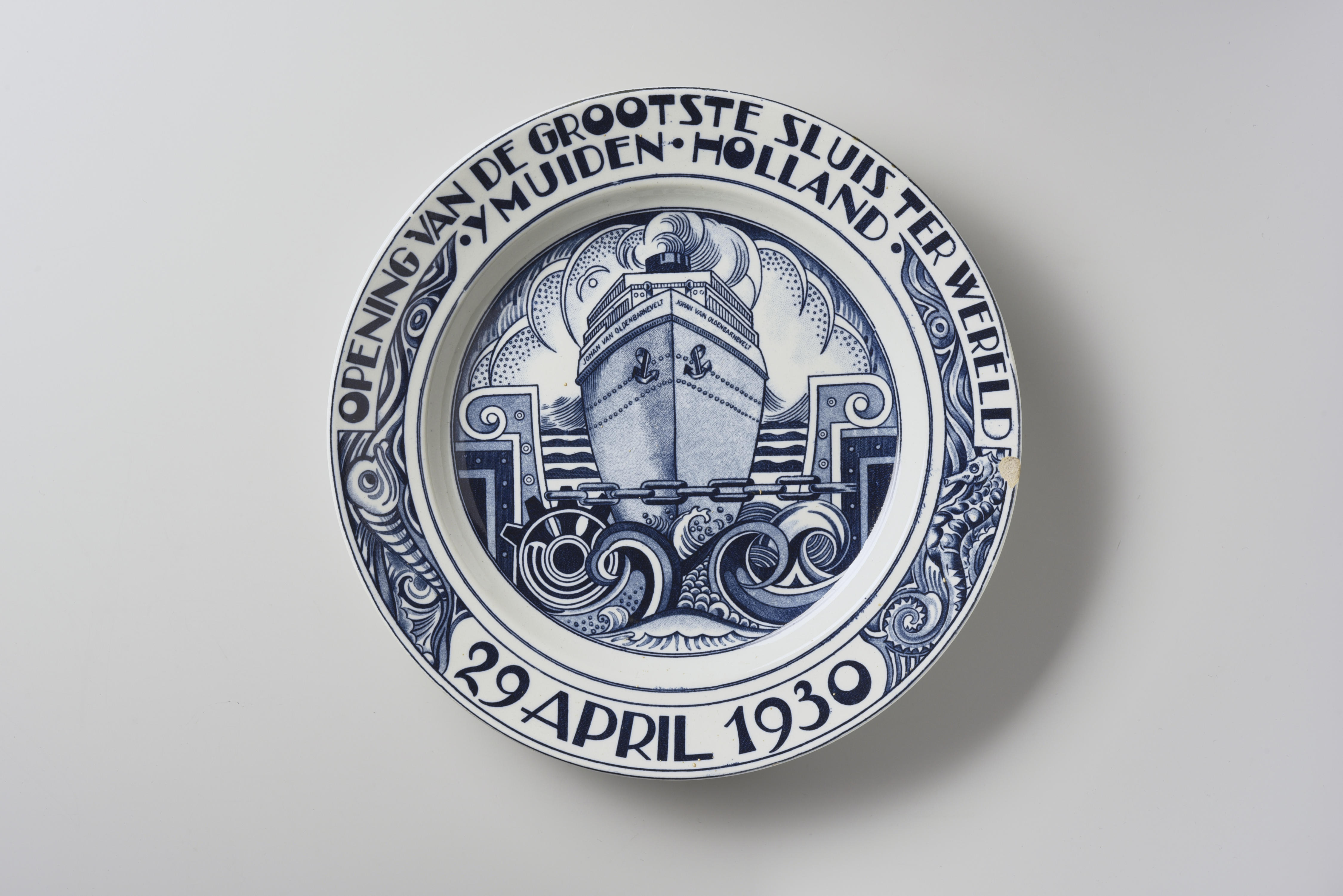 Gedenkbord, uitgebracht ter herinnering aan de opening van de Noordersluis in IJmuiden. Op het bord is een afbeelding te zien van een groot schip dat door de sluis vaart. Op de versierde rand van het bord staat de tekst: ‘OPENING VAN DE GROOTSTE SLUIS TER WERELD-YMUIDEN-HOLLAND 29 APRIL 1930’.
