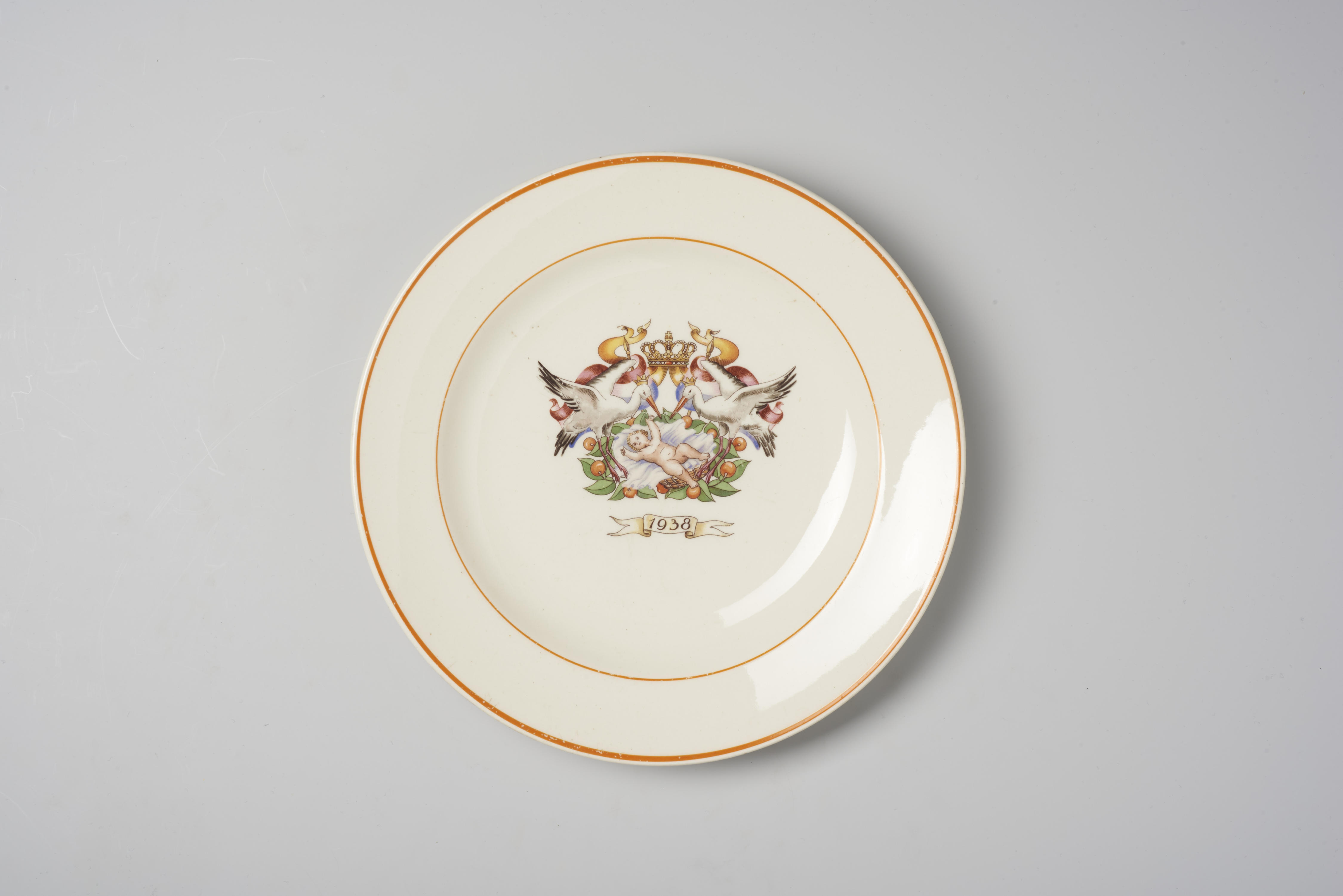 Gedenkbord ter herinnering aan de geboorte van prinses Beatrix in 1938. De afbeelding op het bord is van een baby in een mand met daaromheen een krans van oranjeappels. Aan weerszijden van de mand is een ooievaar en een rood-wit-blauwe vlag met een oranje wimpel afgebeeld. Daarboven is een kroon te zien. Onder de mand ...