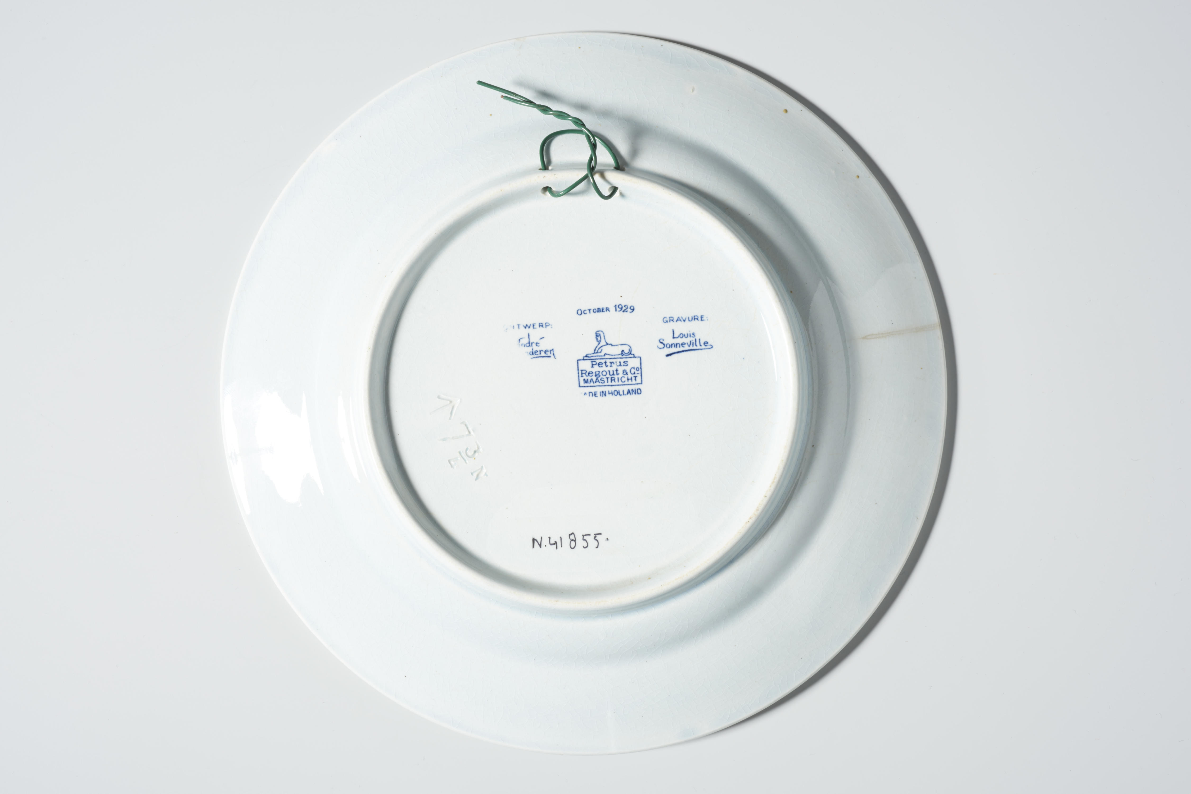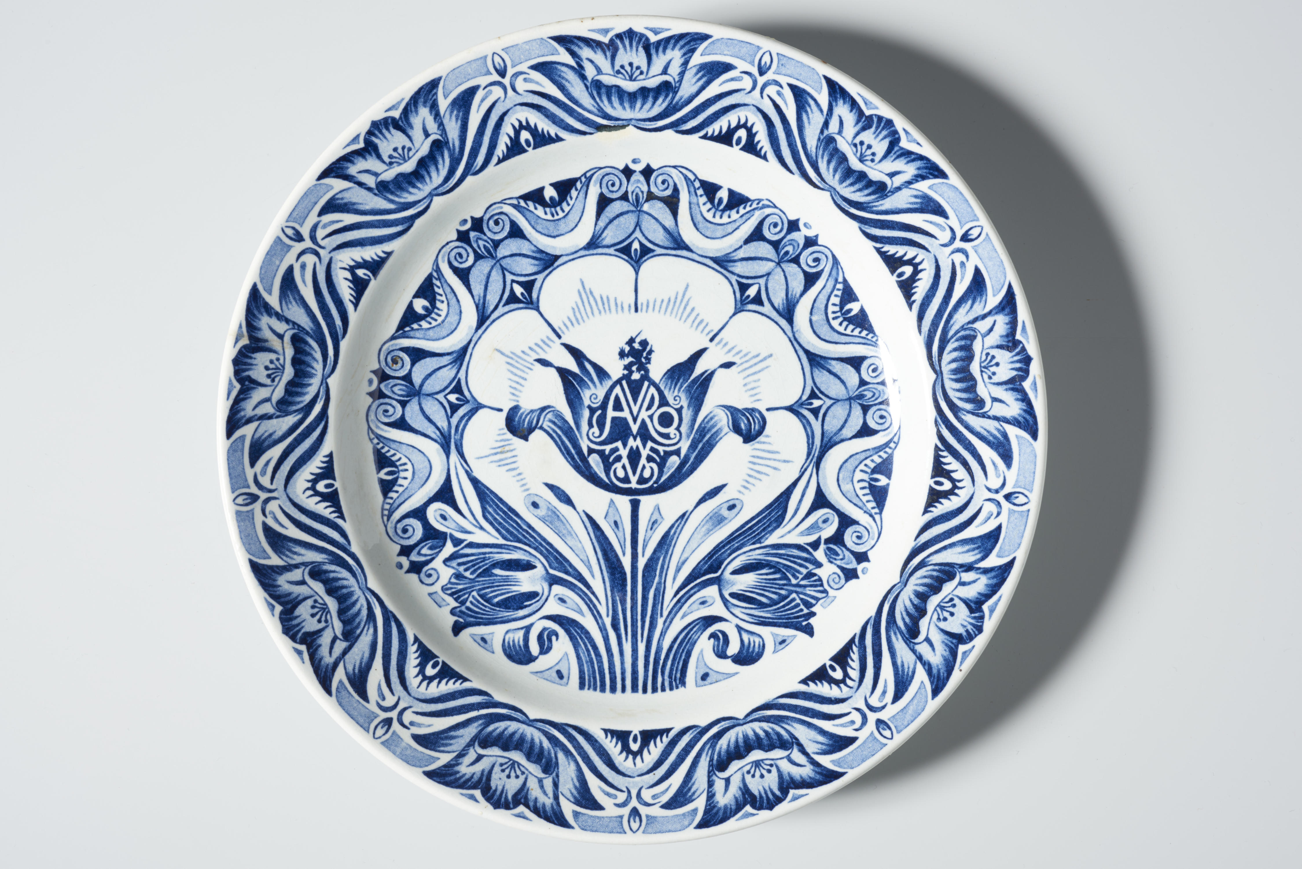Blauw bedrukt gedenkbord, gemaakt voor de omroep AVRO in 1929. In het midden van het bord zijn drie tulpen afgebeeld. Op de middelste tulp staan de letters ‘AVRO’. Boven deze tulp is een Nederlandse leeuw te zien. De rand van het bord is versierd met bloemmotieven.