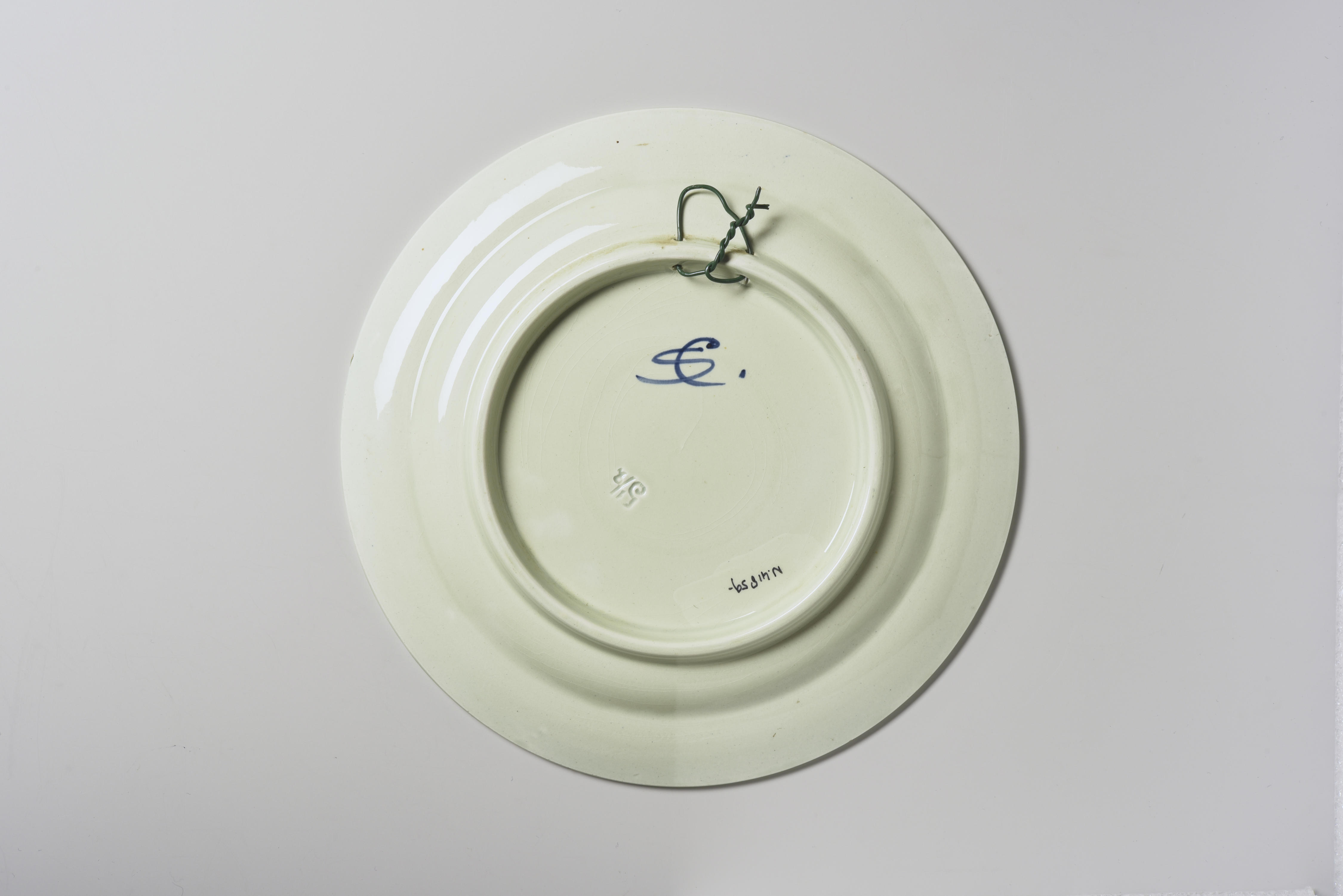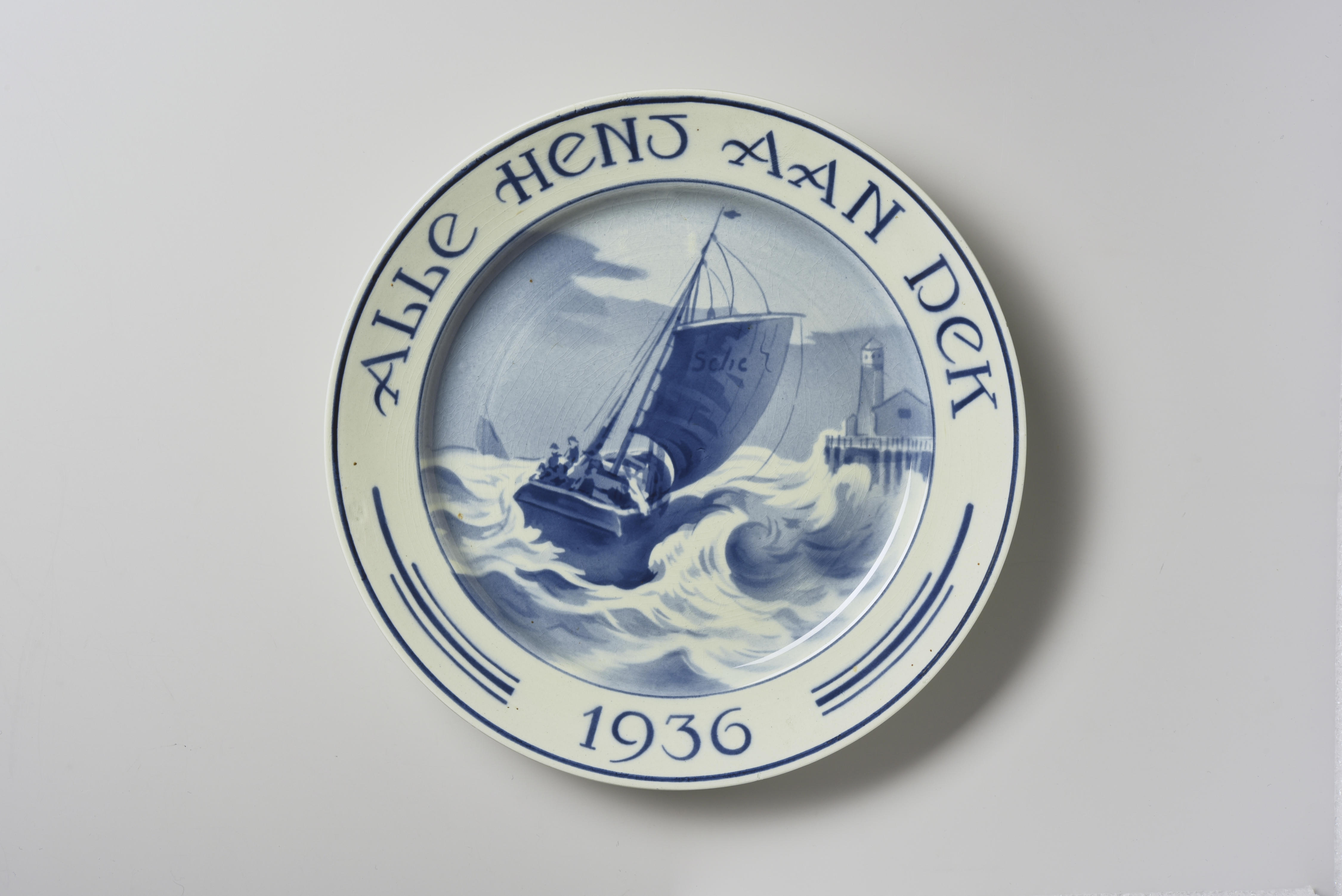 Gedenkbord met een afbeelding van een zeilschip in een woelige zee. Op de rand staat de tekst: ‘ALLE HENS AAN DEK 1936’.