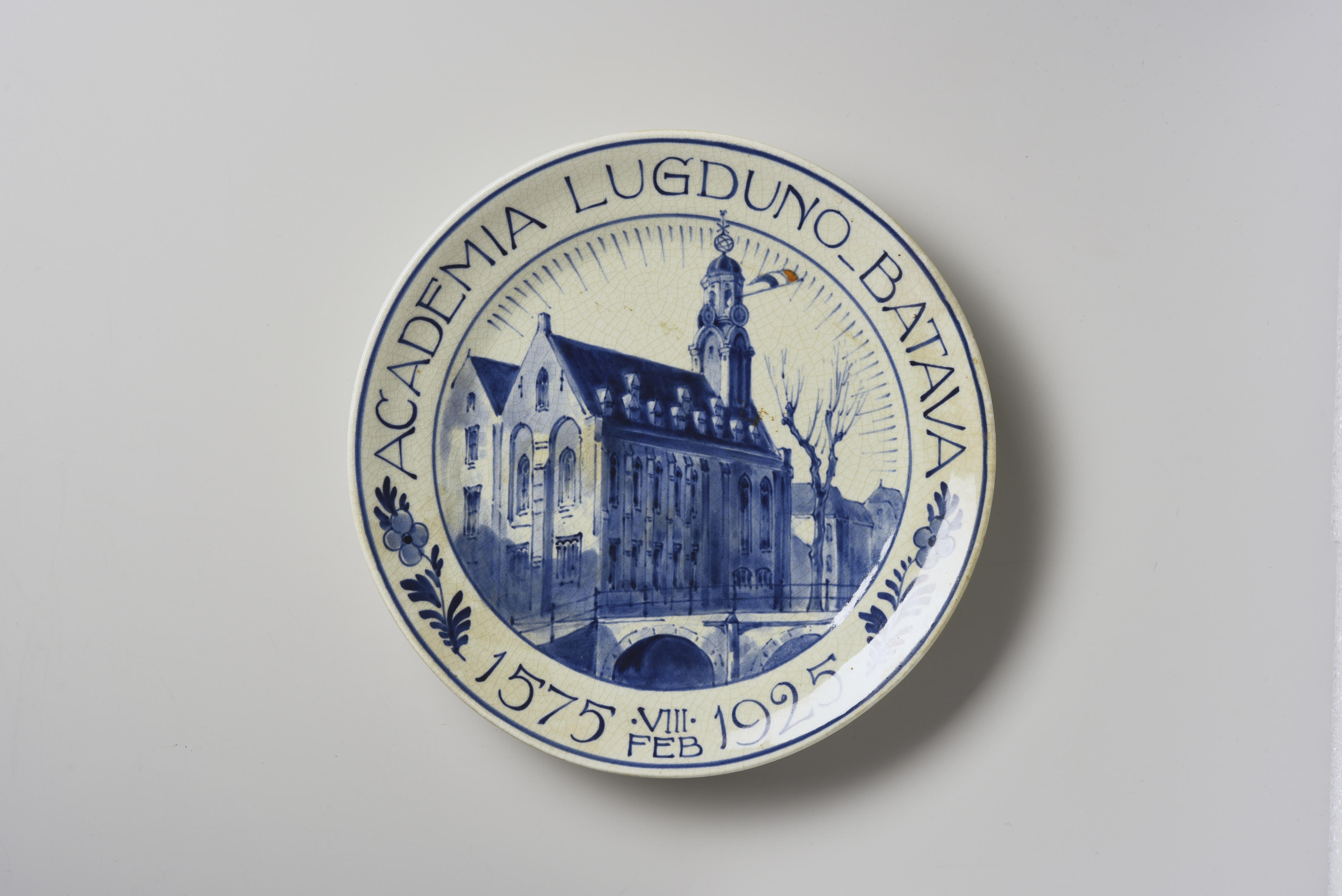 Gedenkbord, uitgegeven ter gelegenheid van het 350-jarig bestaan van de Universiteit van Leiden. In het midden van het bord is een afbeelding van het Academiegebouw van de universiteit te zien. Op de rand van het bord staat de tekst: ‘Academia Lugduno Batava 1575 - VIII Feb – 1925’. De rand is verder versierd met twee ...