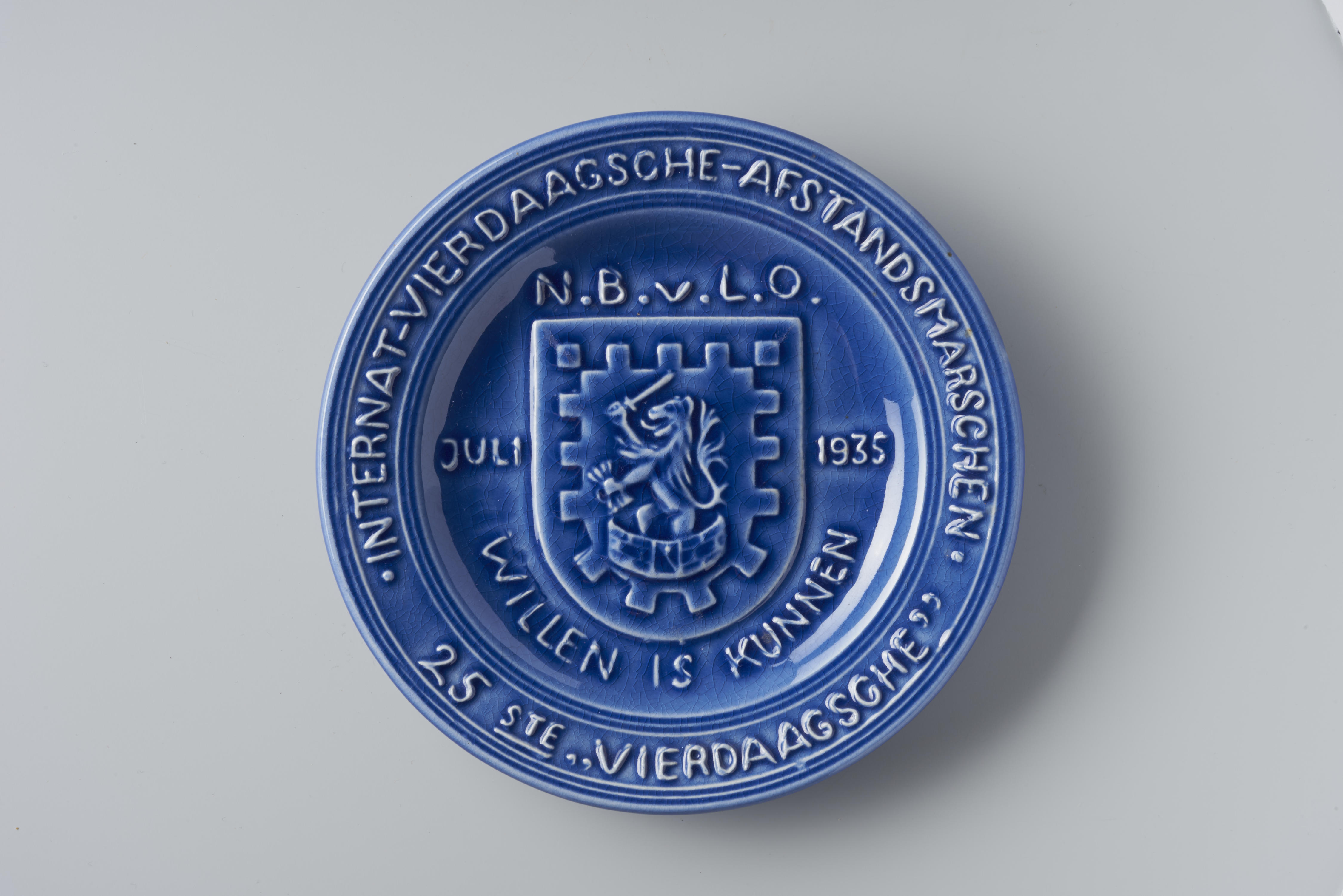 Gedenkbordje, uitgegeven door de Nederlandse Bond voor Lichamelijke Opvoeding ter gelegenheid van de Vierdaagse in 1935. In het midden van het bord is een wapen met een Nederlandse leeuw afgebeeld. Rondom het wapen staat de tekst: ‘N.B.v.L.O. Juli 1935 Willen is Kunnen.’ Op de rand staat de tekst: ‘Internat-Vierdaagsch-Afstandsmarschen 25ste Vierdaagsche’. Op de achterzijde van ...