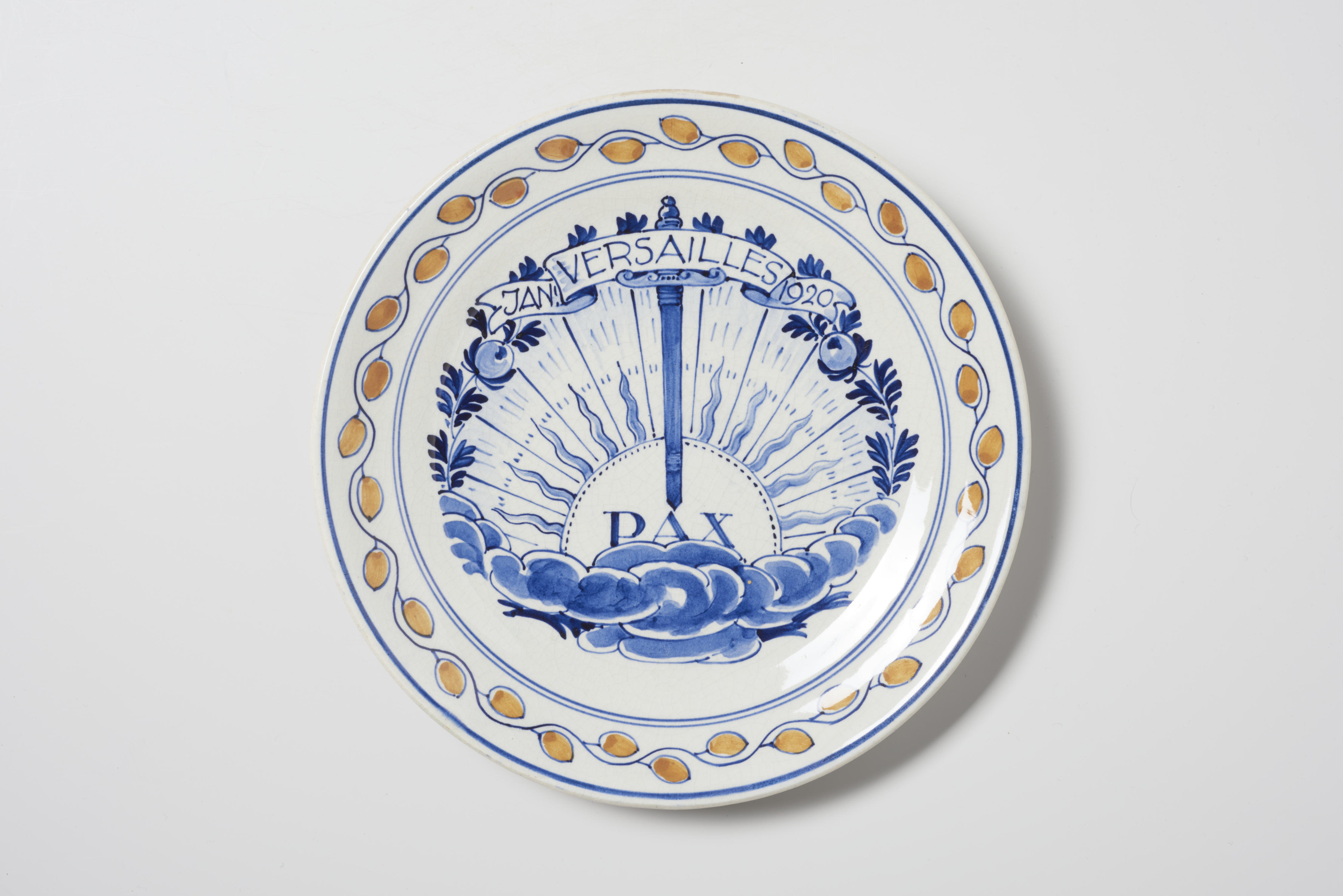 Gedenkbord van aardewerk, uitgegeven vanwege het in werking treden van het Verdrag van Versailles in januari 1920. De rand van het bord is versierd met oranje blaadjes en in het midden van het bord staat een stralende zon met een zwaard afgebeeld. Het opschrift luidt: ‘JAN VERSAILLES 1920 PAX’. De ondertekening van het Verdrag van ...