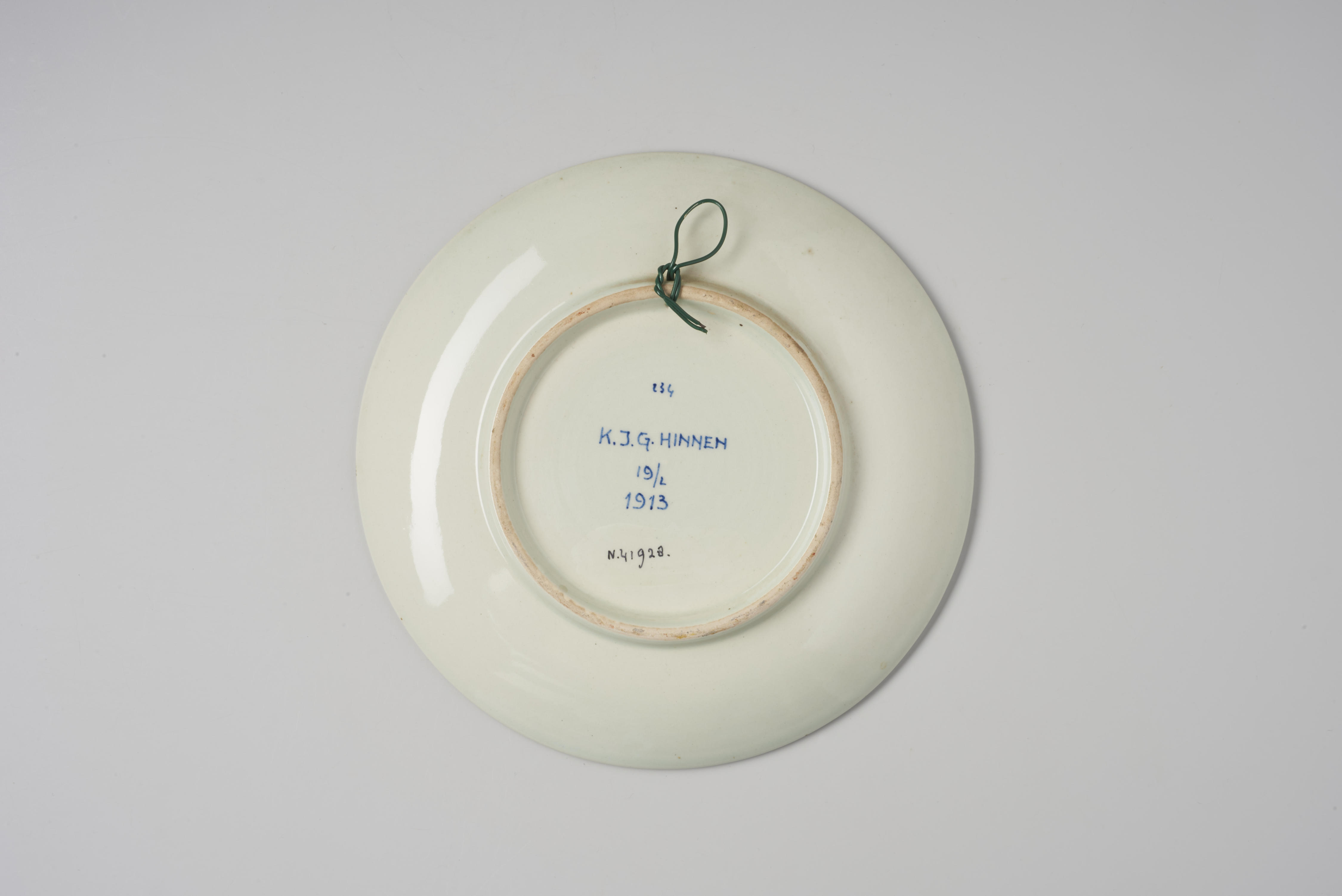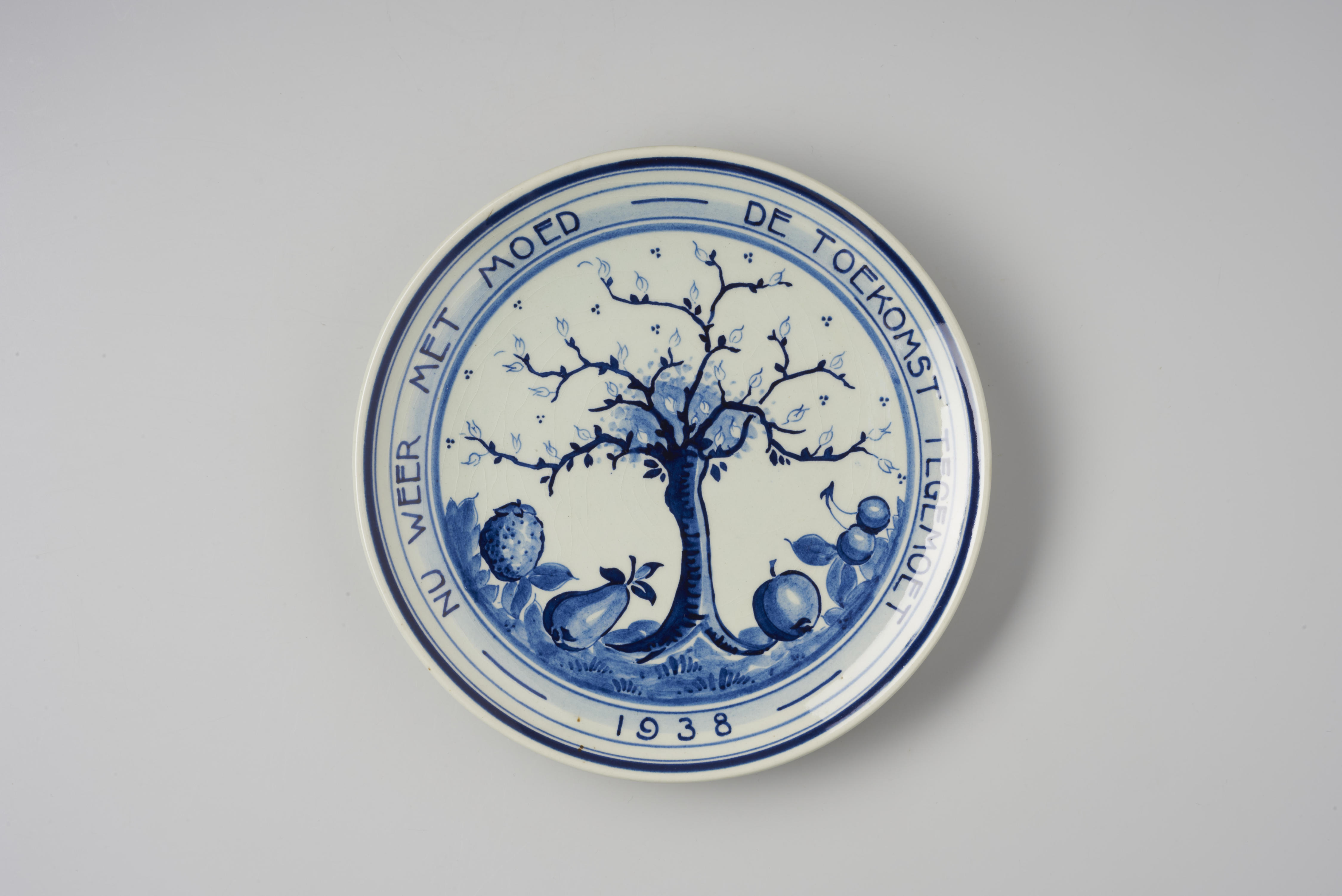 Herinneringsbord met een afbeelding van een boom met kleine blaadjes. Op de grond liggen een appel, een peer en kersen. Gedurende de crisisjaren 1931-1937 bracht de Porceleyne Fles zeven borden uit in de zogenaamde ‘crisisserie’ met de randtekst: 'Nu weer met moed de toekomst tegemoet'. Dit bord is gemaakt in 1938. Vermoedelijk is het door ...
