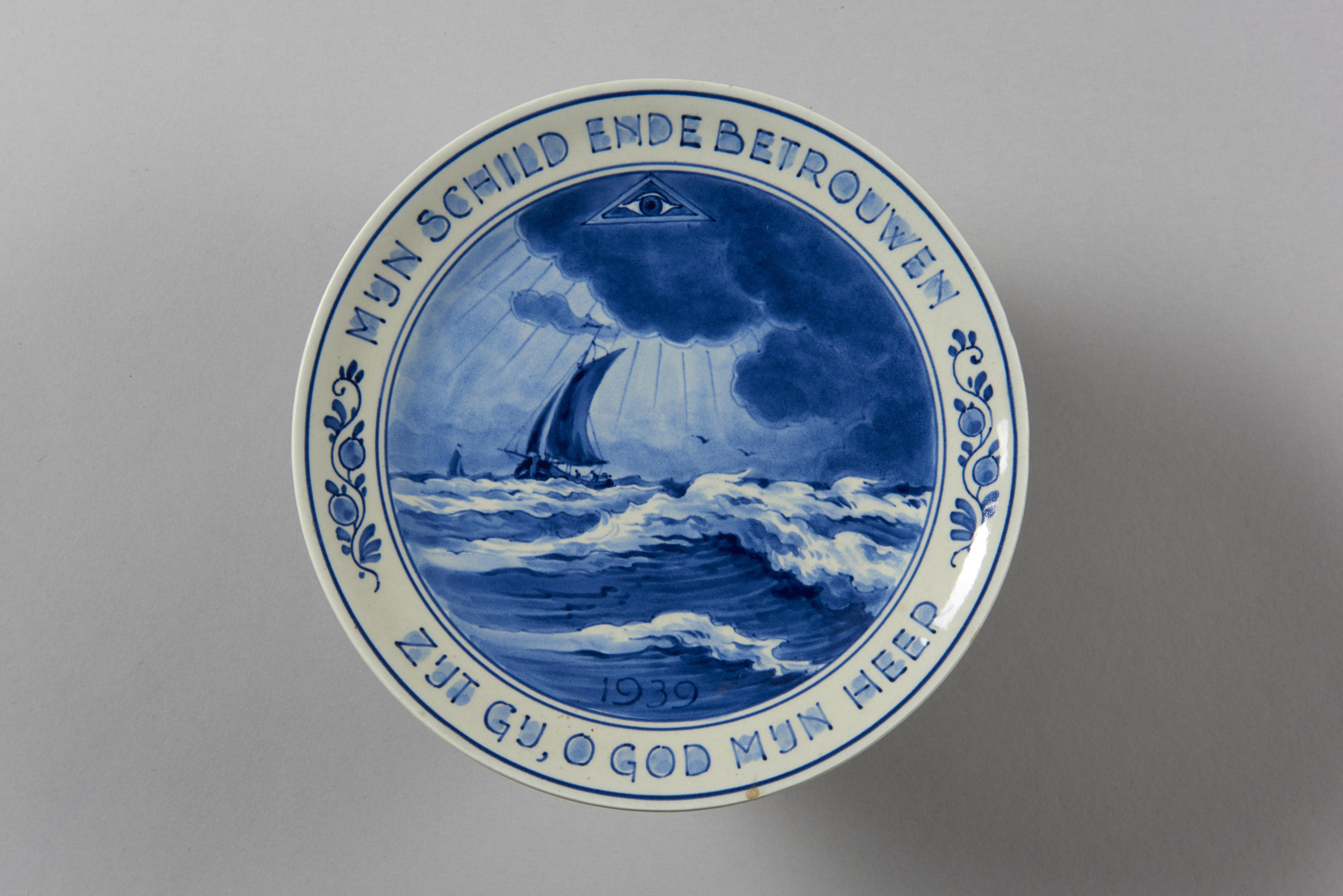 Gedenkbord, uitgebracht tijdens de dreiging van het uitbreken van de Tweede Wereldoorlog in 1939. Op het bord staat een afbeelding van een schip op een woeste zee. In de donkere wolken boven het schip is het Alziend oog afgebeeld. Op de rand van het bord staat de tekst: ‘Mijn schild ende betrouwen zijt Gij, o ...