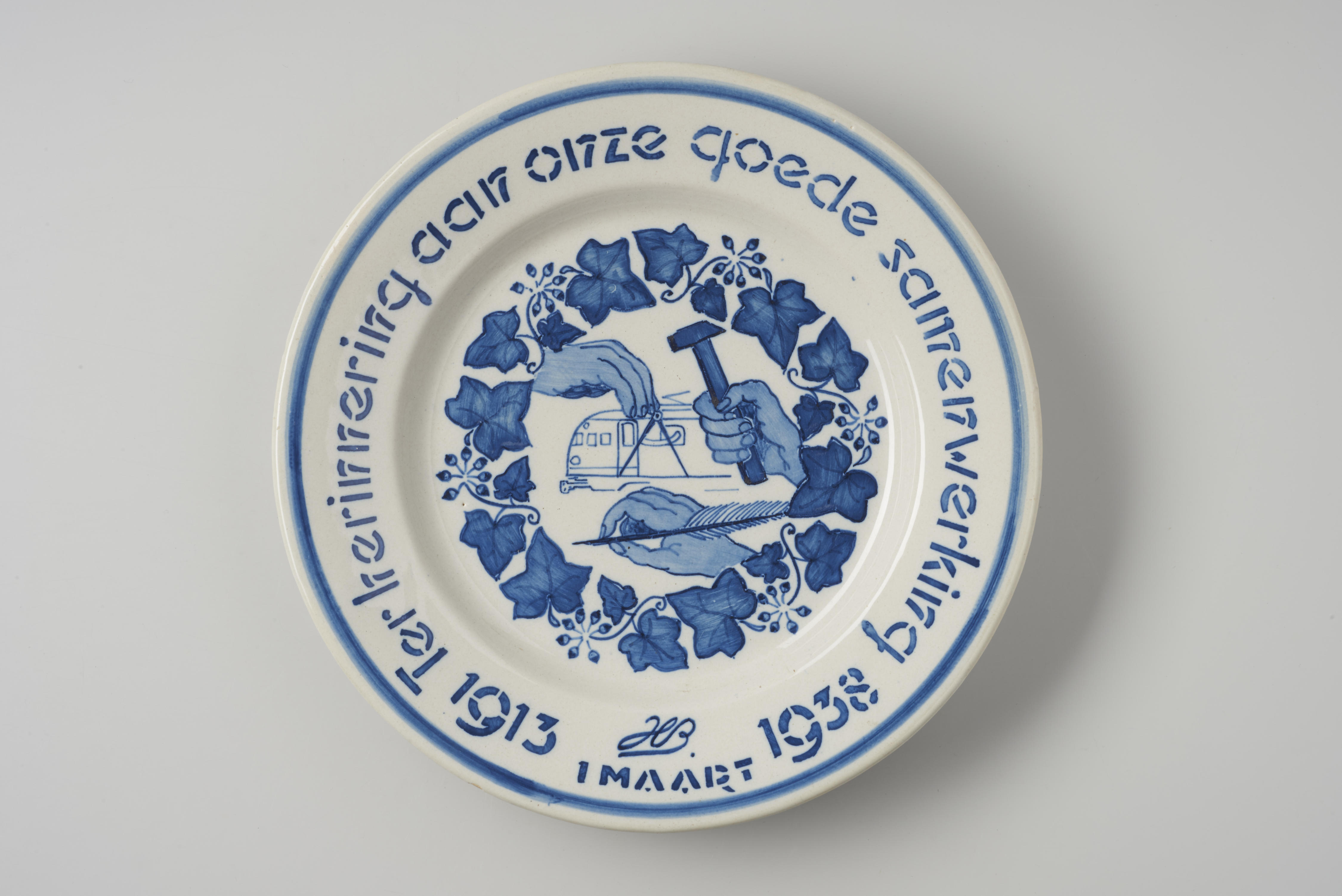 Gedenkbord met afbeeldingen van een hand met een passer, een hand met een schrijfveer en een hand met een hamer. Op de achtergrond is een trein te zien. Rondom de afbeeldingen is een klimopkrans afgebeeld. Op de rand van het bord staat de tekst: ‘Ter herinnering aan onze goede samenwerking 1913 – 1 maart – ...