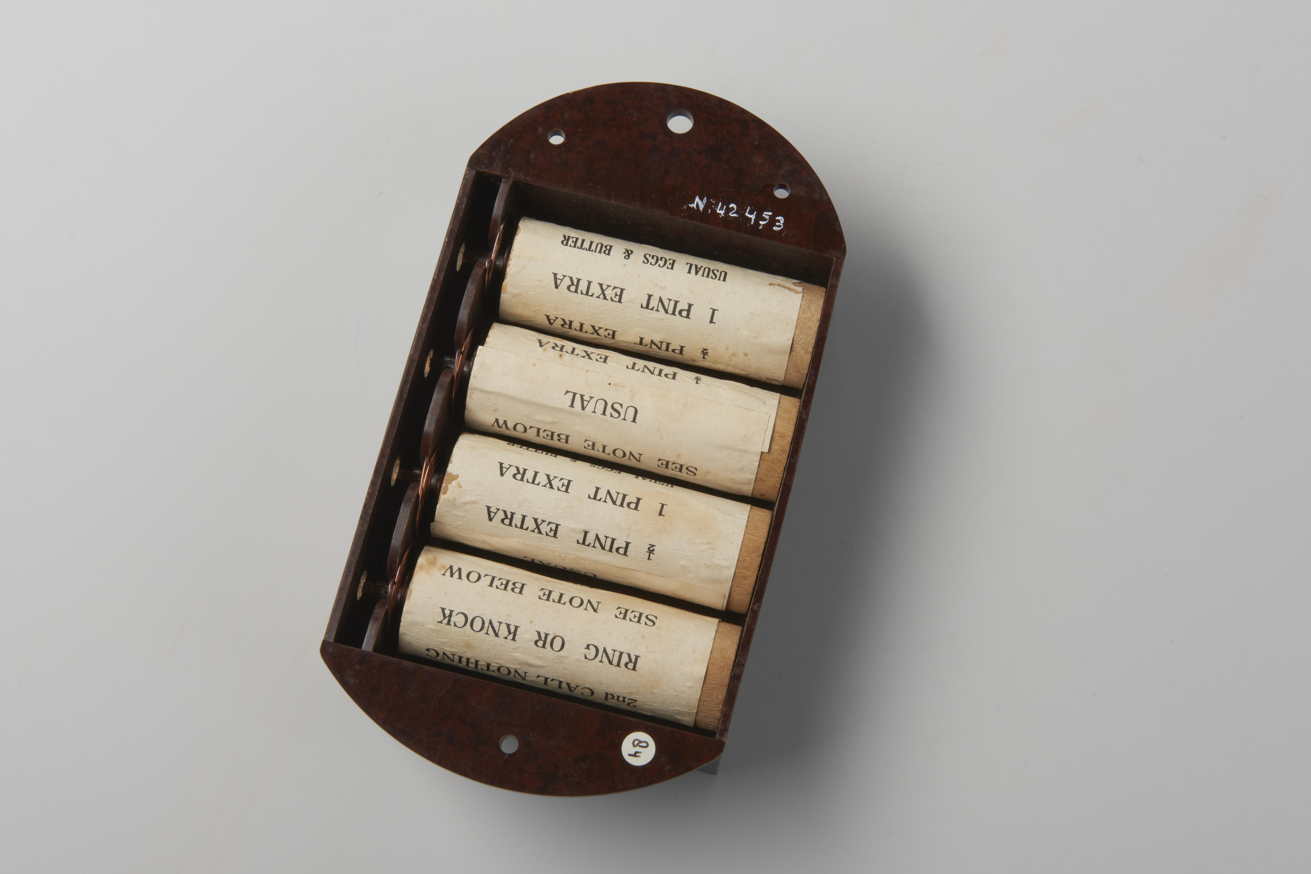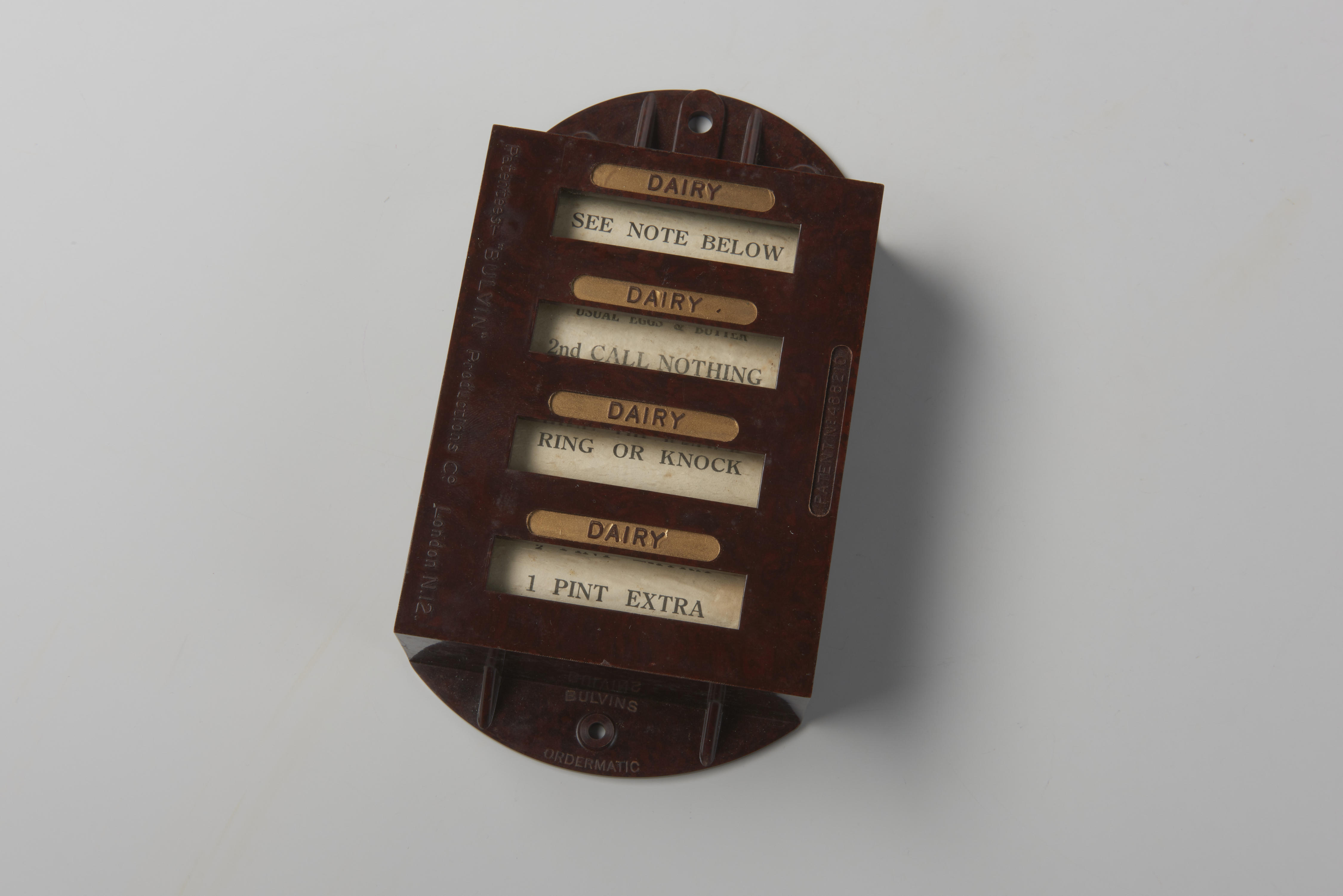 Geautomatiseerd boodschappenbriefje voor de melkman, zogenoemde Ordermatic. Het apparaat is gemaakt door Bulvins in Londen, Engeland.