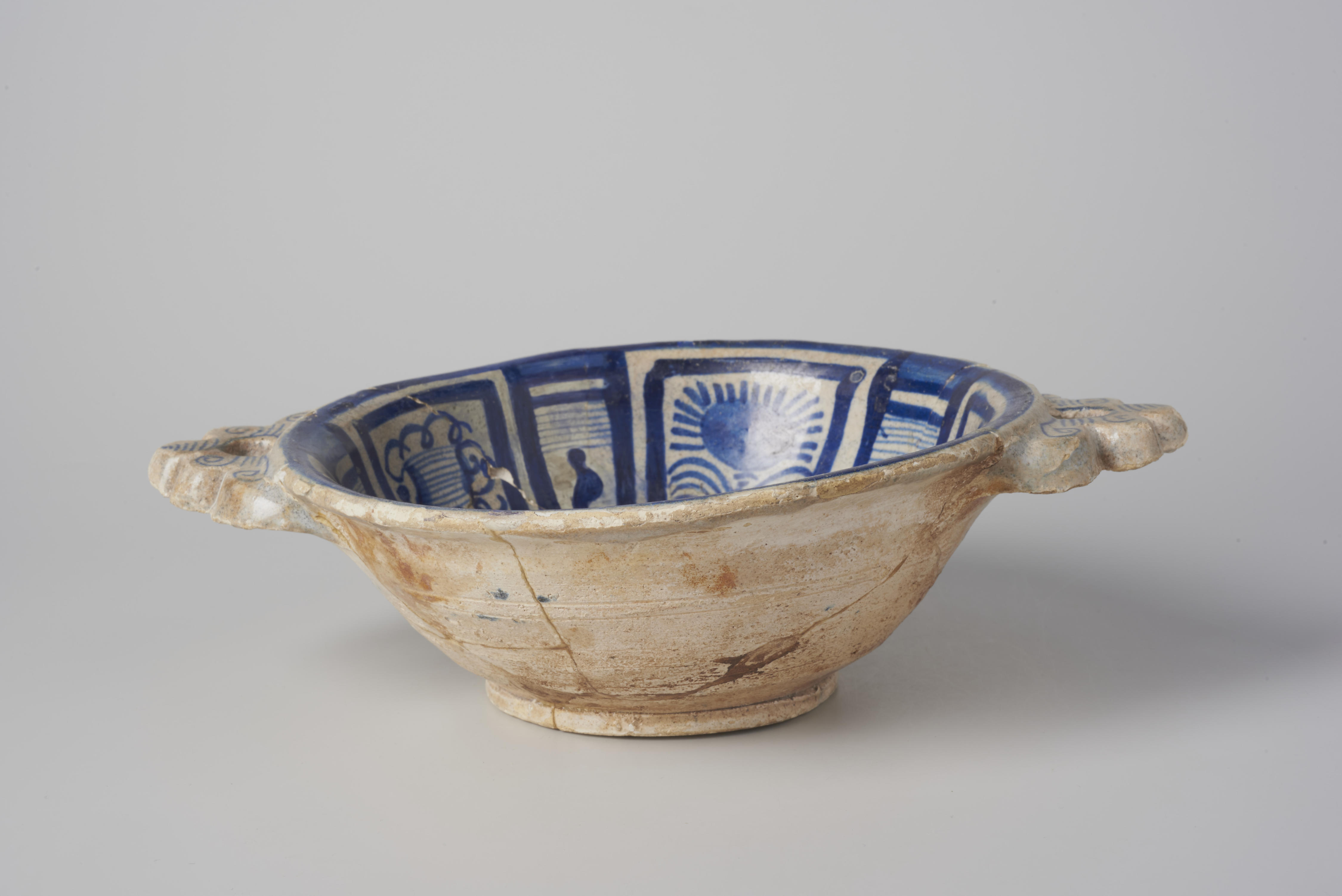 Papkom, bodemvondst in een beerput aan de Tuindwarsstraat in Amsterdam. De kom heeft een randversiering van een vereenvoudigd, gecompartimenteerd kraakporseleinmotief. Op het middenvlak is een vogel in een tuin met bloeiende planten afgebeeld. De versiering op de papkom is overgenomen van die op het Chinese kraakporselein uit de late Wanli-periode, 1600-1625.