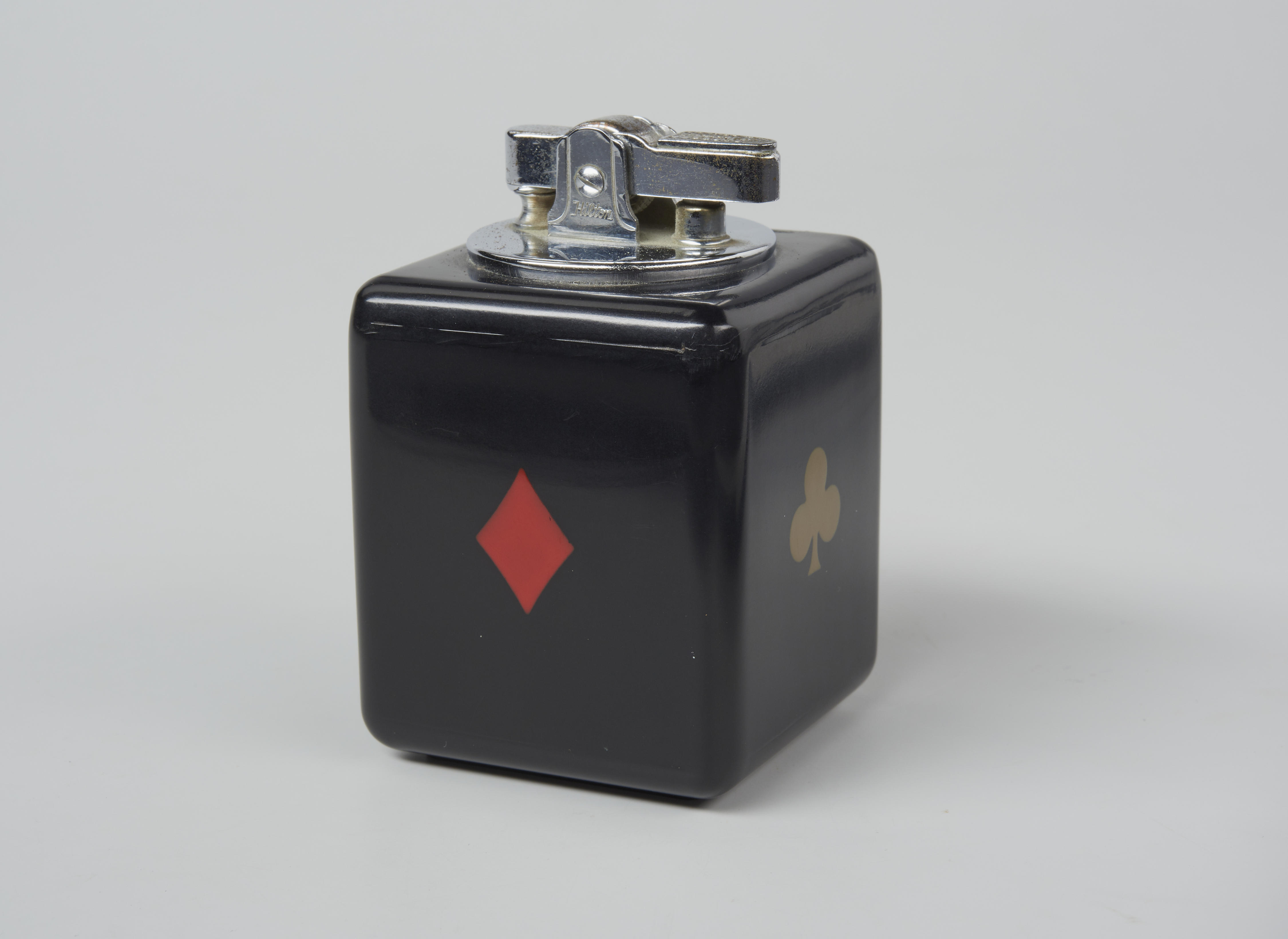 Aansteker met op de zijkanten afbeeldingen van harten, schoppen, ruiten en klaver. De aansteker is gemaakt door Hilton.
