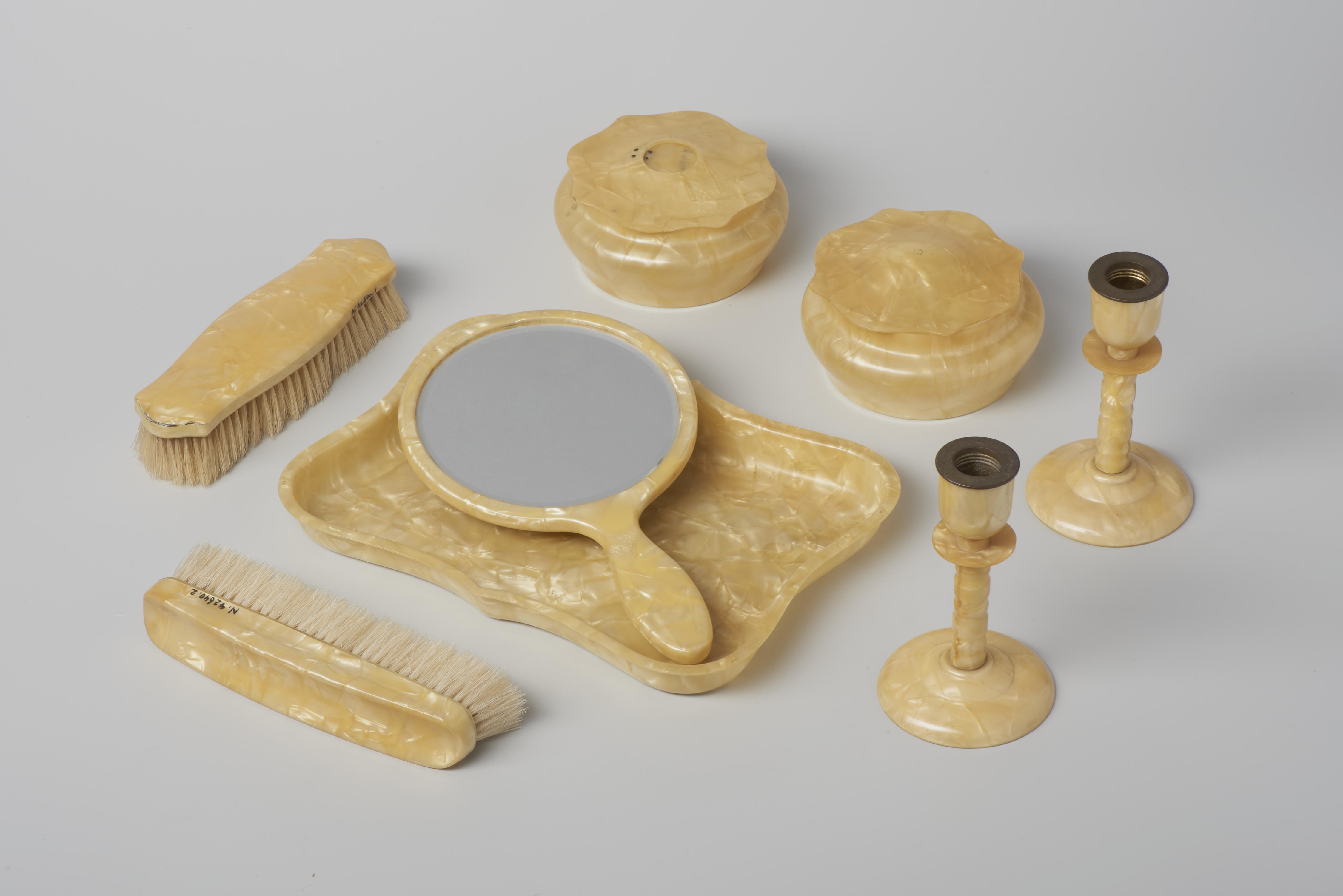 Achtdelige toiletset, bestaande uit een dienblad, twee kandelaars, een handspiegel, een kledingborstel, een schoenenborstel en twee dozen.
