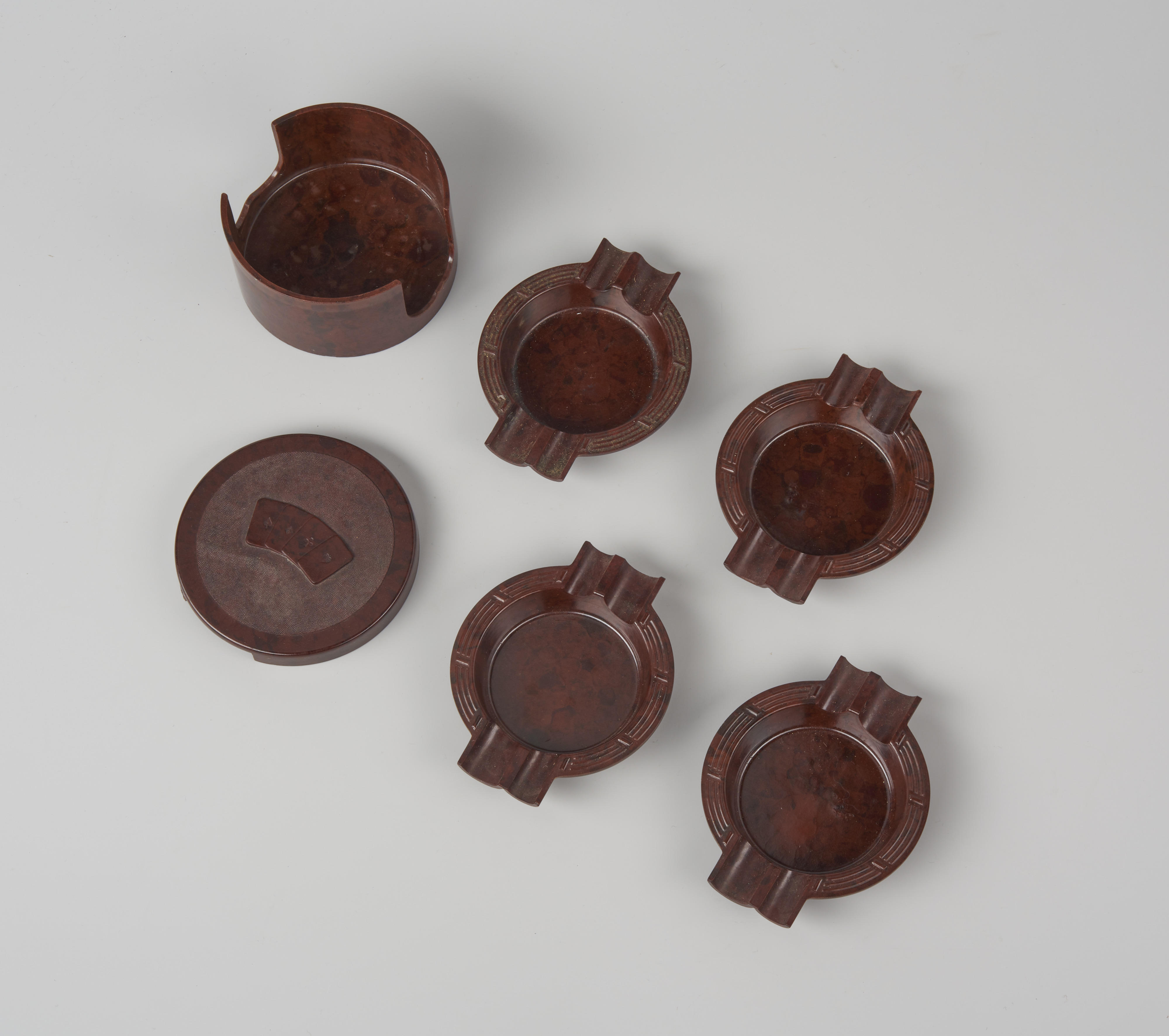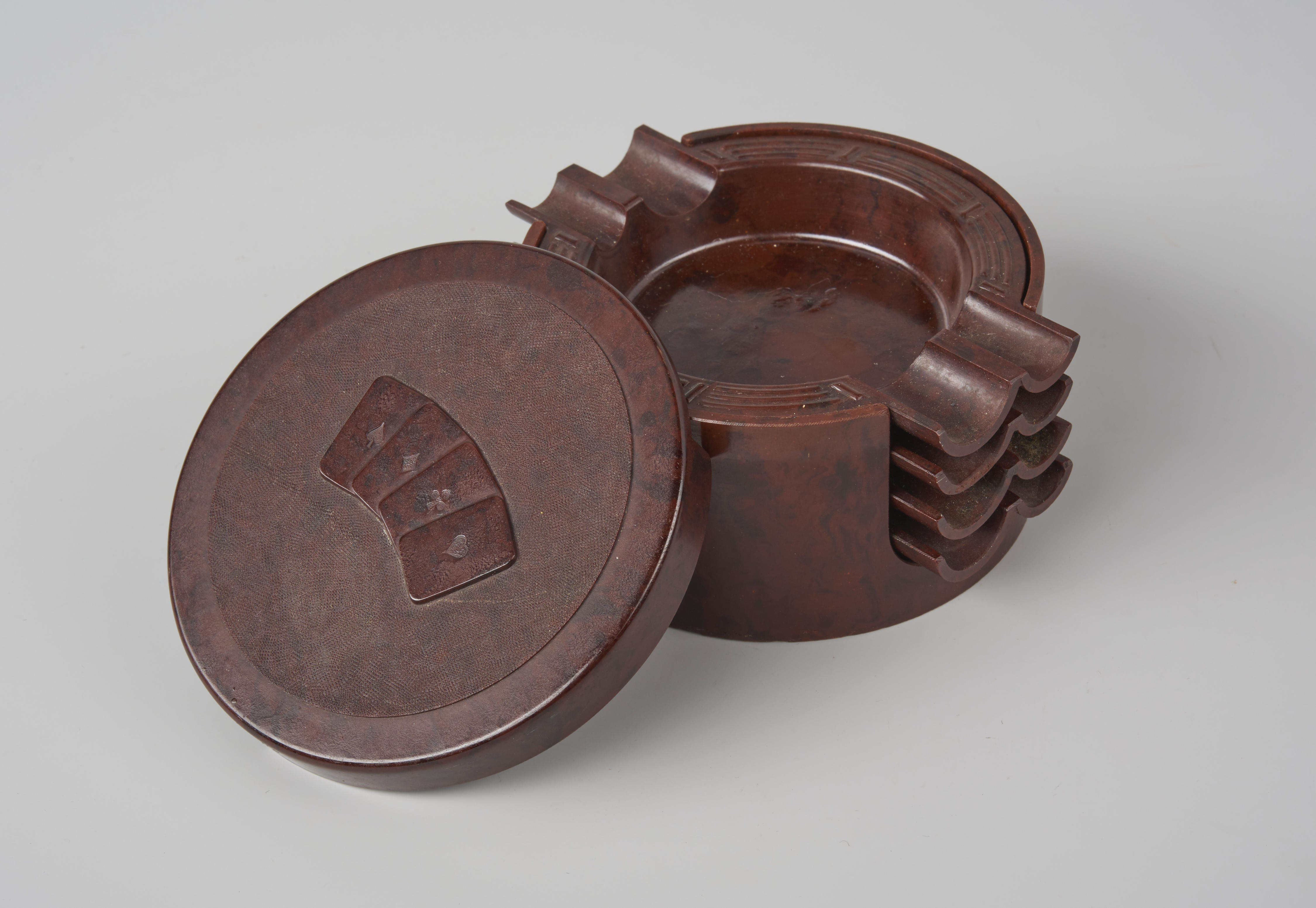 Bakelieten asbakkenset, bestaande uit vier asbakken in een houder, gemaakt in Tsjechoslowakije. Op het deksel staan vier speelkaarten afgebeeld.