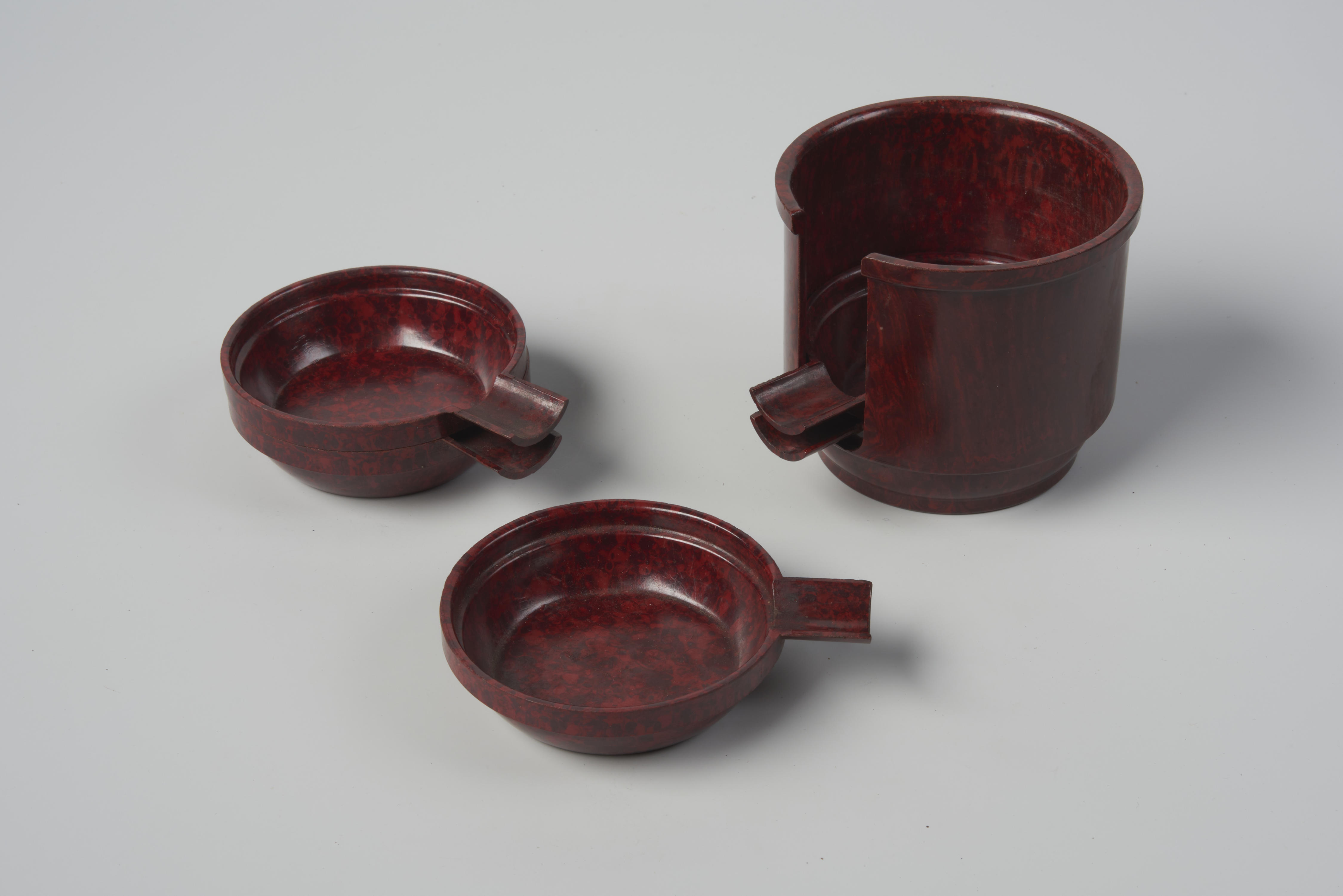 Bakelieten asbakkenset of pindastel, bestaande uit vijf onderzetters in een houder.