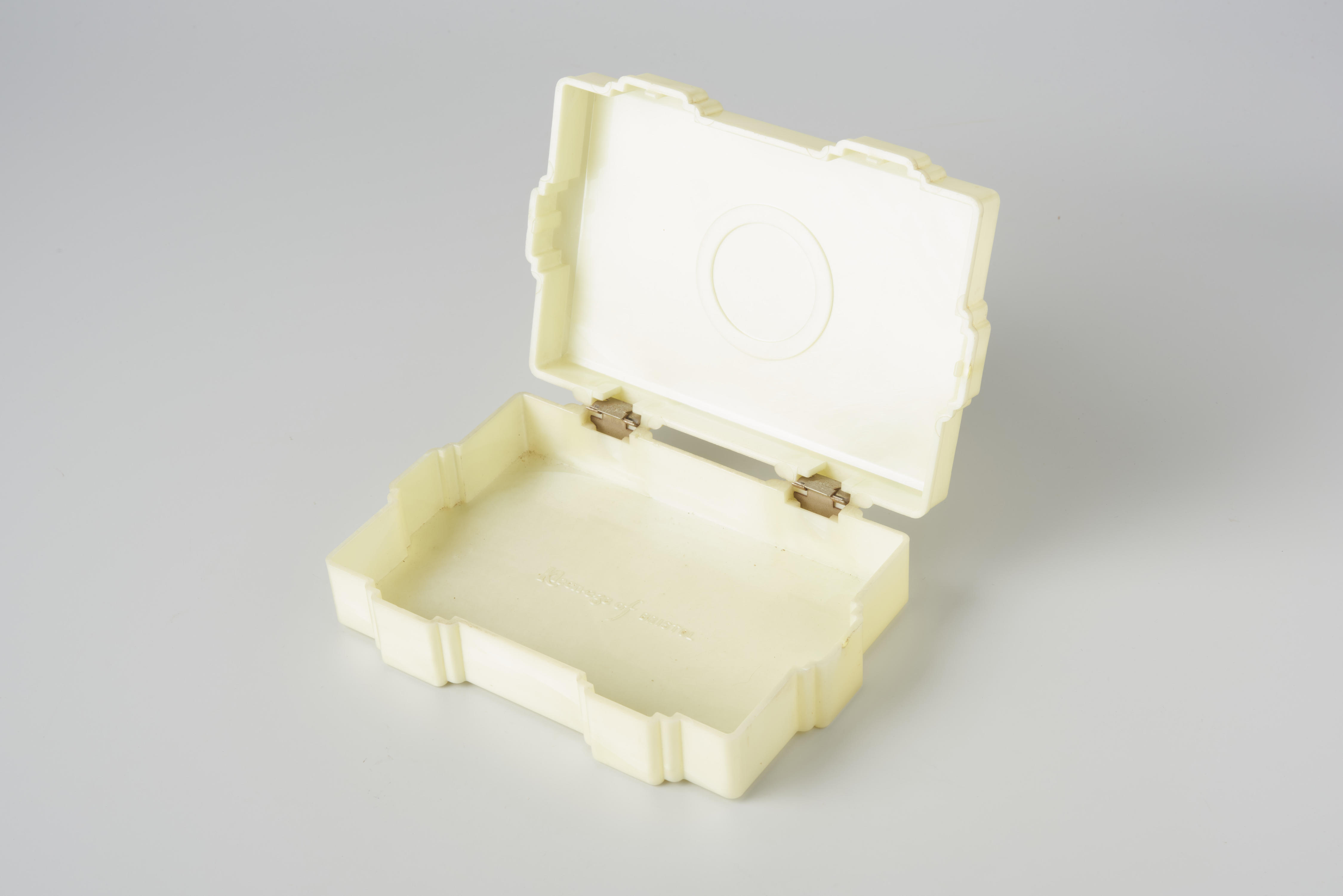 Toiletdoosje van imitatieparelmoer met een vrouwenhoofd als goudkleurig medaillon op het deksel. Op de bodem van het doosje staat de tekst: 'Kleen-ege of Bristol'. Het doosje is gemaakt in Engeland.