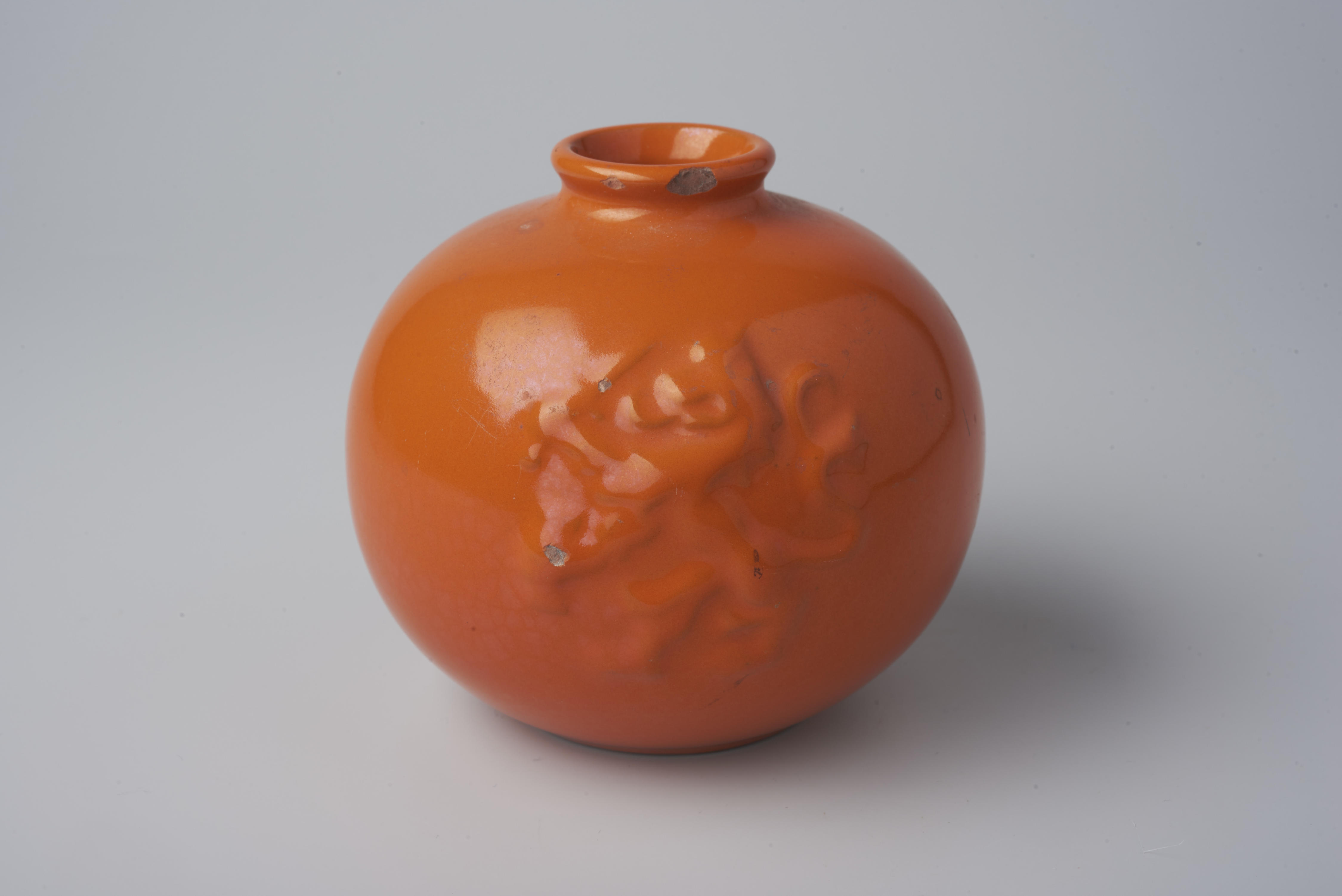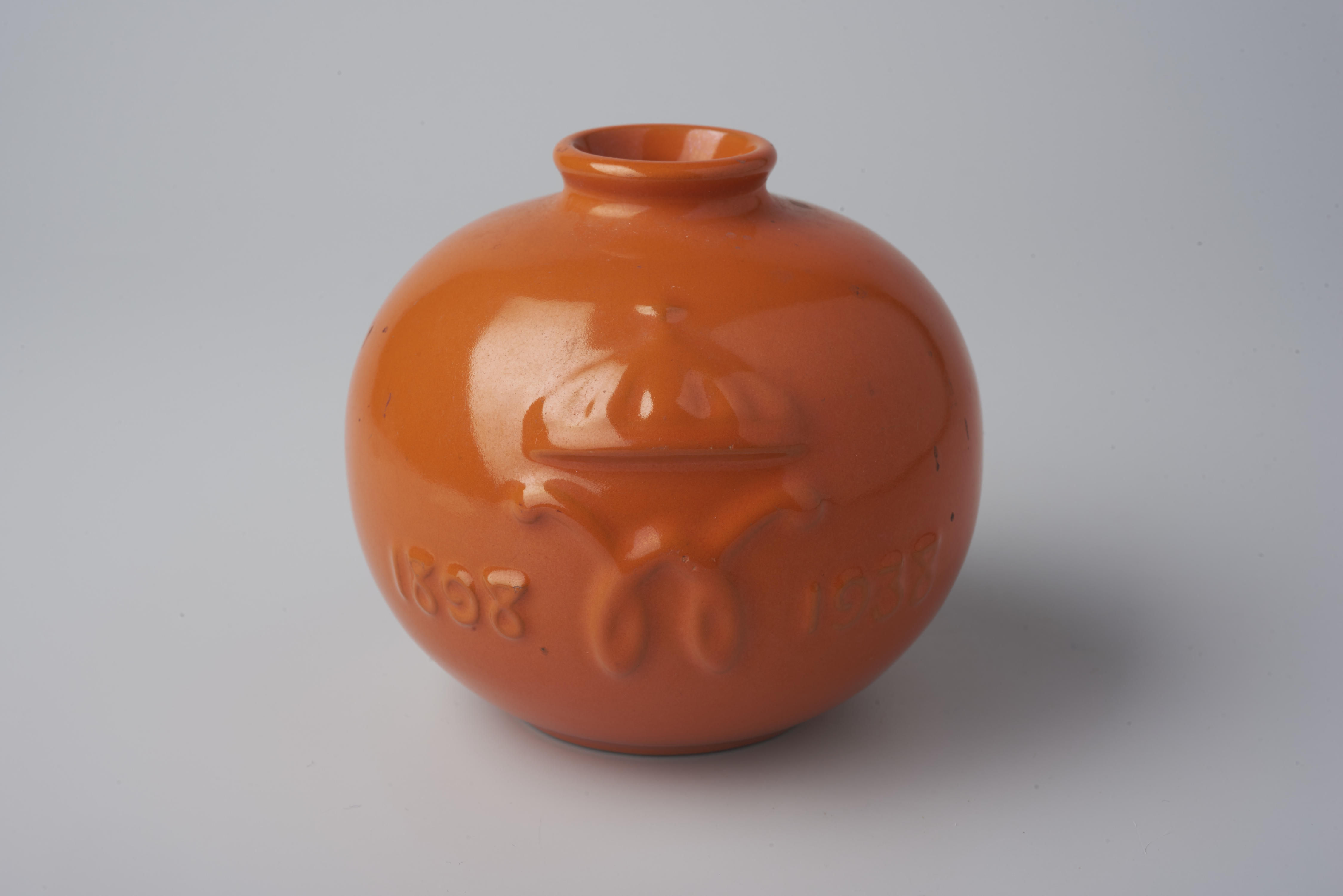 Oranje geglazuurde aardewerken vaas met aan de voorzijde in reliëf een gekroonde letter W tussen de jaartallen 1898 en 1938 en aan de achterzijde in reliëf een voorstelling van de Nederlandse leeuw. De vaas is vervaardigd ter gelegenheid van het veertigjarig regeringsjubileum van koningin Wilhelmina in 1938.