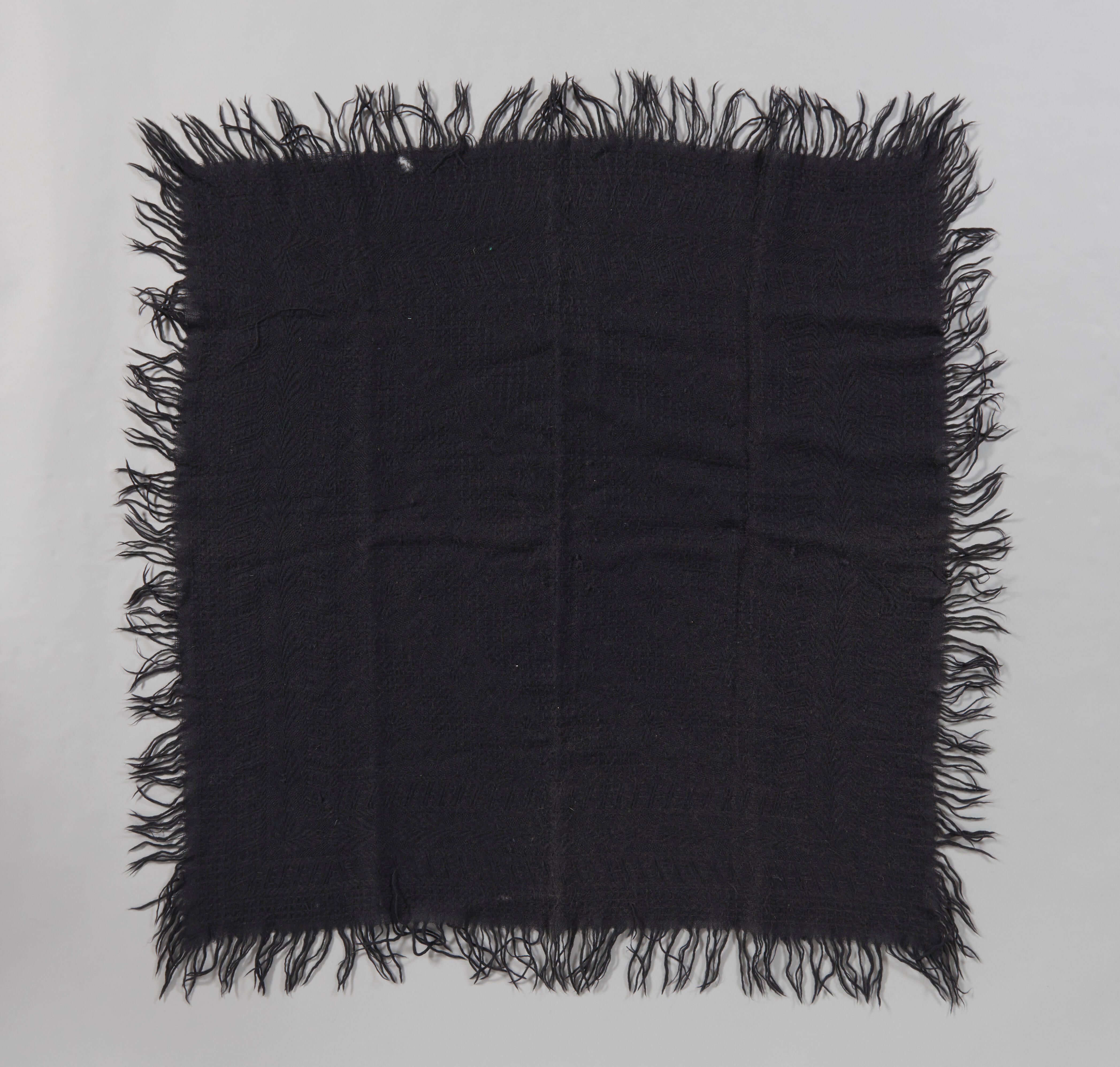 Een zwarte wollen omslagdoek met ingeweven dessin. Rondom heeft de doek een franje. De omslagdoek is tot 1928 gedragen door Lena van der Blom-Lugtenburg uit Oostvoorne, als bescherming tegen de kou.