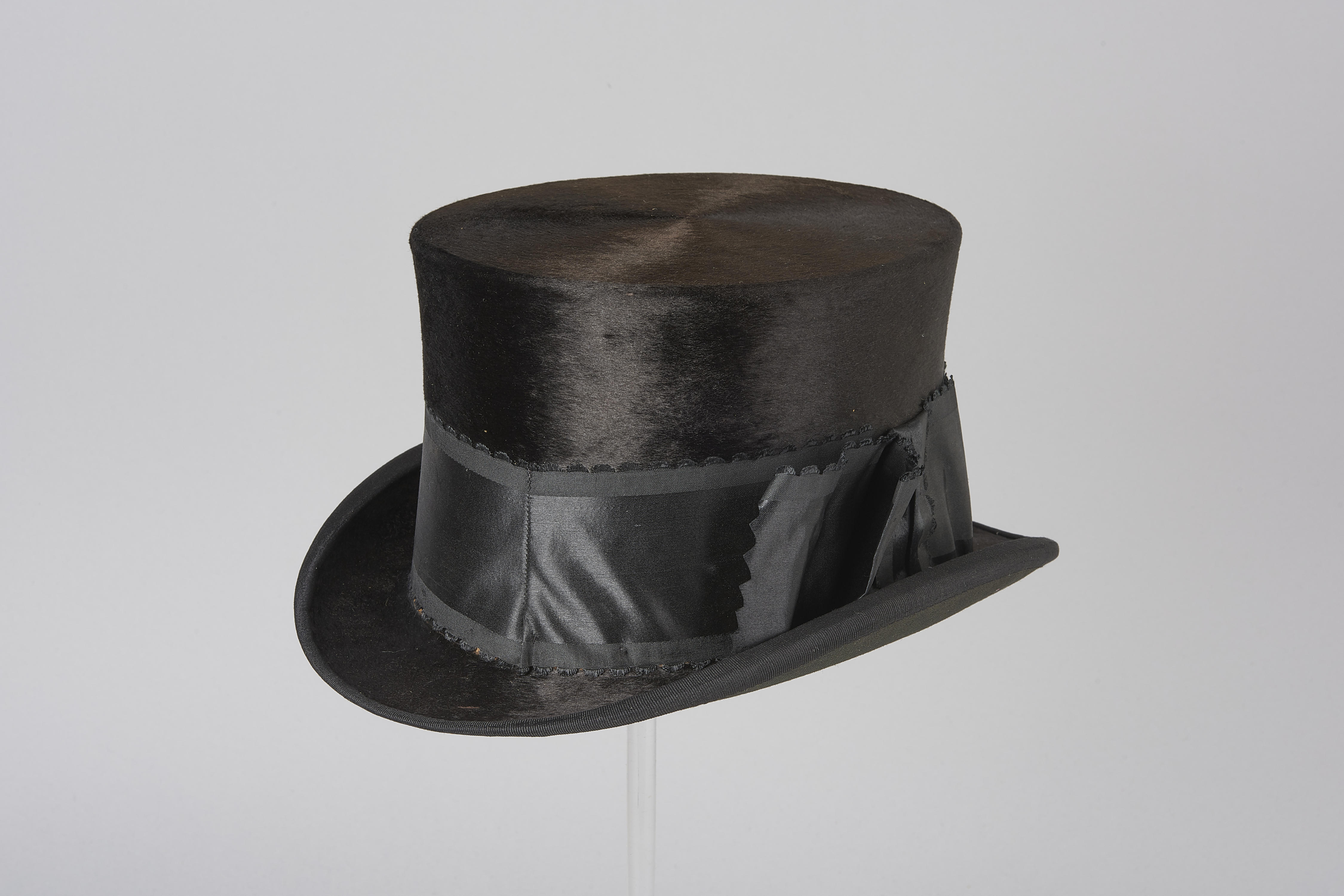 Deze in Engeland gemaakte hoed heeft een negentiende-eeuws model en is volgens Staphorster gebruik opgemaakt met een breed lint met strik. Evenals de lange geklede jas blijft hij tot in de twintigste eeuw in Staphorst en Rouveen in gebruik als gelegenheidskleding. Een dergelijke hoed wordt dan gedragen door de bruidegom, de doopvader en bij een ...