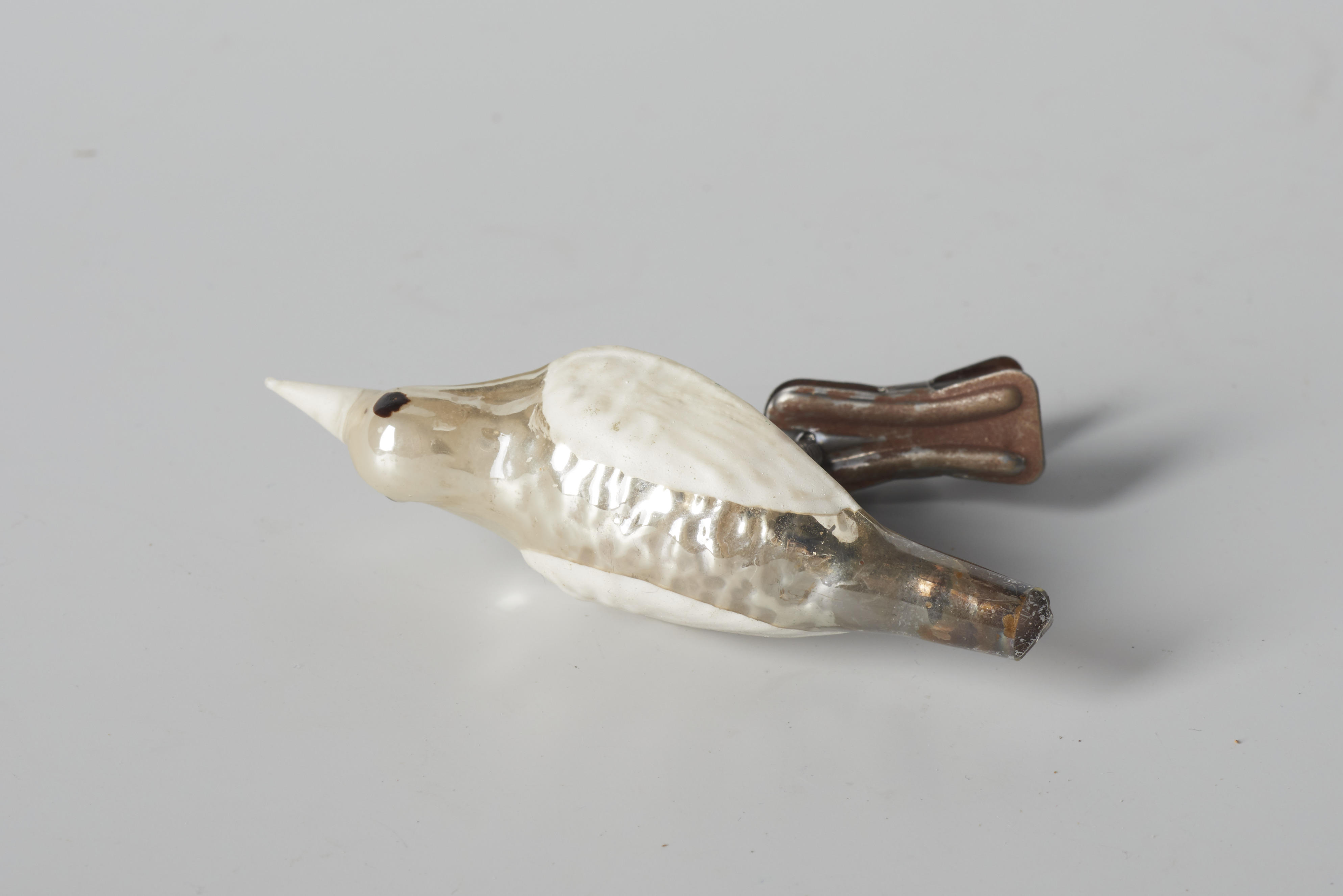 Kerstboomversiering in de vorm van een zilverkleurige vogel met witte vleugels en snavel, op een knijper.