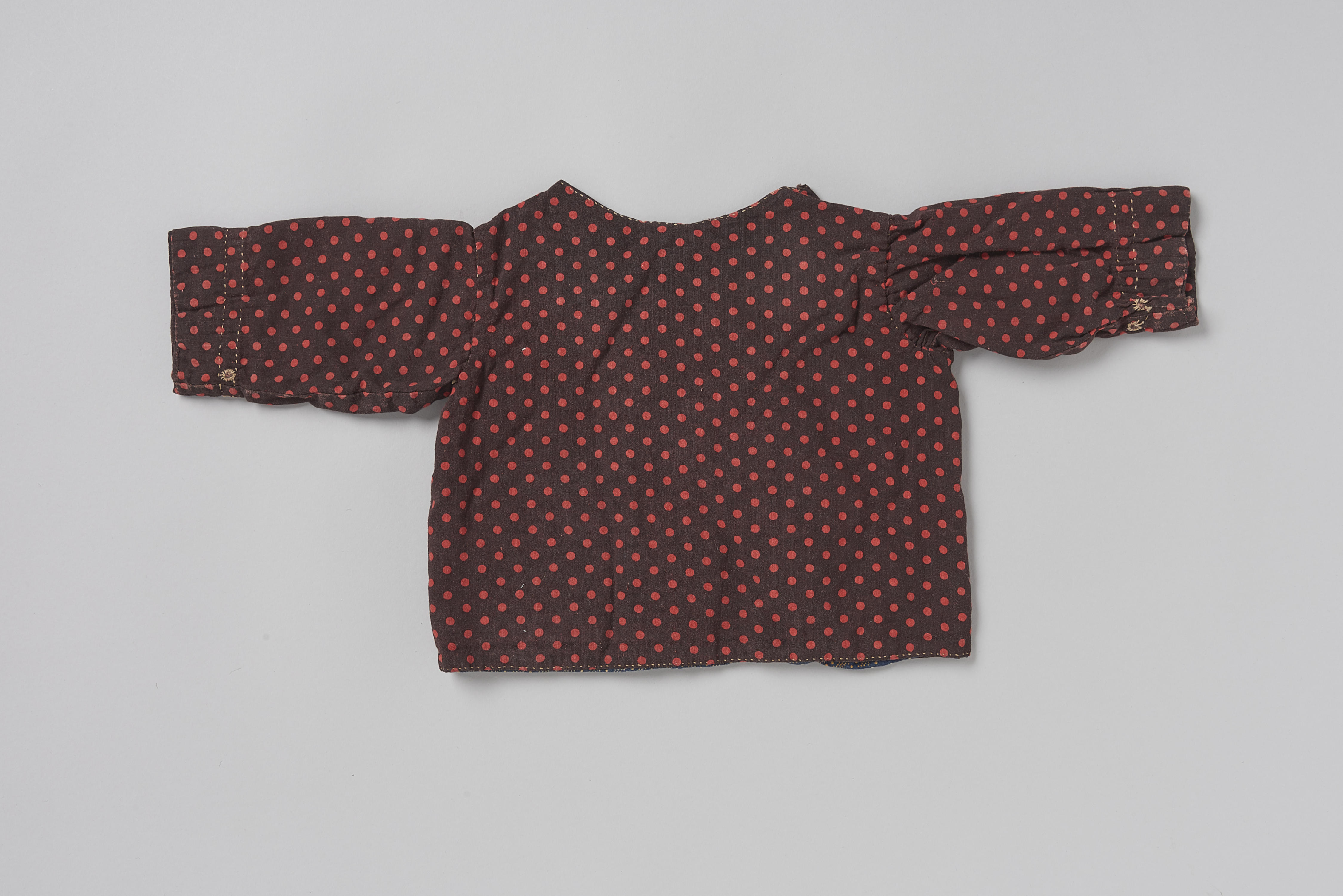 Met de hand genaaid babyjakje van bedrukte katoen, met een sluiting aan de achterzijde. De stof van de buitenkant heeft een dessin van rode stippen op een bruin fond. De voering van het lijf is van katoen met gele en witte stippelmotieven op een blauw fond. De voering van de mouwen is van bedrukte katoen ...