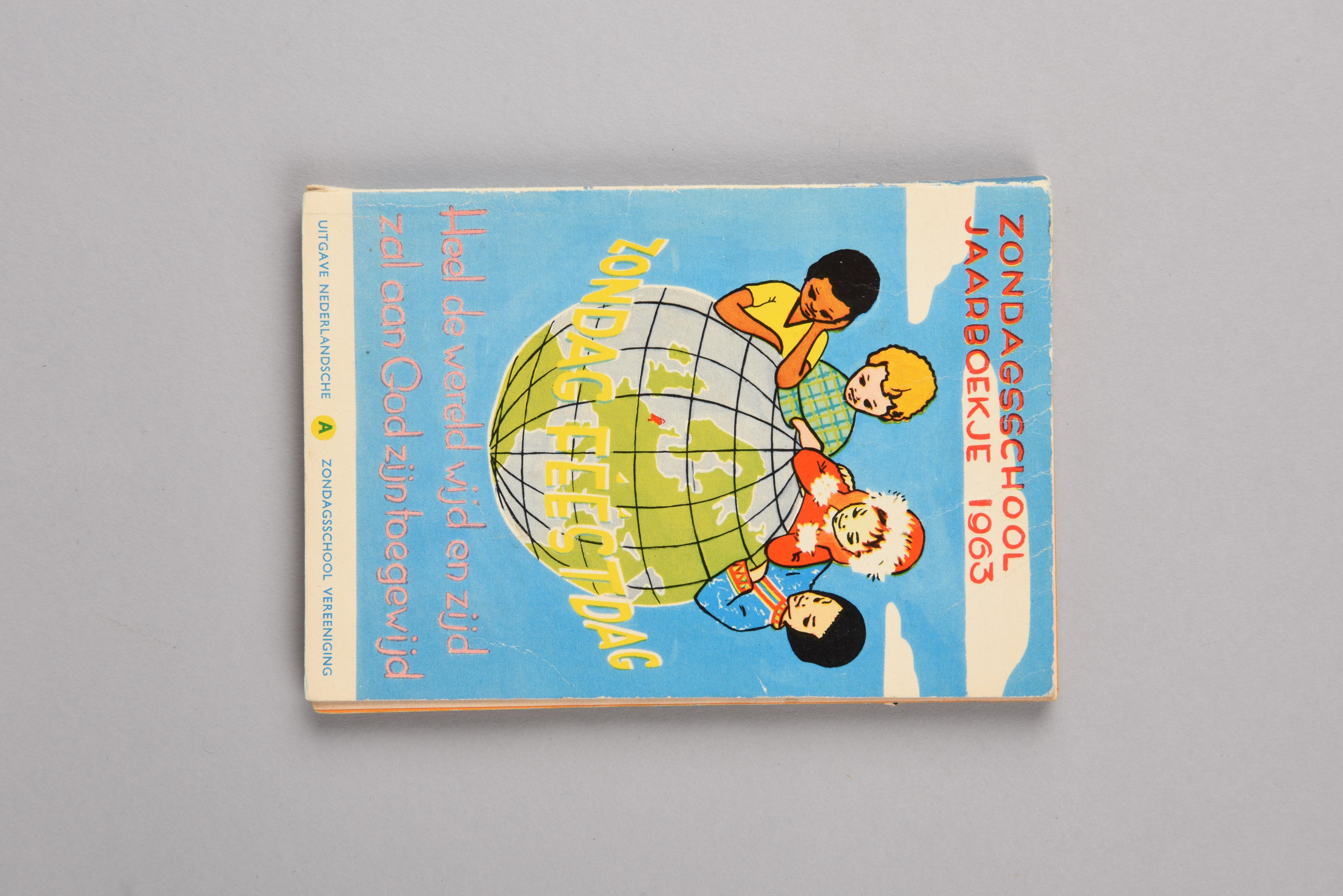 Zondagsschoolboekje A uit 1963, uitgegeven door de Nederlandsche Zondagsschool Vereeniging, met ingeplakte afbeeldingen en gedeeltelijk gemaakte knutseloefeningen. Zondagsschool jaarboekjes waren bedoeld om kinderen meer te leren over bijbelse verhalen en om gezangen en psalmen met ze te oefenen. Op de voorzijde staat een kleurrijke afbeelding van een wereldbol waar vier kinderen op steunen. Dwars over ...