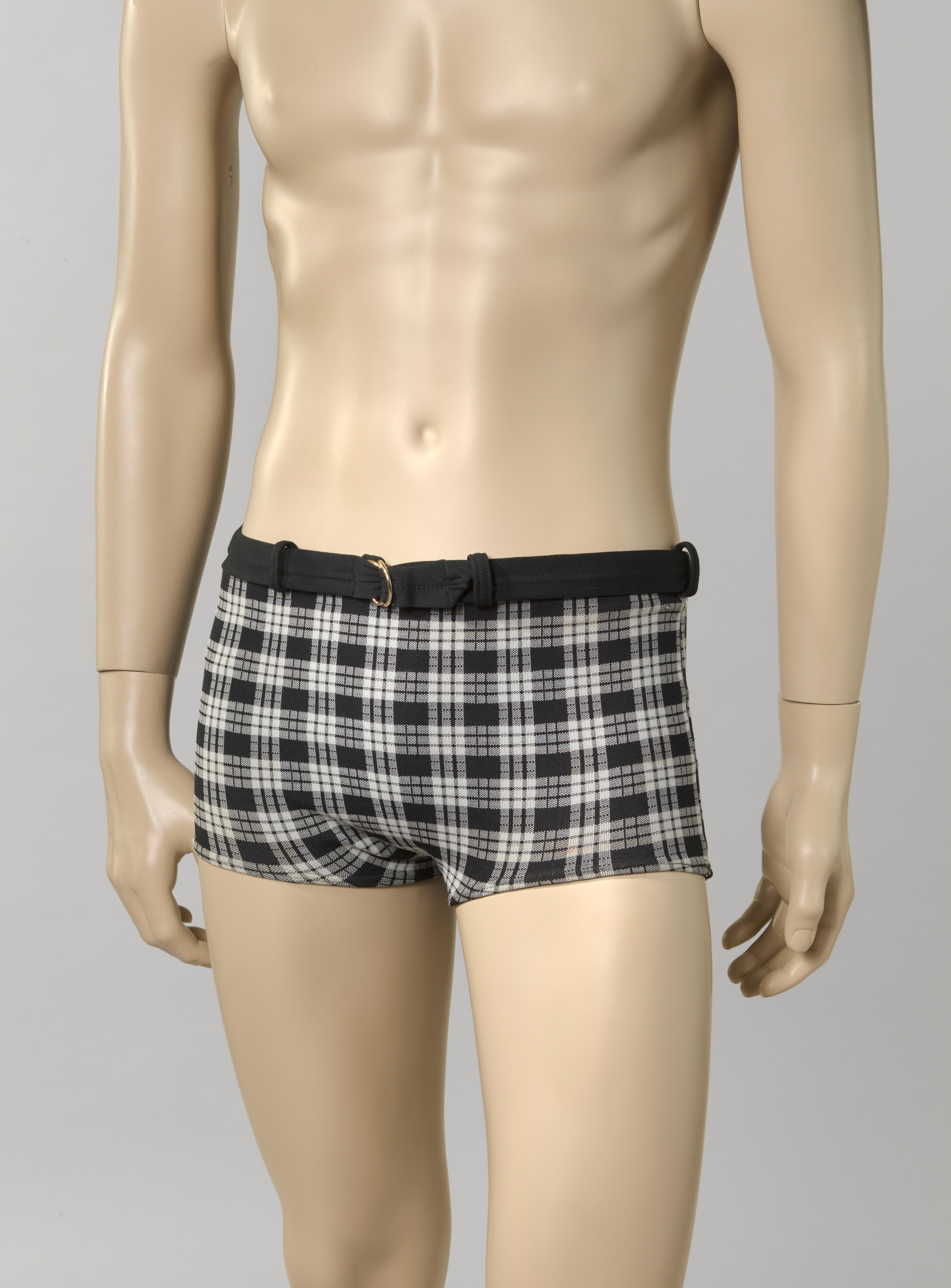 Zwembroek van zwart-wit geruite synthetische stof voor een man. De zwembroek is een heupmodel met recht gesneden pijpen. In de taille zijn vijf lusjes aangebracht, met daardoorheen een stofceintuur. De lusjes en de ceintuur zijn van effen zwarte synthetische stof. De sluiting van de ceintuur bestaat uit een messingkleurige metalen gesp in twee delen. De ...