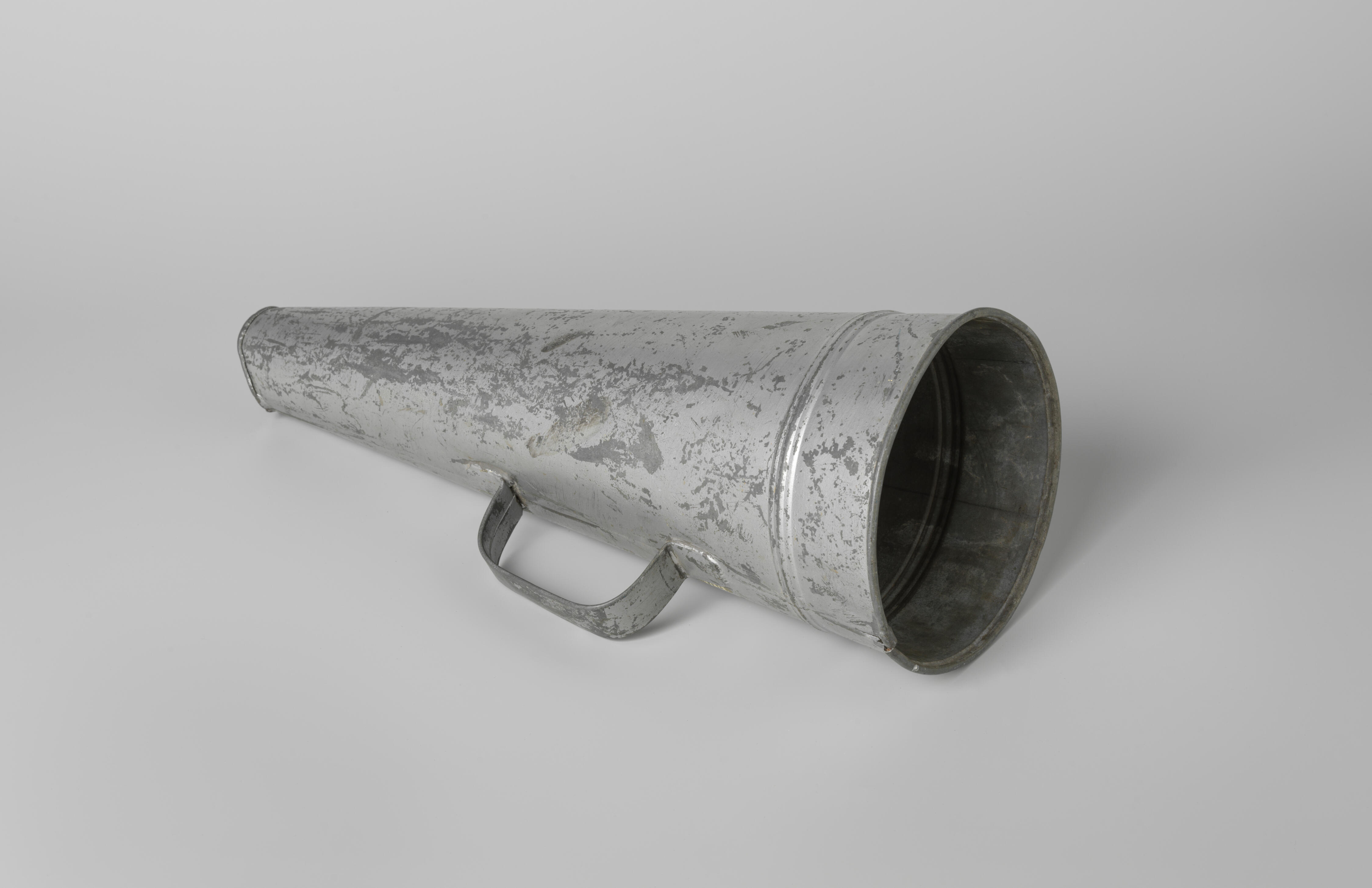 Eenvoudig vormgegeven megafoon van tin, gebruikt om instructies voor zwemles te versterken in een (binnen)zwembad. De instructietoeter loopt taps toe en heeft een afgerond uiteinde. De enige decoratie bestaat uit twee parallelle gegraveerde lijnen nabij het wijde uiteinde van de toeter. De megafoon heeft een rechthoekig handvat, waardoor een zweminstructeur hem makkelijk kon vasthouden en ...