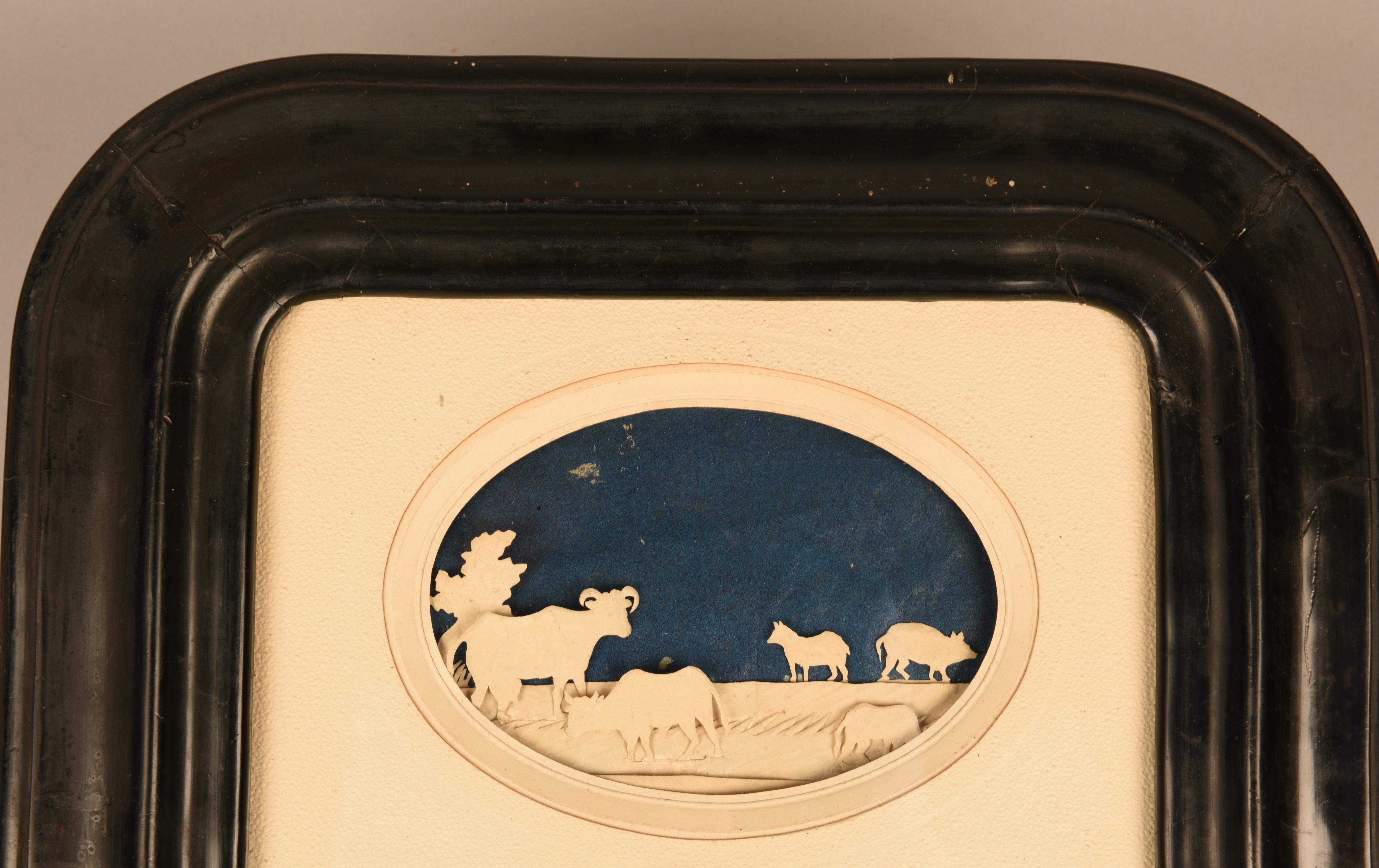 Ovaal coulissenknipsel met vee in een weidelandschap. Het knipsel is gemaakt uit wit papier en bestaat uit meerdere delen die later opgeplakt zijn. Hierdoor ontstaat meer diepte in het landschap. Het werk is vergelijkbaar met knipkunstwerken van Reynders. Links grazen twee koeien, rechts zijn een hond, wolf of vos en twee andere dieren verbeeld. Links ...