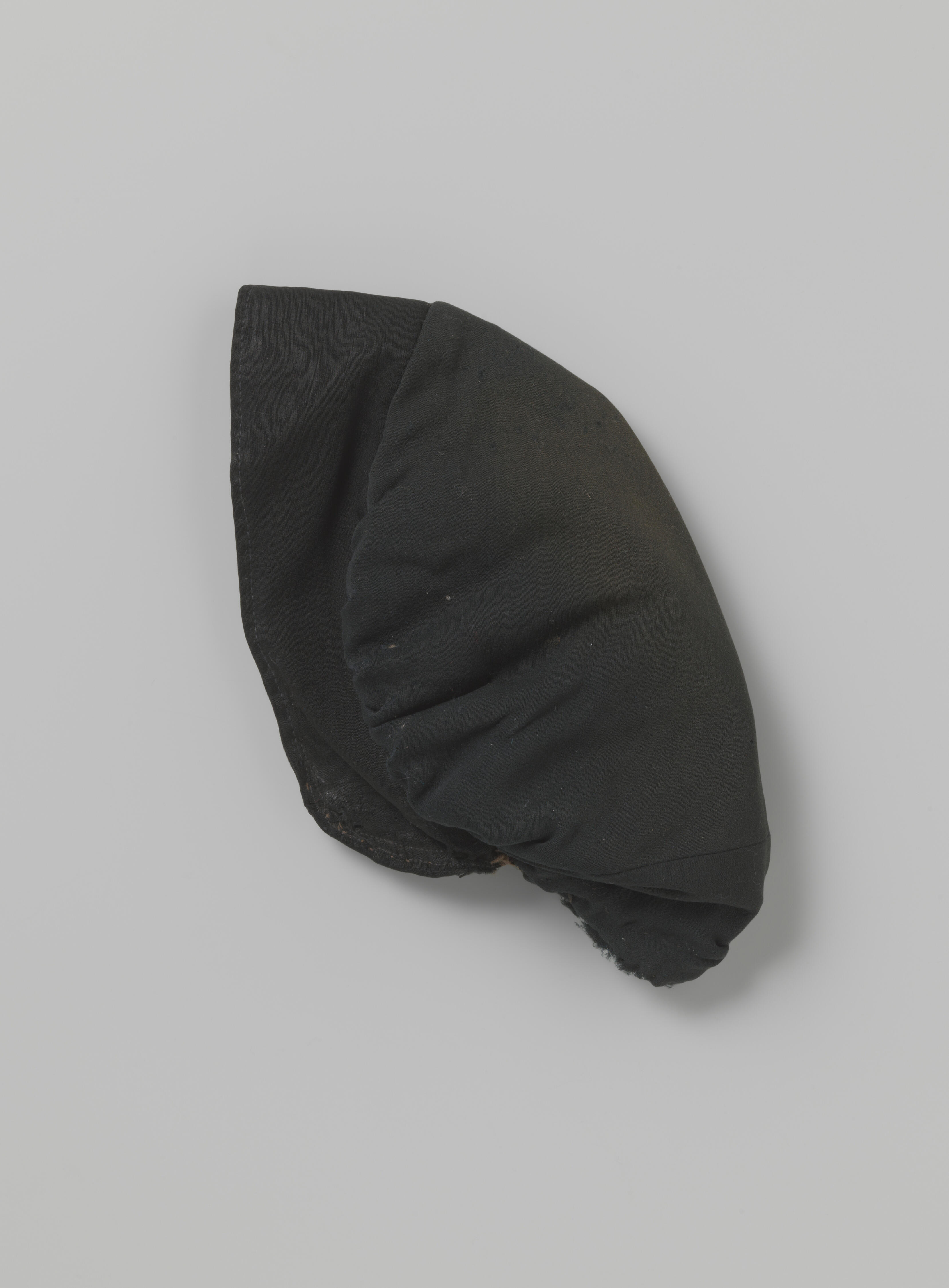 Ondermuts, gedragen door een vrouw in streekdracht uit de Meierij van 's-Hertogenbosch. Volgens de verwervingsgegevens is de muts gedragen omstreeks 1940. De buitenstof is van fijne zwarte wollen stof, zogenoemd merinos of tebee. De pas voorlangs is gevoerd met stevige grijze keperkatoen. De rest is gevoerd met naturelkleurige katoen, met een ingeweven blauwe en rode ...