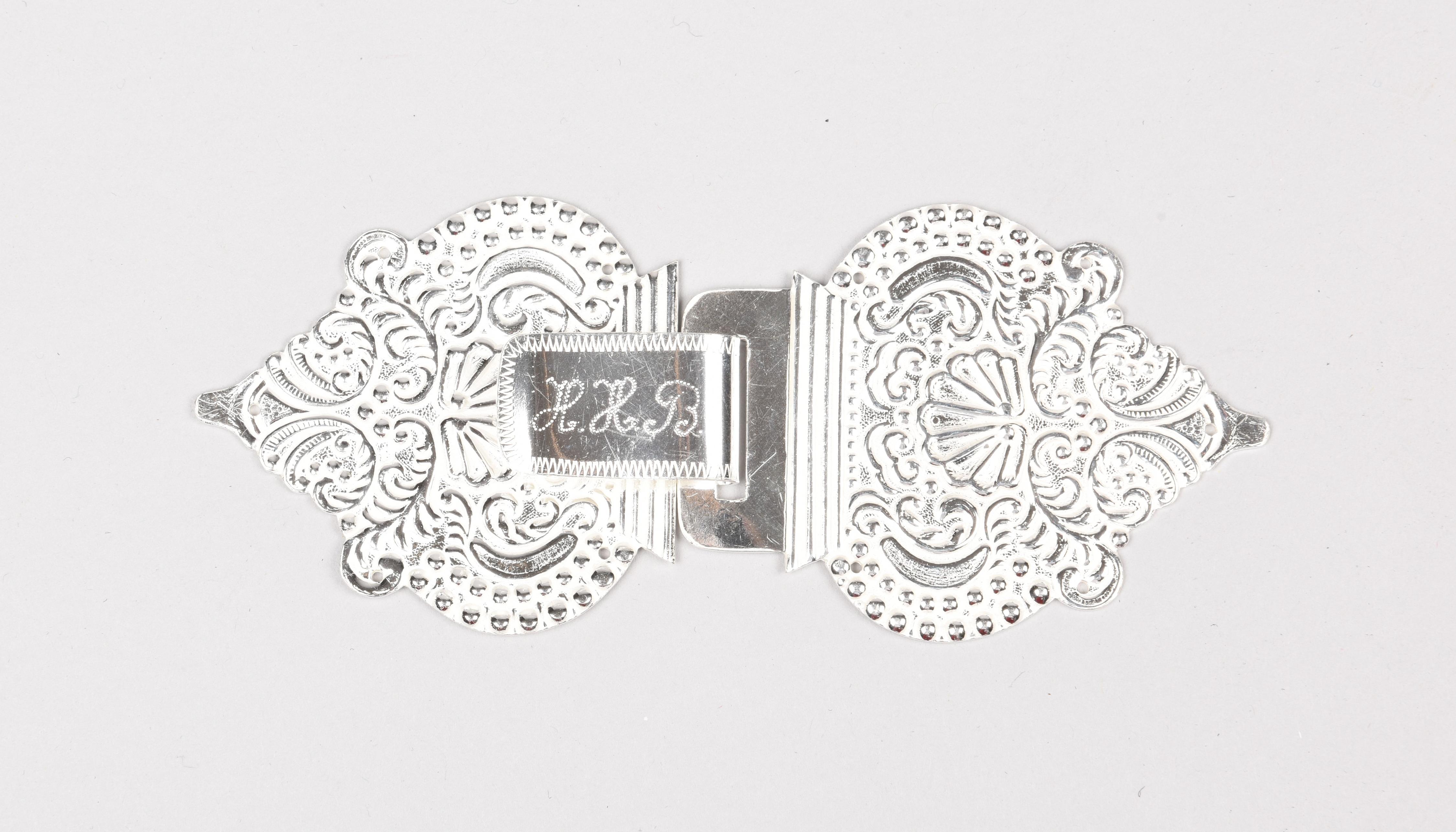 Een zilveren haak en oog, een zogenoemde 'mantelhaak'. Dit grootste type werd aanvankelijk alleen gedragen door dochters van welgestelde ouders. Gaandeweg werd het grootste type door een steeds grotere groep aangeschaft. Vooral wanneer grootmoeder op de eerste verjaardag haar kleindochter een mantelhaak cadeau deed, wilde ze niet onderdoen voor de andere grootouders van het kind. ...