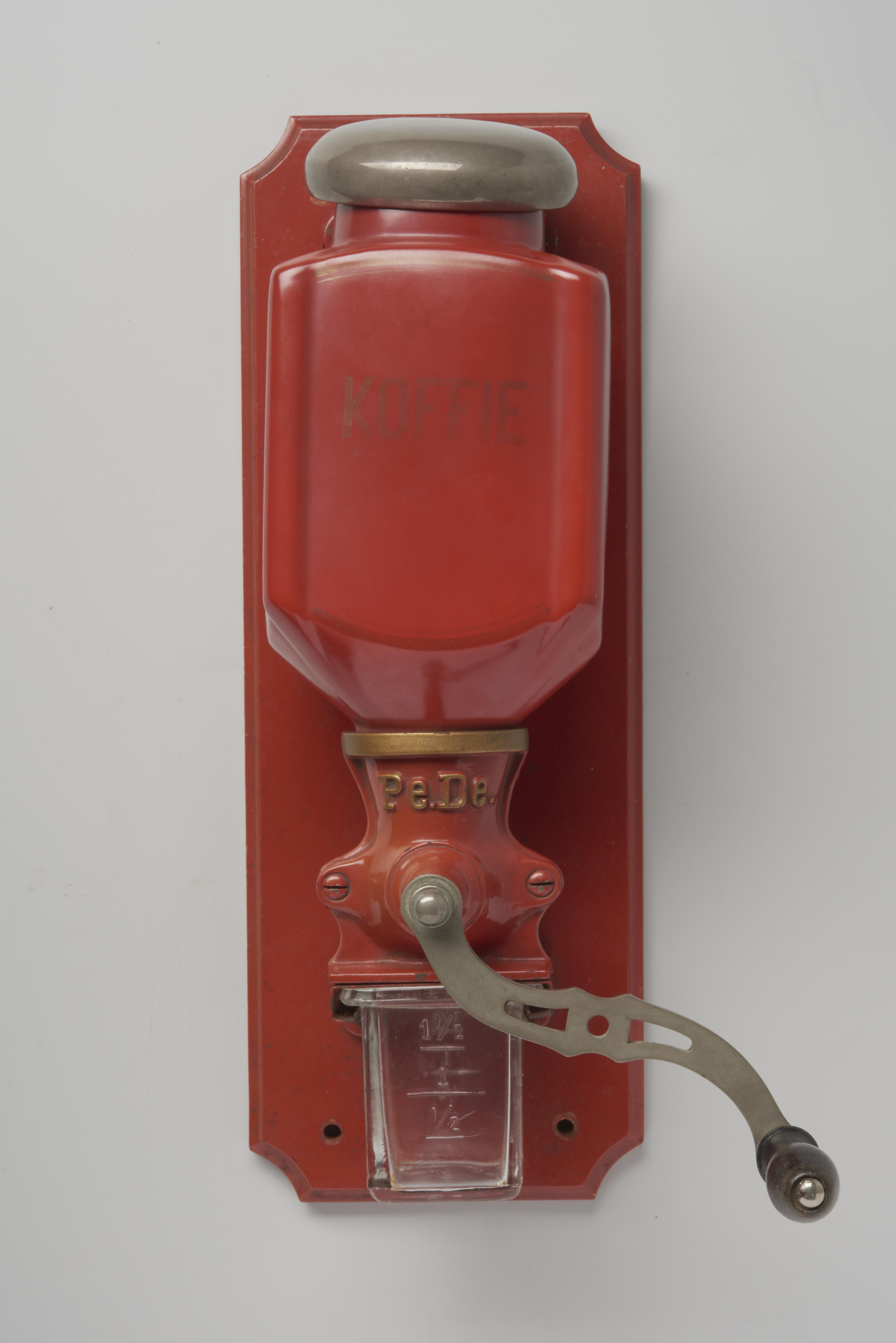 Rode wandkoffiemolen met op de voorzijde de tekst: 'KOFFIE'.