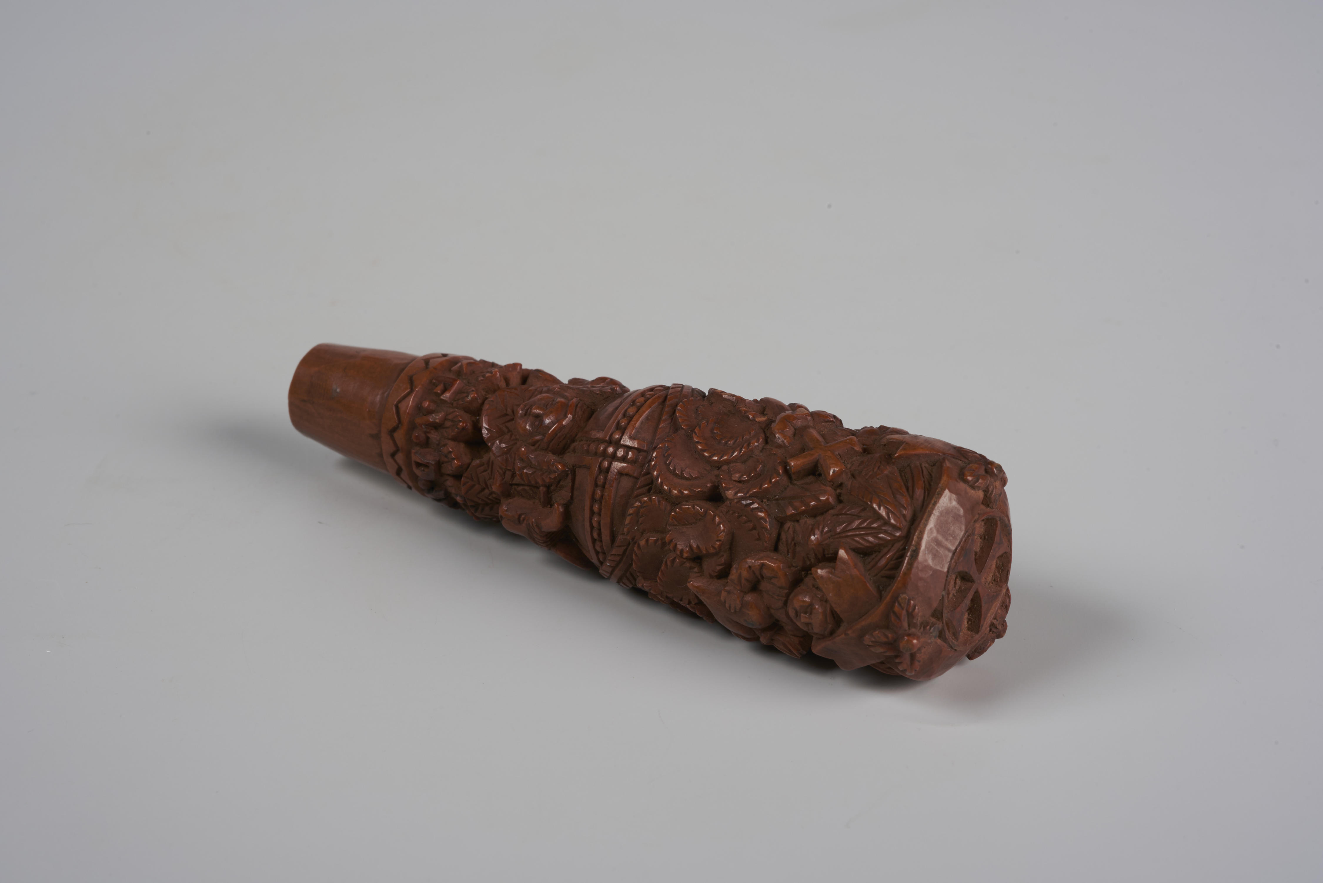 Houten mesheft, versierd met mensfiguren, een rijksappel, een anker, een hart en de tekst: 'F.V.D.W. te Uden'. Op de bovenkant is een Maltezer kruis te zien.