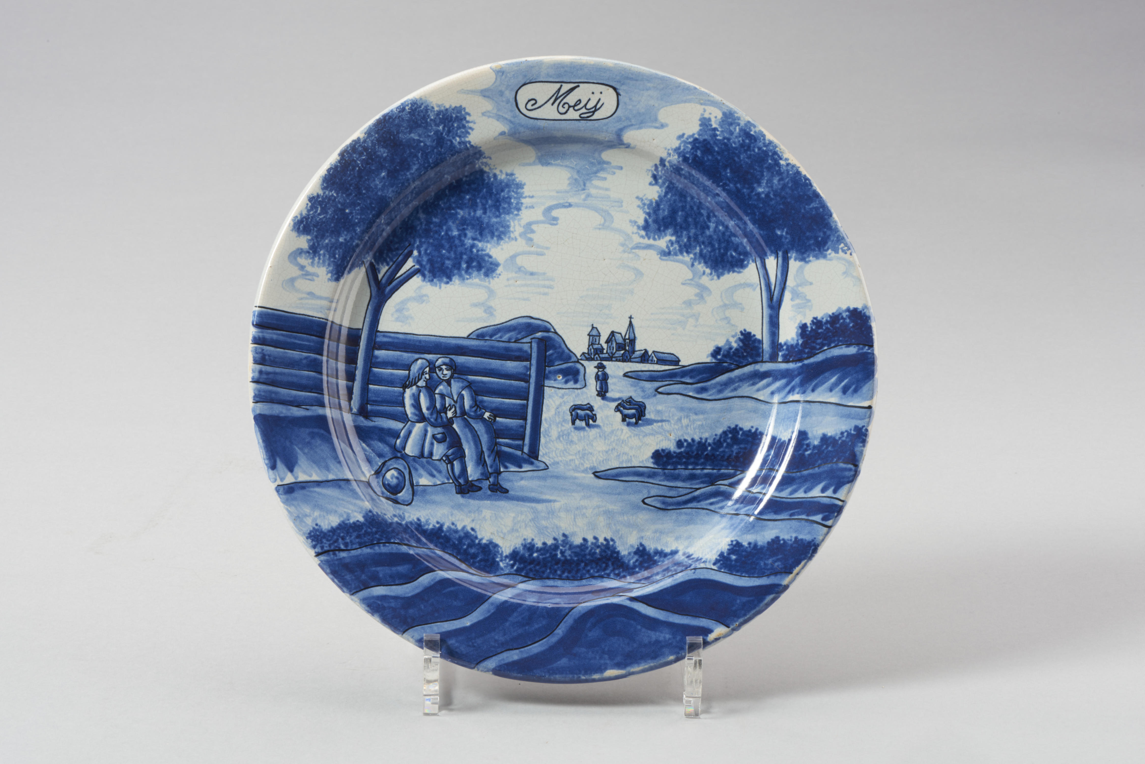 Bord met een voorstelling van een paar in pastoraal landschap met een dorp op de achtergrond. Het opschrift luidt: 'Meij'. Het bord is een imitatie van een achttiende-eeuwse voorbeeld.