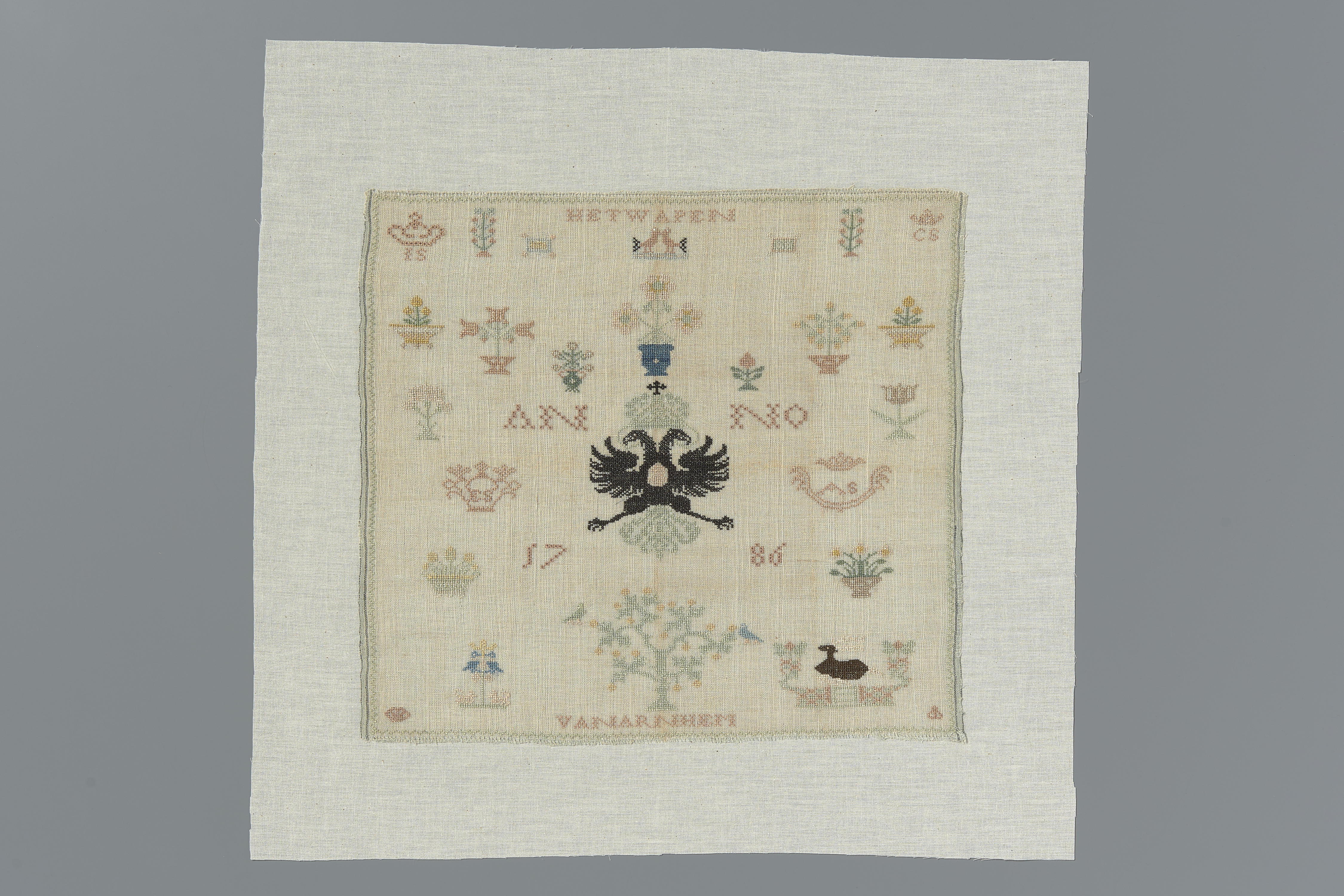 Merklap uit 1786 met daarop het wapen van Arnhem, namelijk een dubbele arend of ook wel adelaar genoemd. De merklap is met pastelkleurige zijde in kruissteek geborduurd op linnen en is rondom afgewerkt met een zigzagrandje. Naast bloemenmanden, bloempotten en palmtakjes zijn verschillende kroontjes geborduurd met initialen. Rechtsonder is een liggend hert in de Hollandse ...