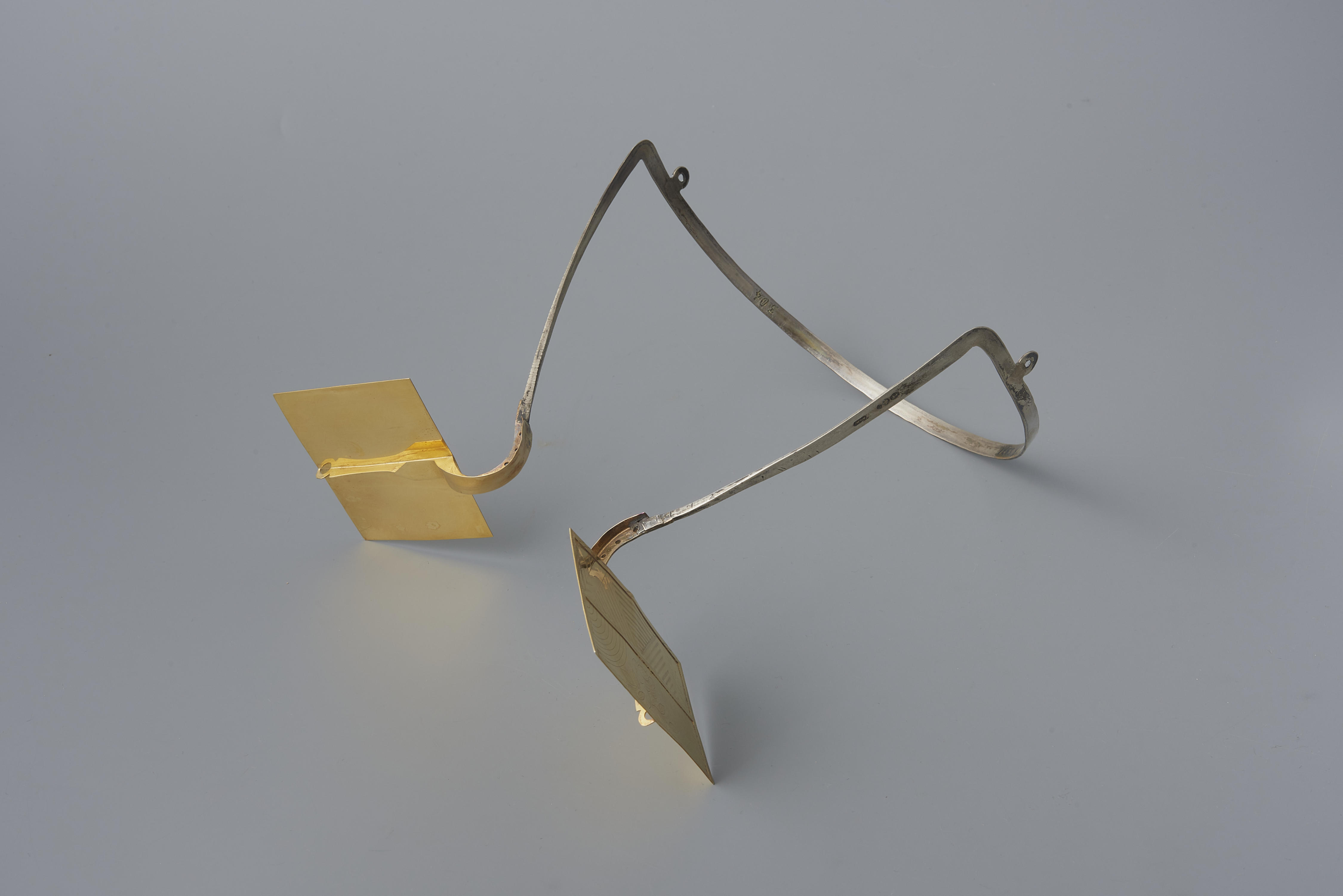 Oorijzer, bestaande uit een zilveren beugel met 18-karaats gouden 'stikken'. Het oorijzer is gedragen door een vrouw in de rooms-katholieke dracht op Zuid-Beveland. De stikken zijn aan de achterzijde gegraveerd met geometrische motieven en bloemen. Het oorijzer is in 1928 vervaardigd door J.H. van de Ven in Dordrecht.