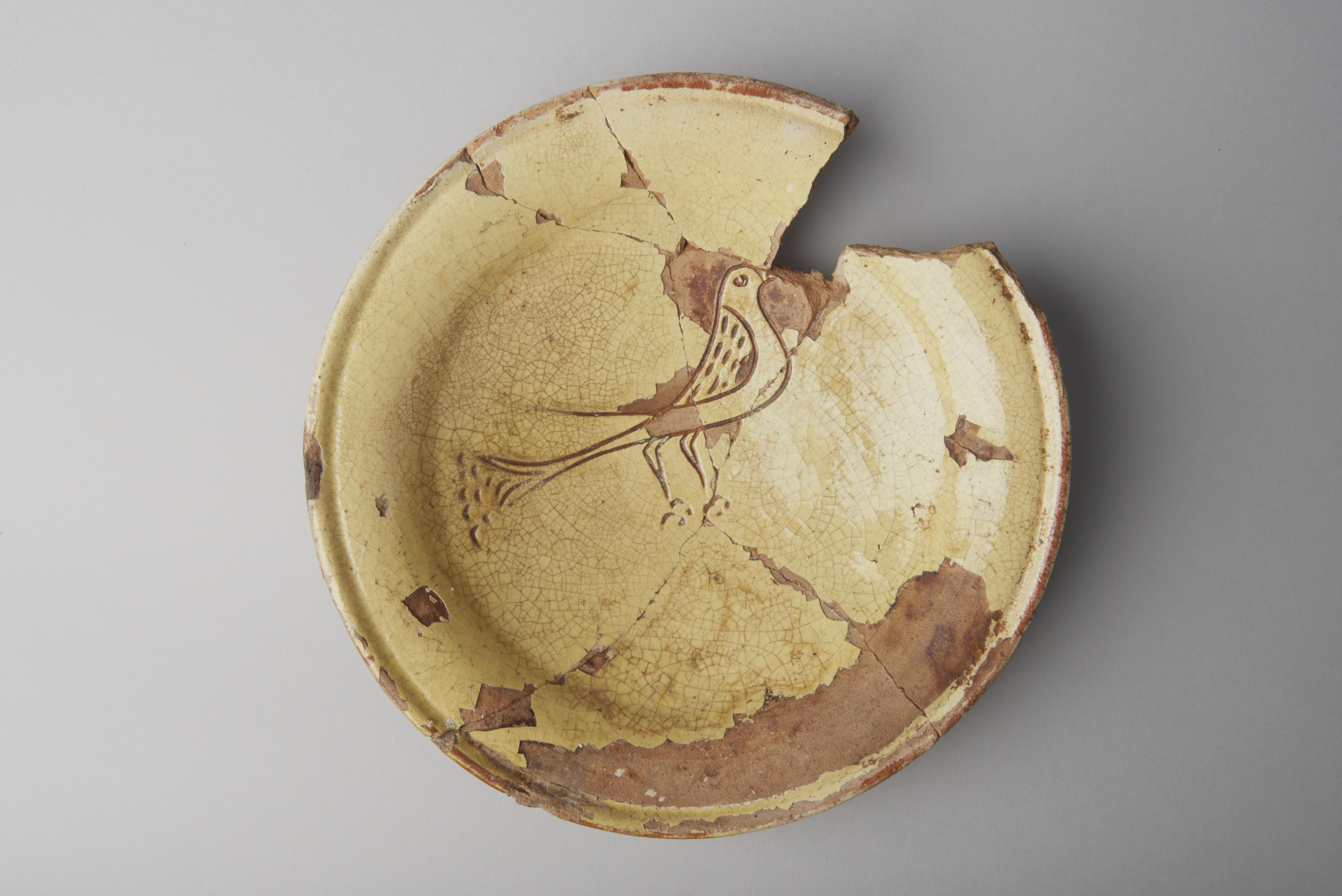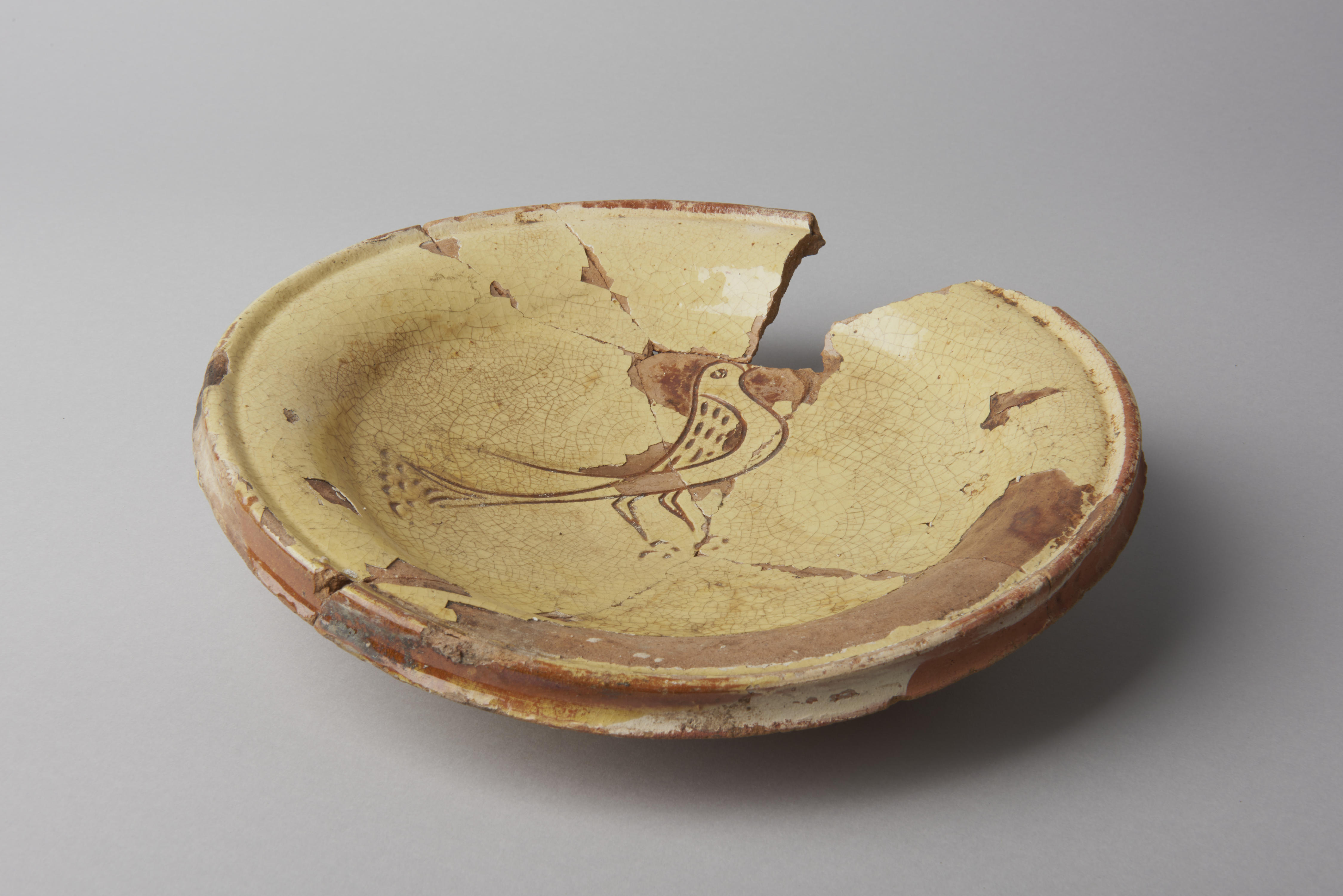 Schotel, bodemvondst aan de Kortedijk in Gorinchem. De schotel heeft drie schelpvormige voeten en een voorstelling van een vogel.