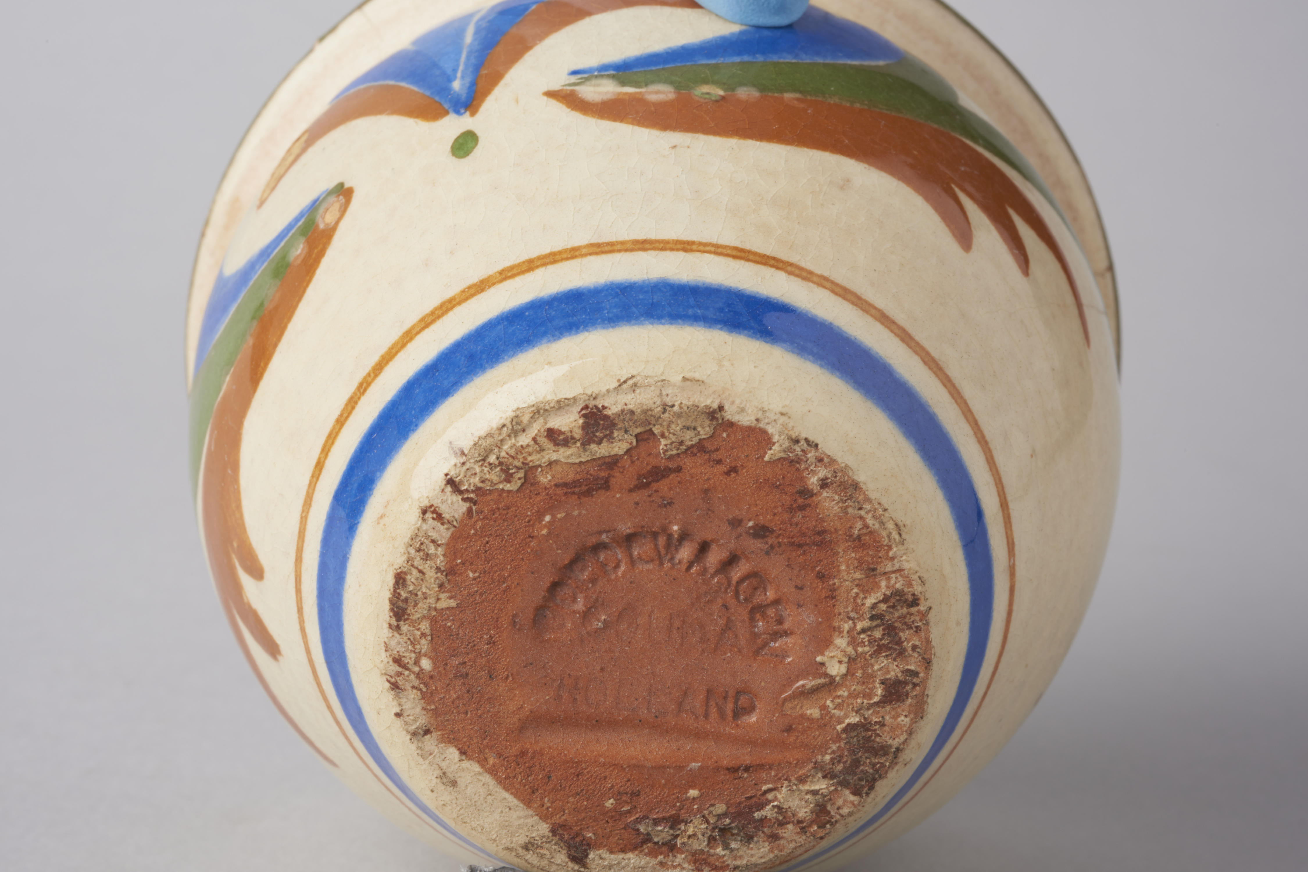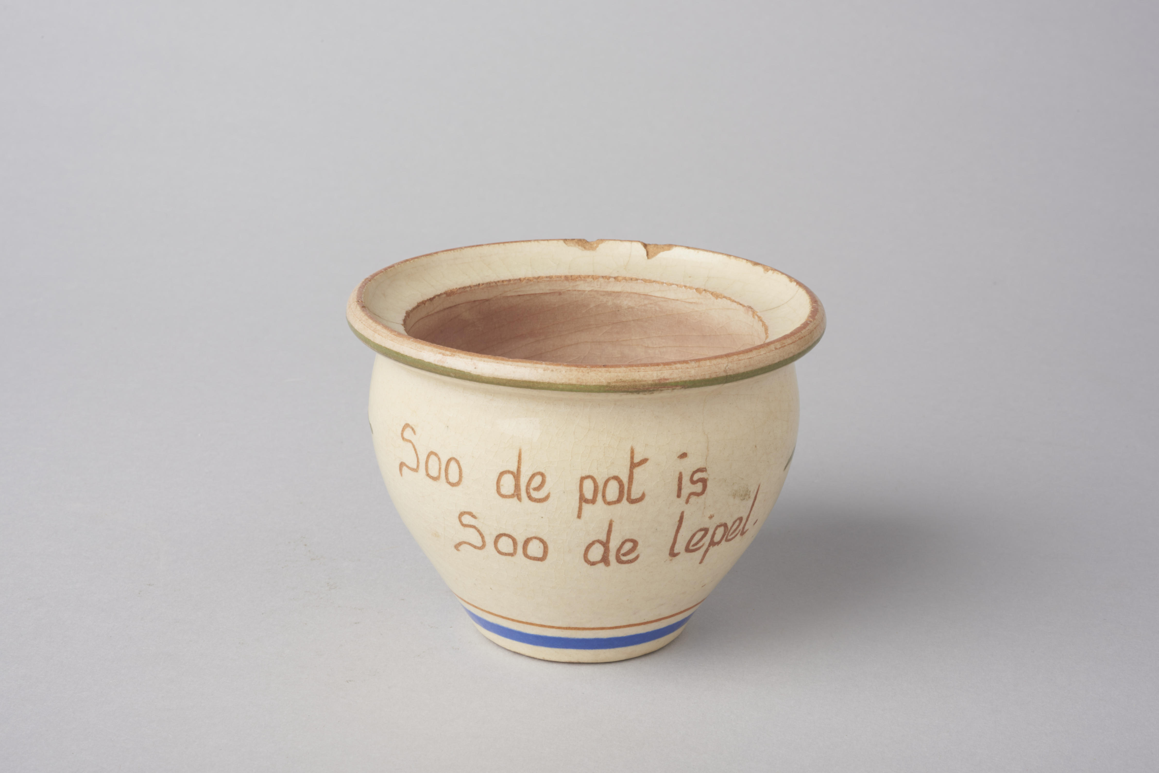 Pot met het 'Landhuis' decor, gemaakt door Goedewaagen in Gouda. Op de zijkant is een bladmotief afgebeeld en staat de tekst: 'Soo de pot is Soo de lepel', afgeleid van de dichter Jacob Cats (1577-1660). Hoogstwaarschijnlijk is de pot ontworpen door Willem Hendrik van Norden, de artistiek leidinggevende van het Kunstatelier Goedewaagen-Distel.