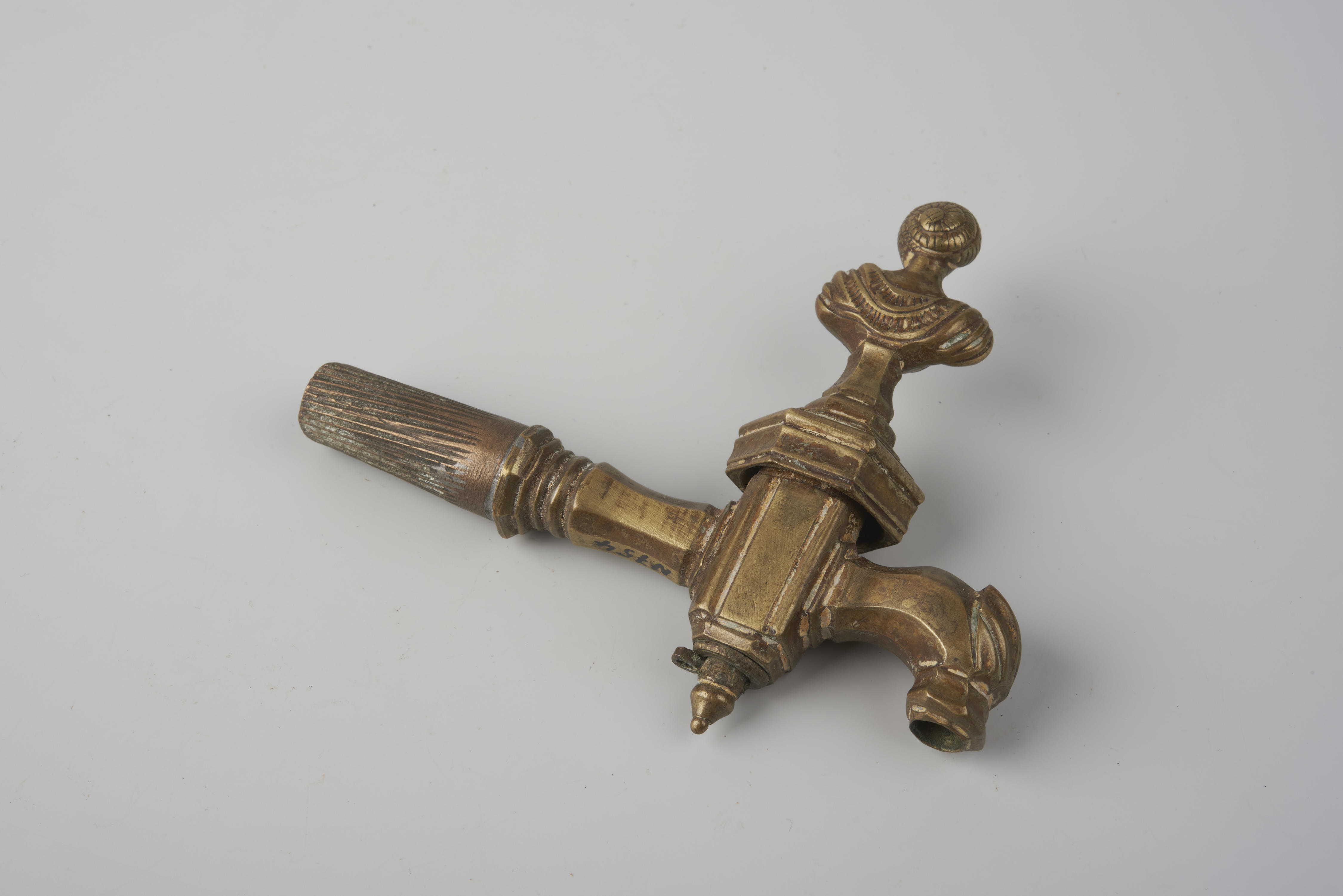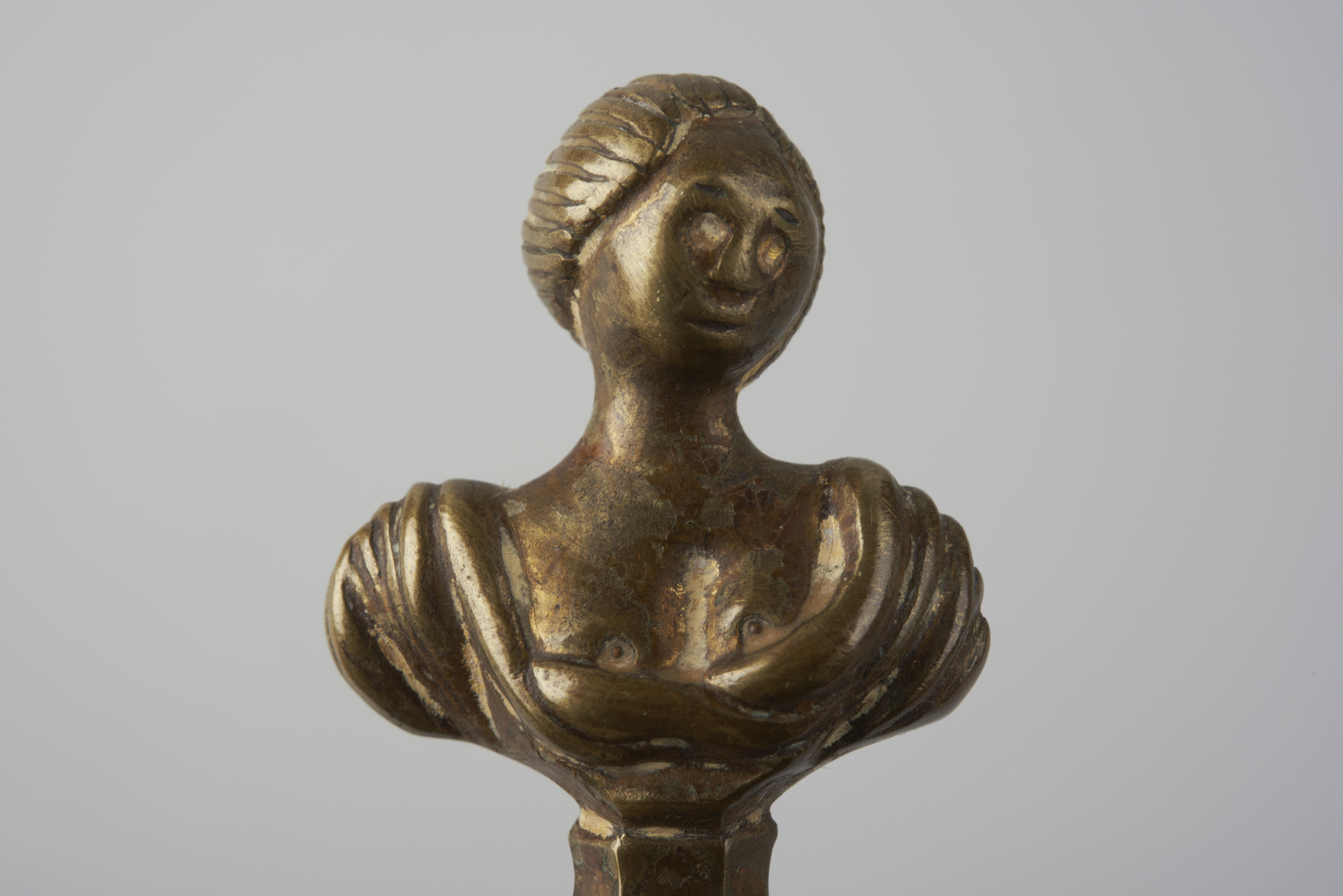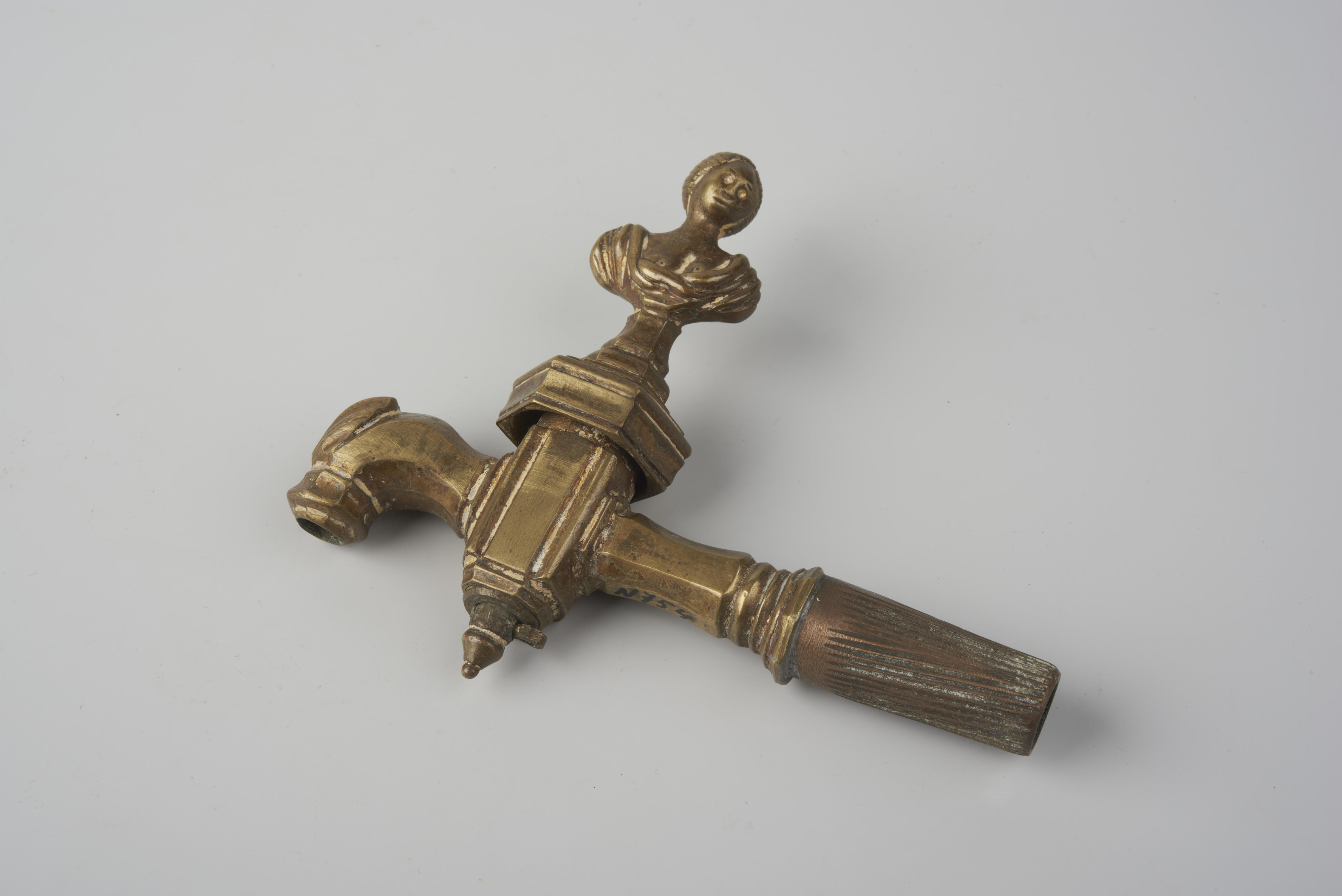 Messing kraanstop met een handvat in de vorm van een vrouwentorso.