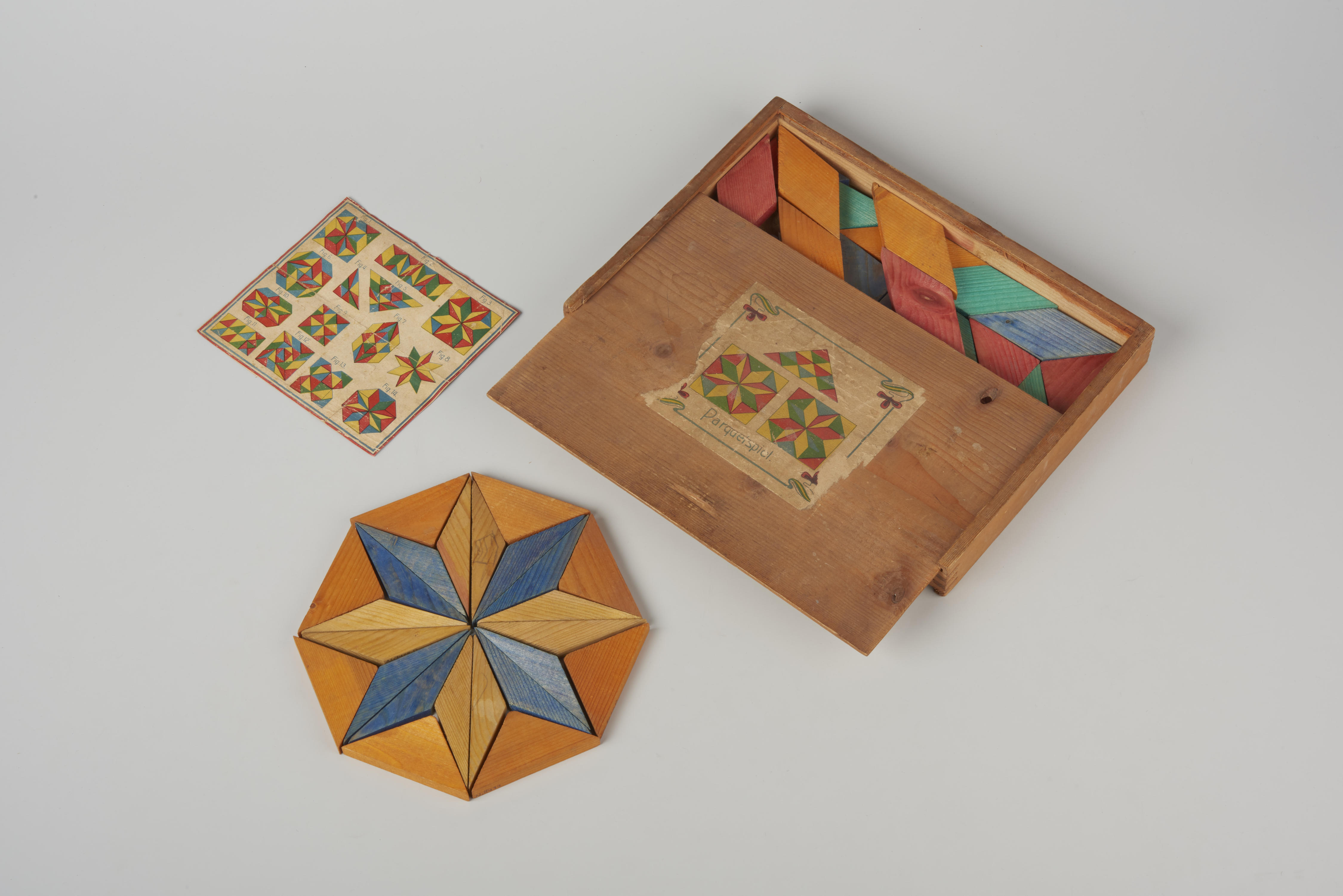 Dit mozaïekspel is een voorbeeld van didactisch speelgoed. Kinderen leerden verschillende voorstellingen samenstellen met behulp van de houten vormen.