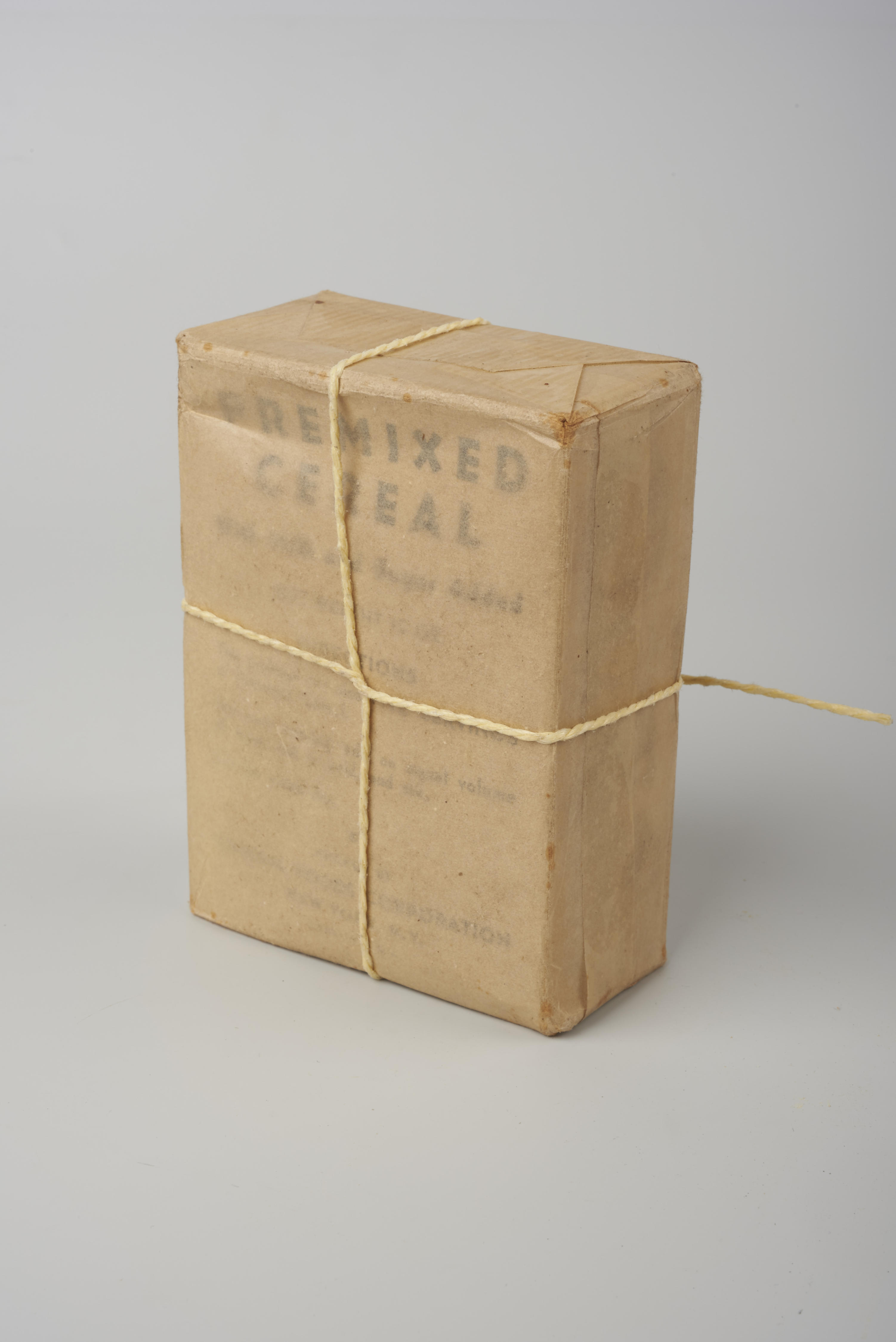 Doos ontbijtgranen met het opschrift: 'Premixed Cereal'.