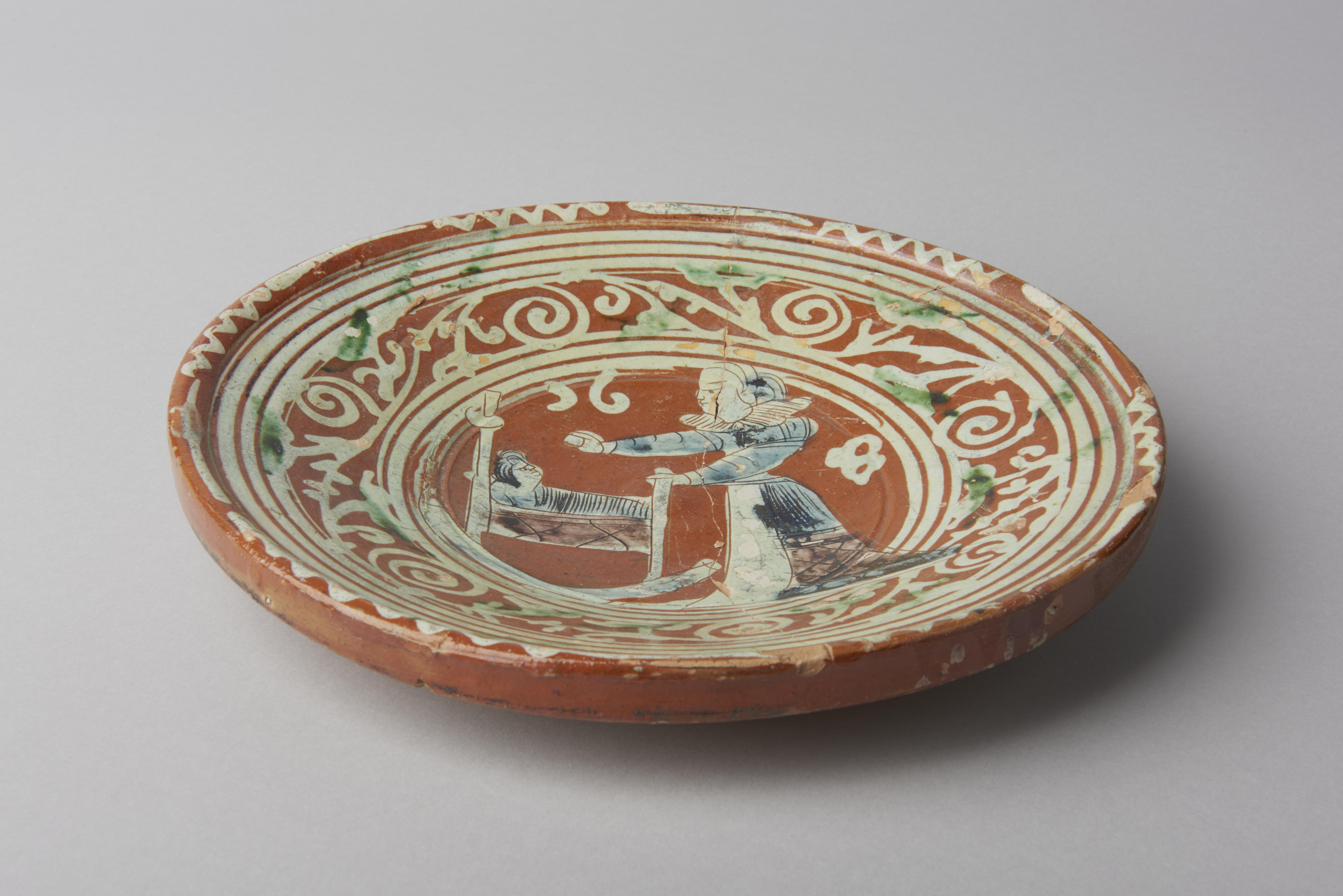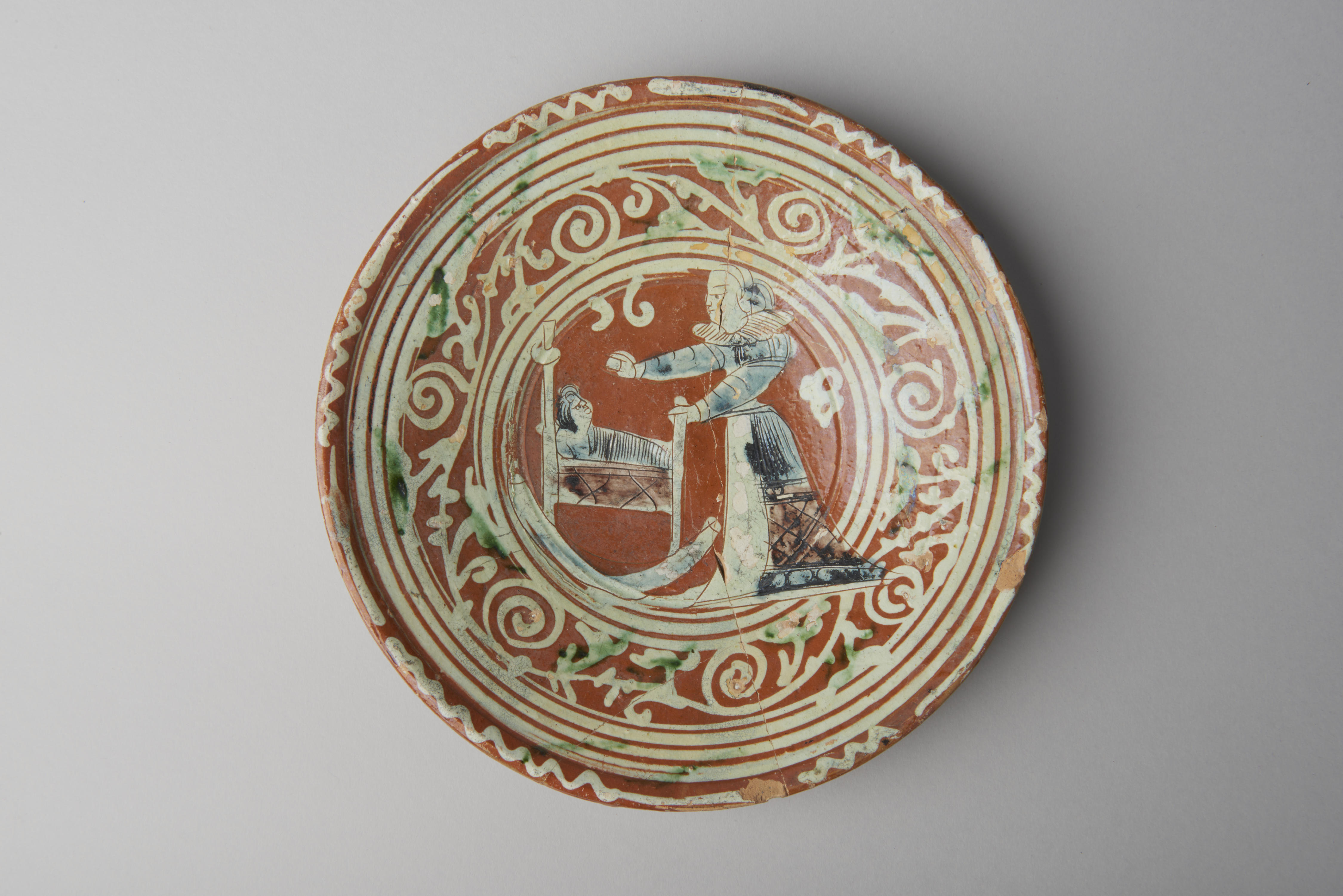 Schotel, bodemvondst in Amsterdam. De schotel heeft in het midden een afbeelding van een vrouw met een kind in een wieg.