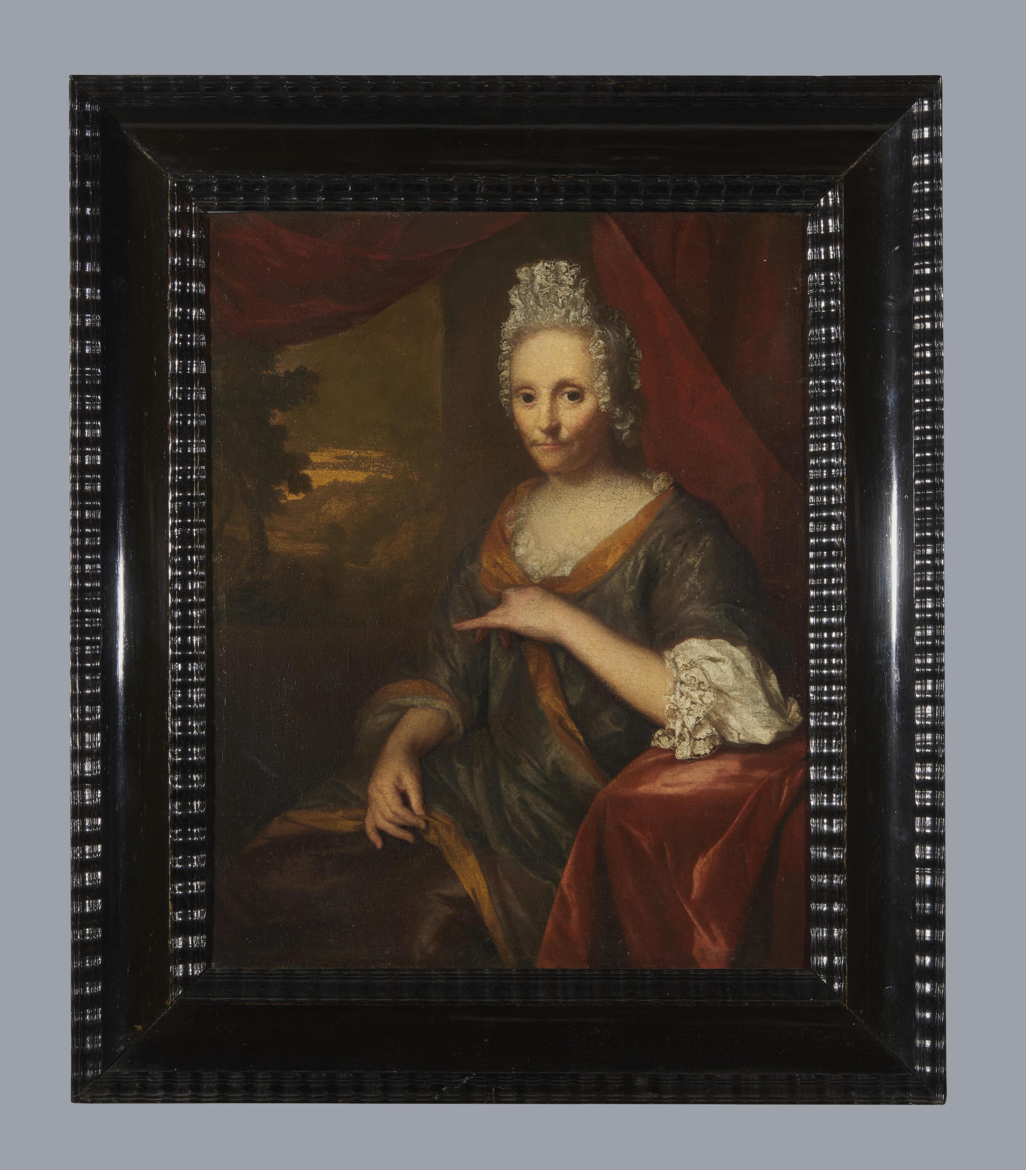 Olieverfportret van een vrouw, leunend op een tafel in een interieur, omringd door draperieën. Door een raam linksboven is een uitzicht op een arcadisch landschap te zien. De vrouw draagt op haar hoofd waarschijnlijk een zogenaamde fontange. Dit is een type muts met een hoog boven het hoofd uitstekend middendeel met daaraan twee op de ...