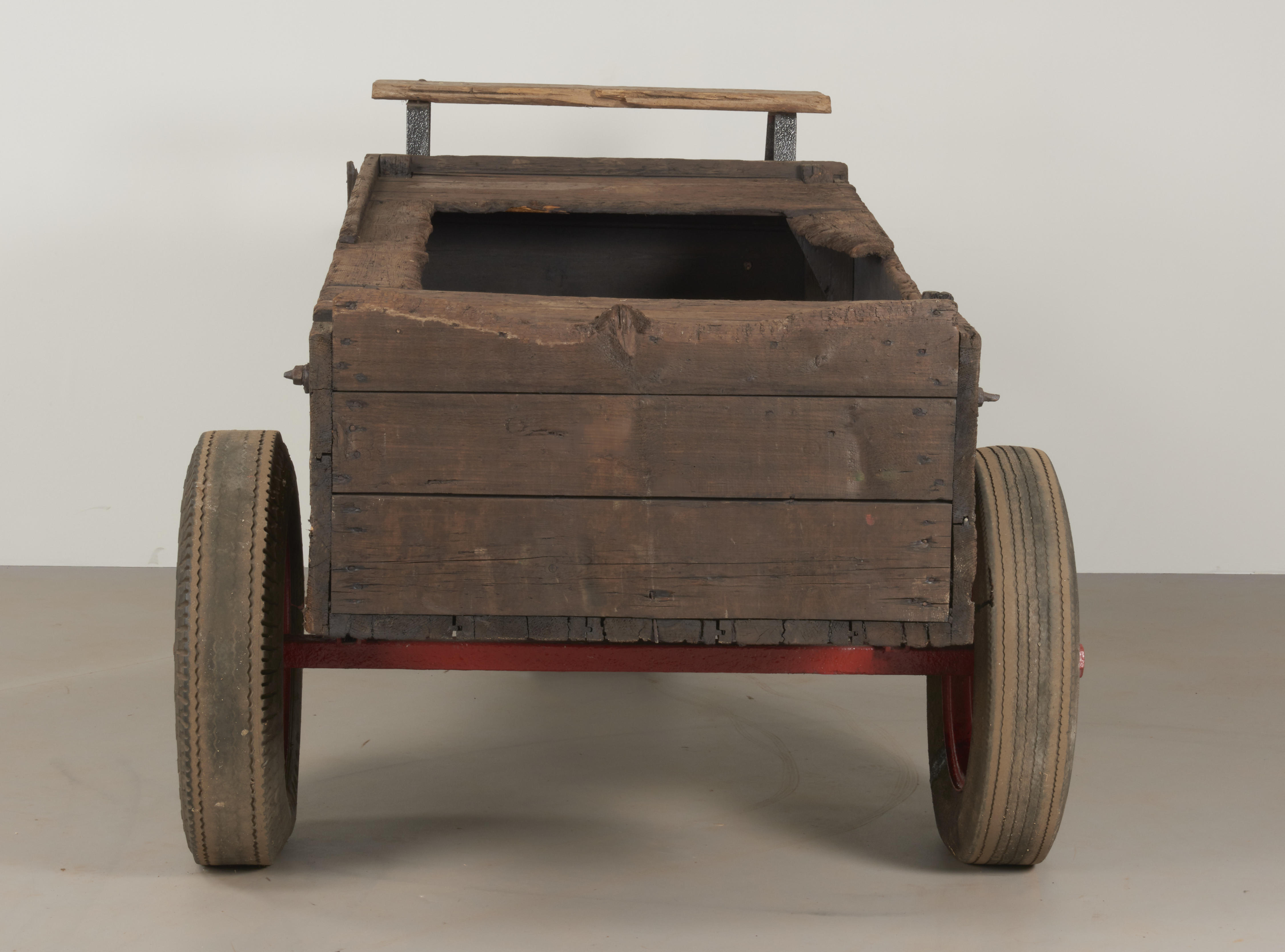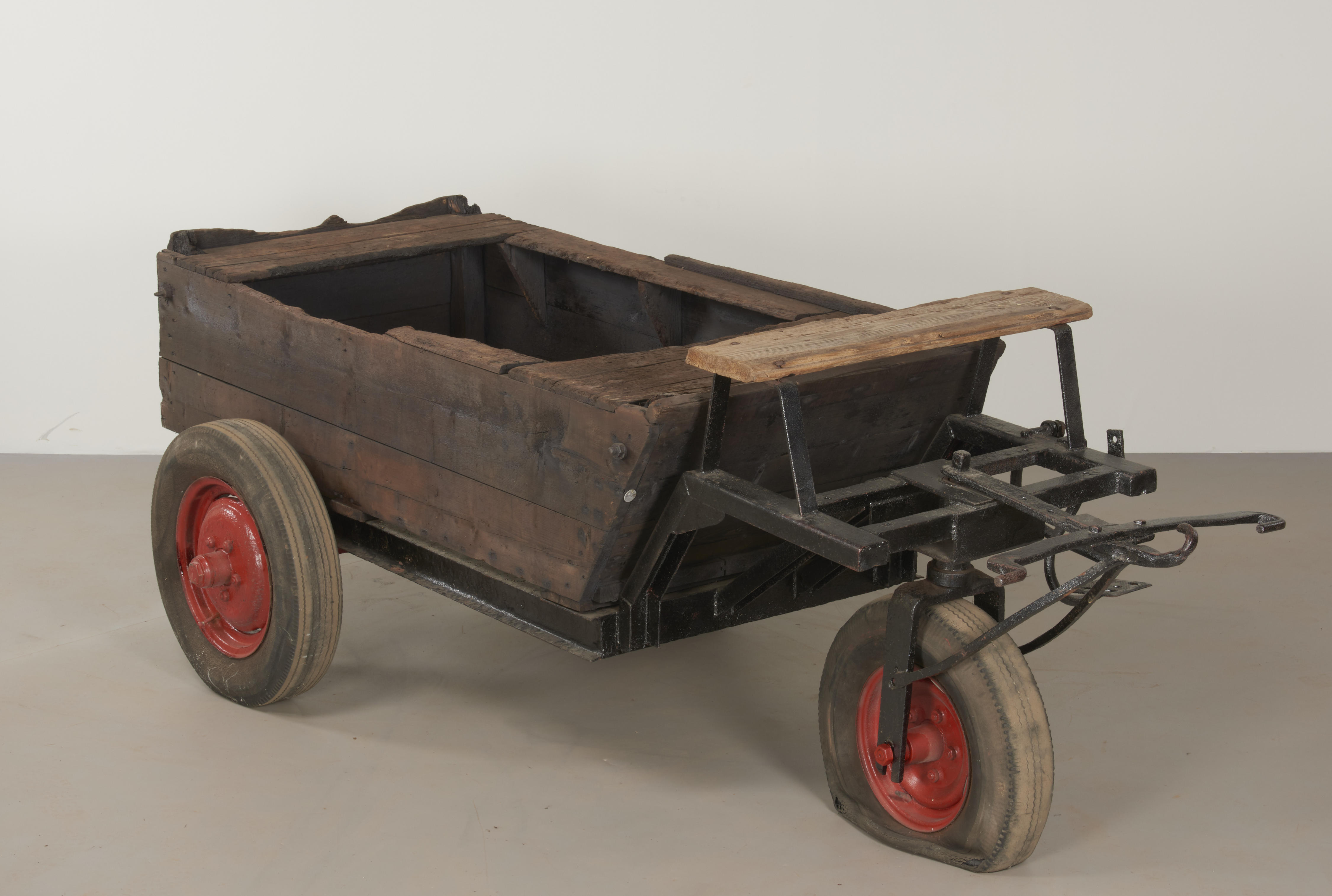 Driewielskar op luchtbanden, gebruikt voor het transport van vloeibare stalmest naar het land. De voerman reed mee op de verhoogde zitplank. De wagen is afkomstig van boerderij De Kolkrijst, Hoogland, Utrecht.