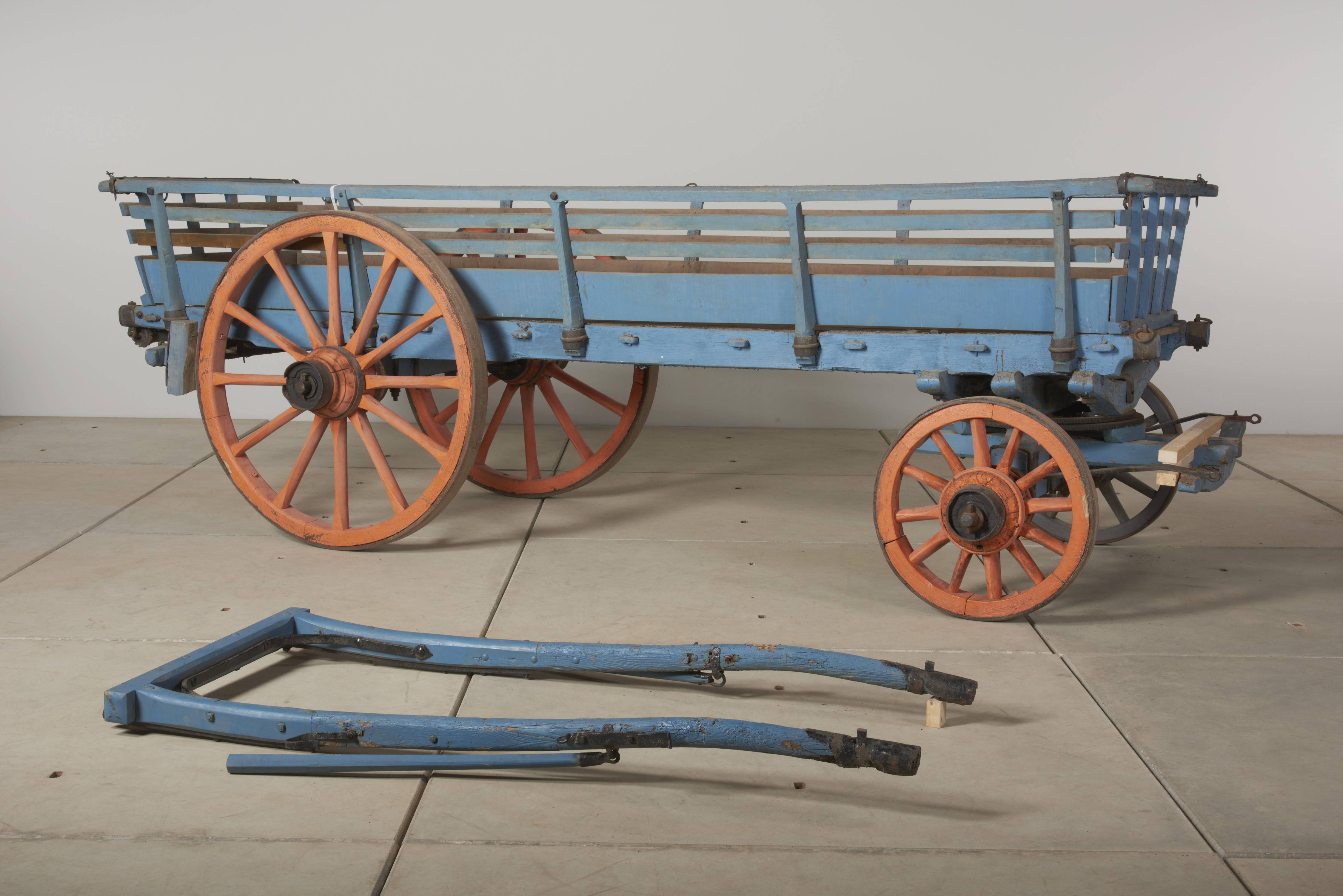 Boerenwagen, type oogstwagen uit het krijt- en lössgebied van Zuid-Limburg. Opvallende kenmerken van wagens uit dit gebied zijn onder andere draaibare voorwielen, het schuin naar buiten lopende hekwerk, remblokken aan een balk en de voor- en achterwielen met precies twaalf spaken. De wagen werd tot 1945-1946 gebruikt voor agrarisch transport, zoals het vervoeren van hooi, ...