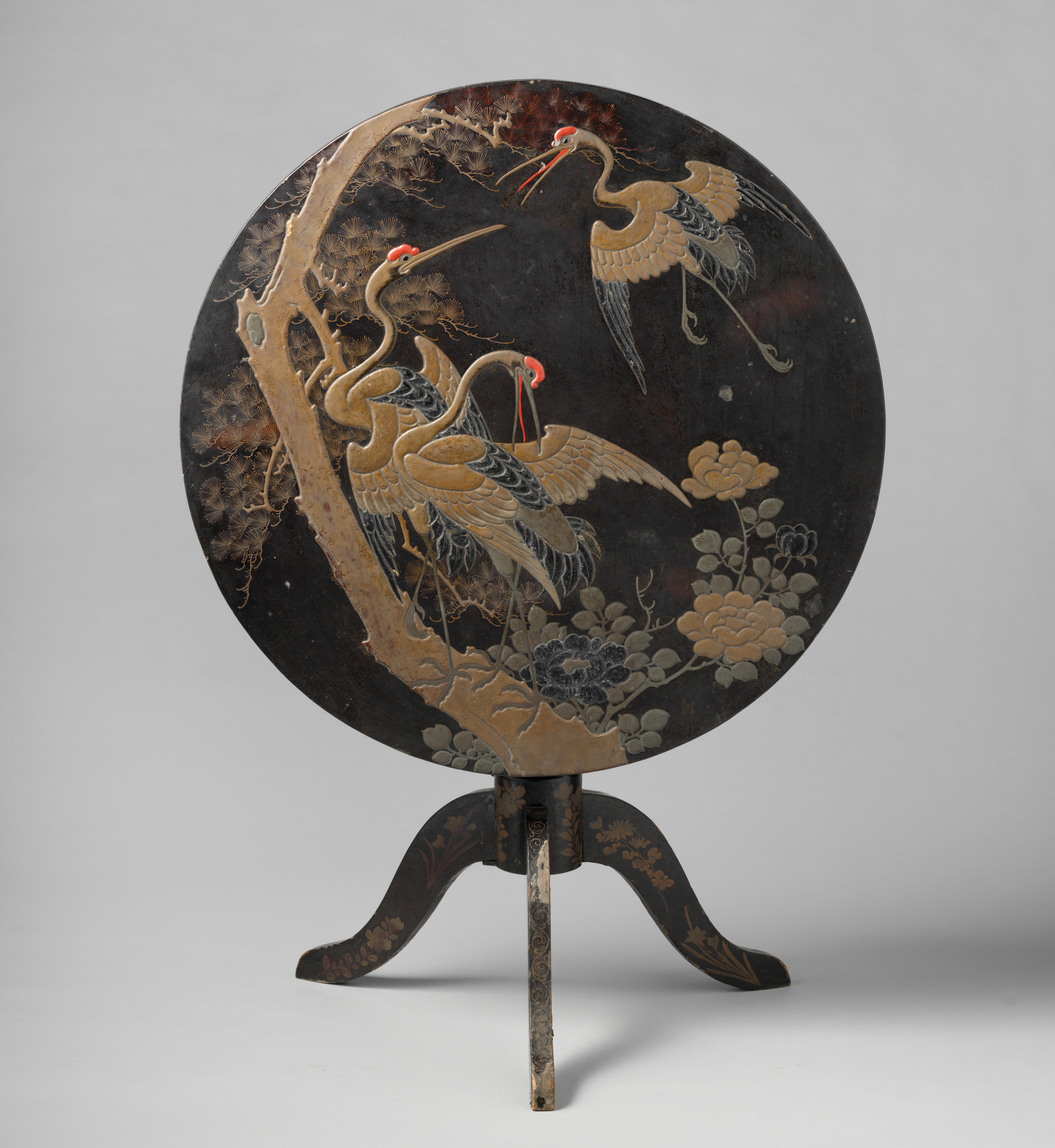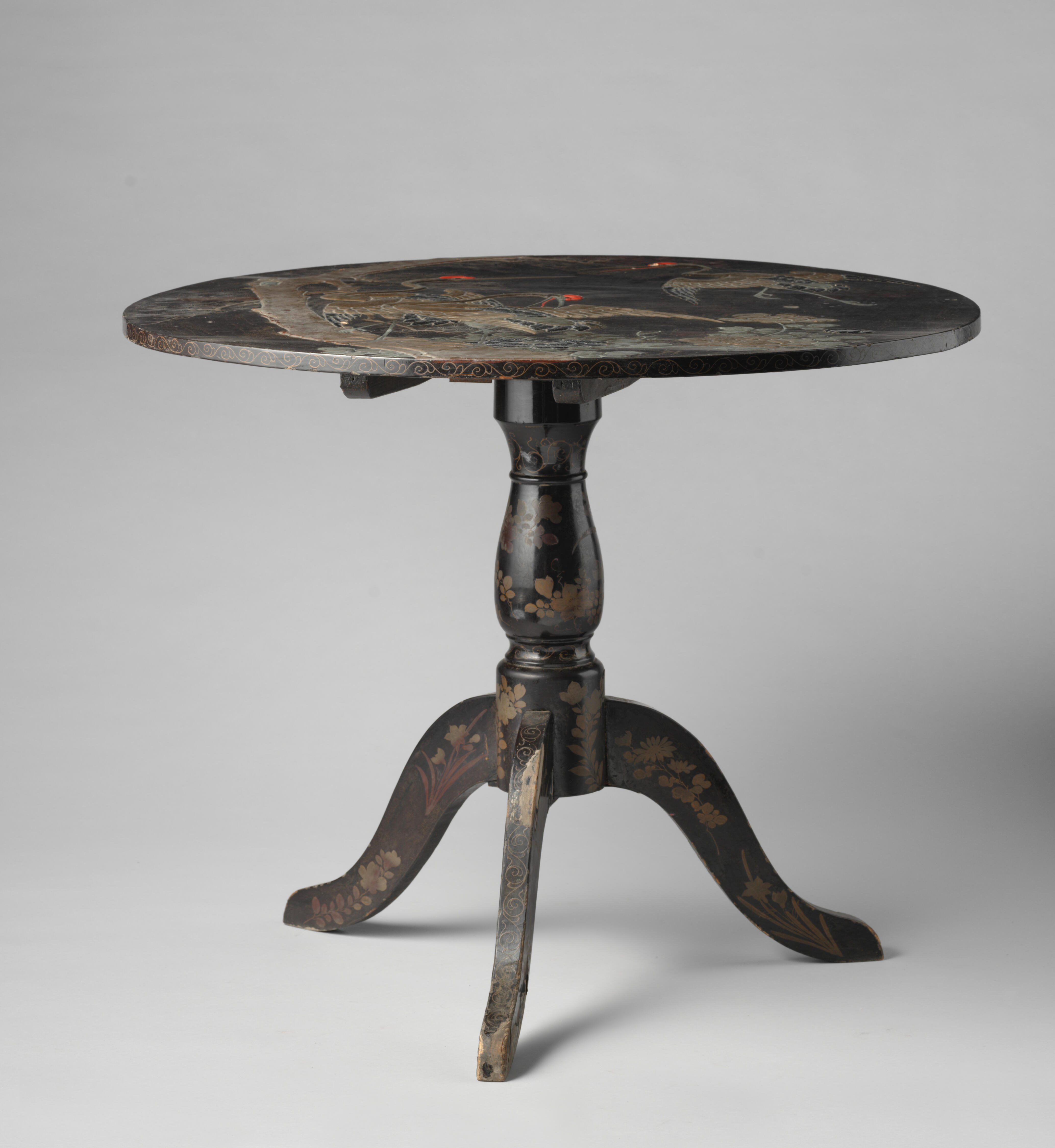 Houten klaptafel met voorstellingen van kraanvogels op het blad.