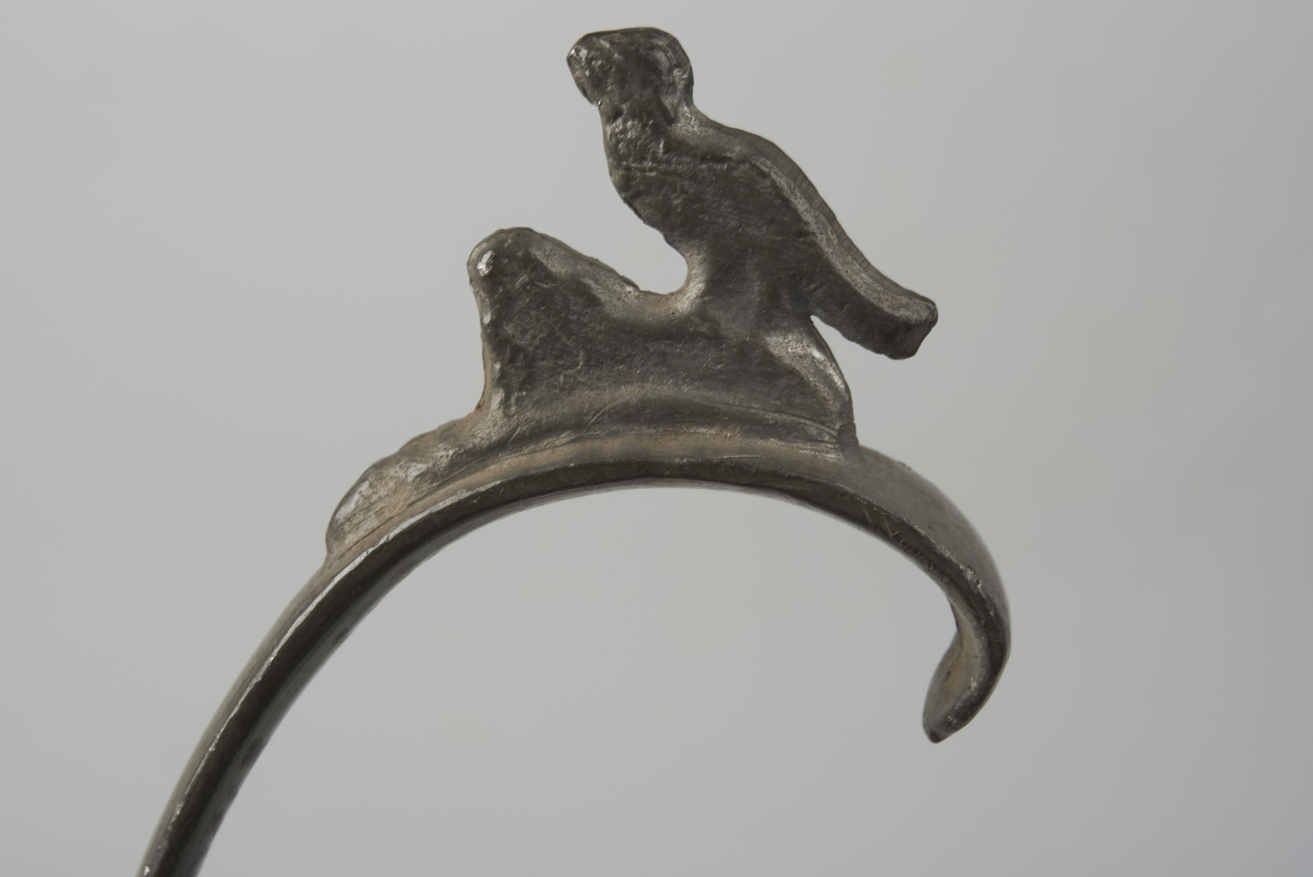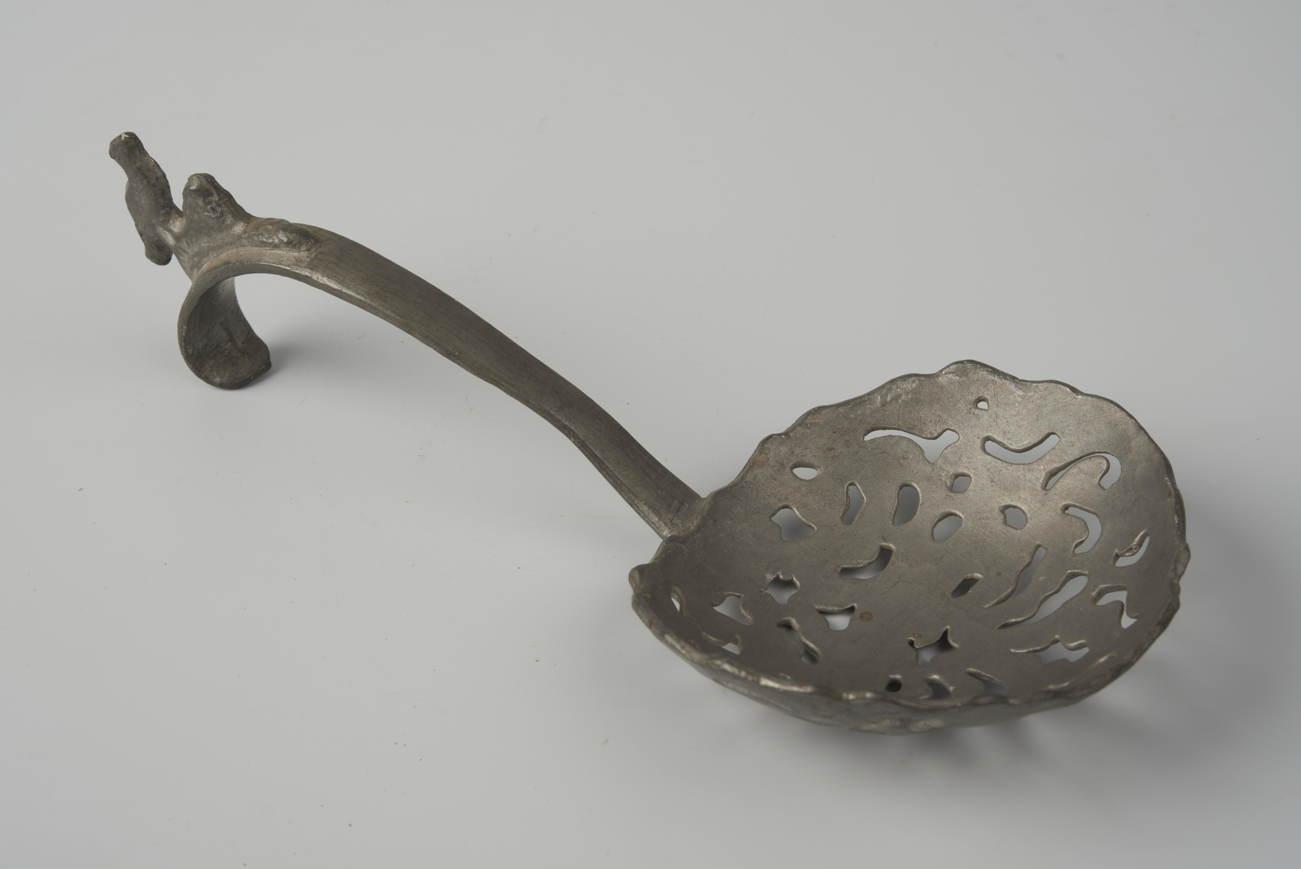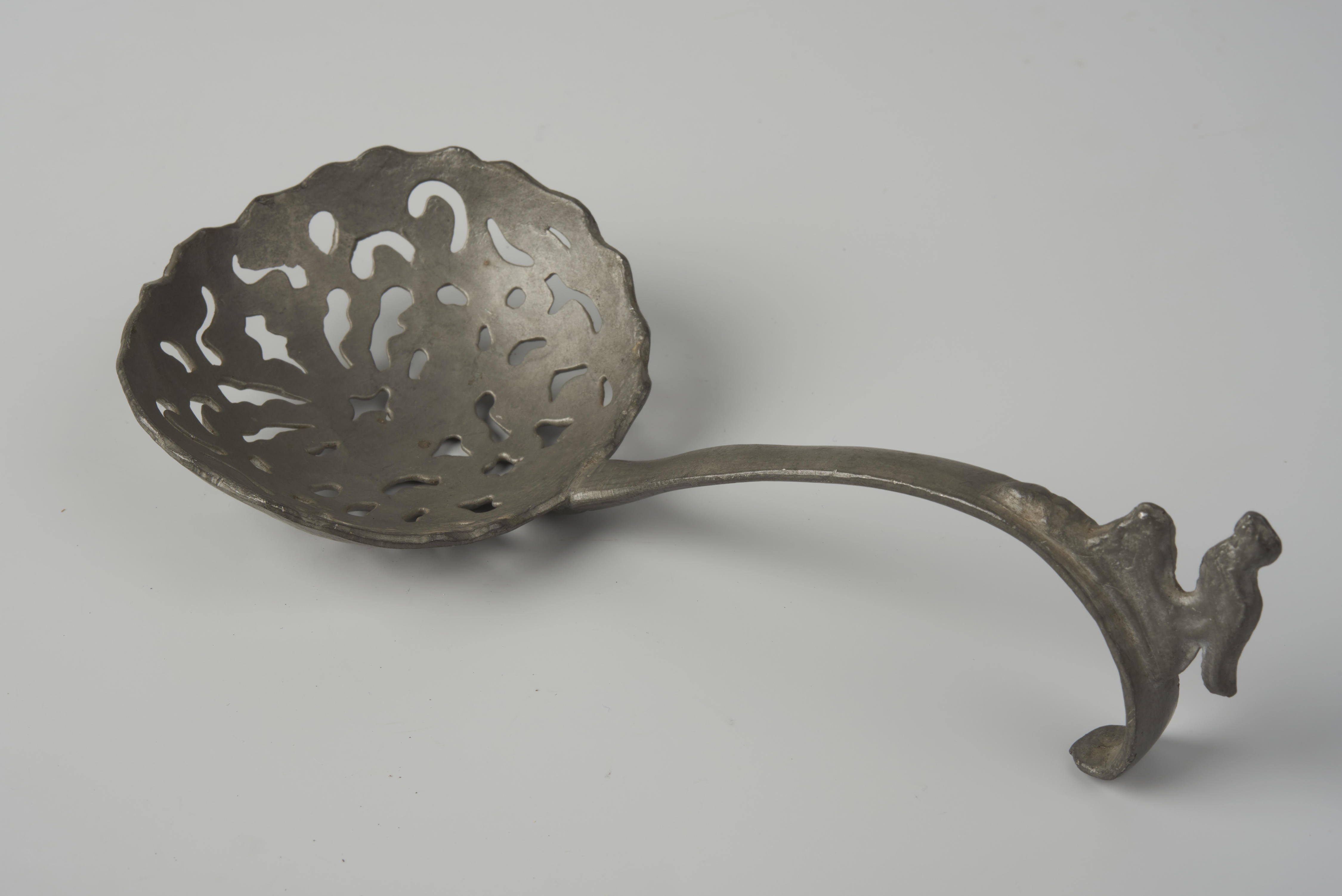 Tinnen suikerstrooier of poedersuikerlepel, versierd met een vogelmotiefje op de steel.