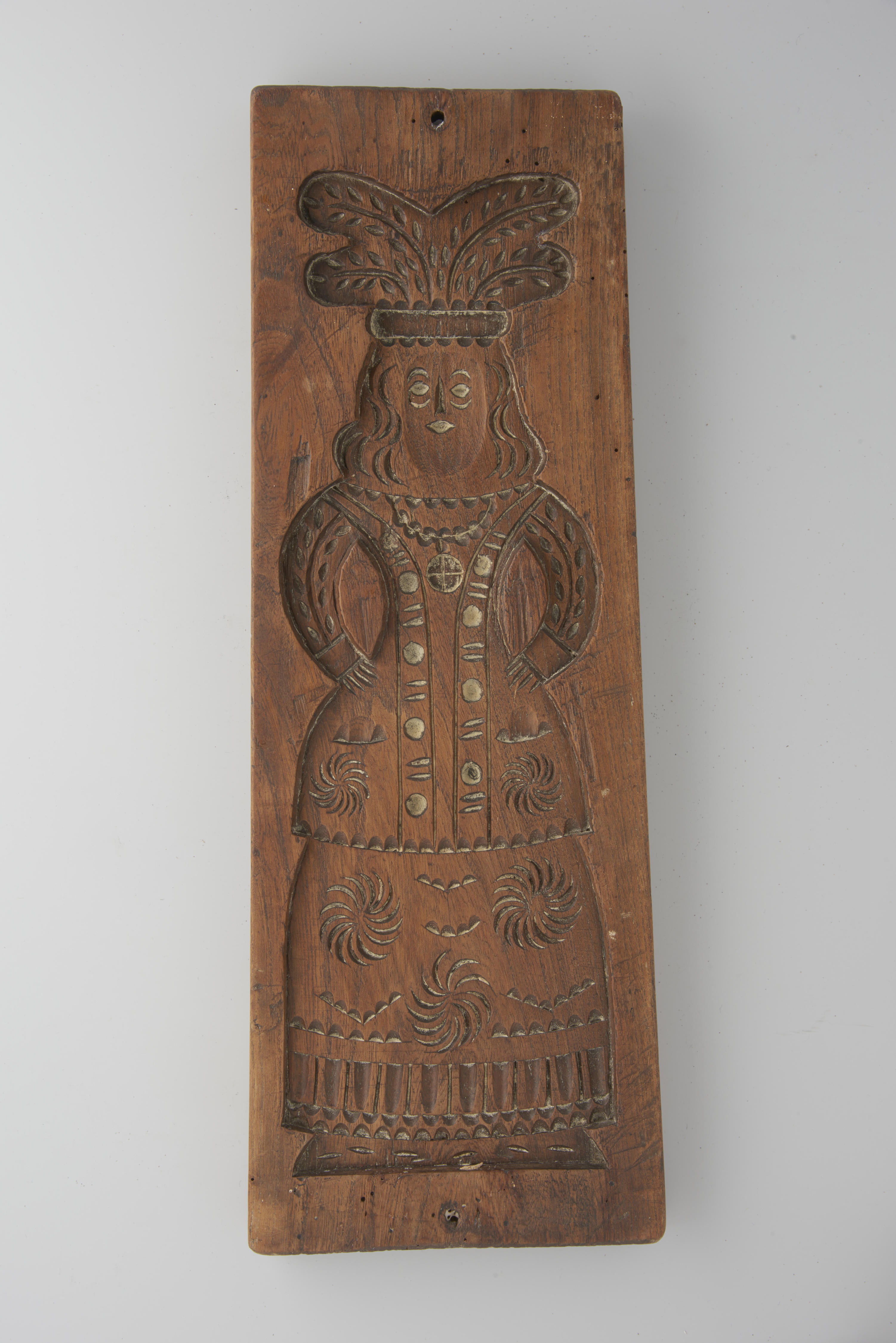 Essenhouten koekplank. De plank is aan één zijde besneden met een voorstelling van een vrouw en aan de andere zijde met een voorstelling van een man.