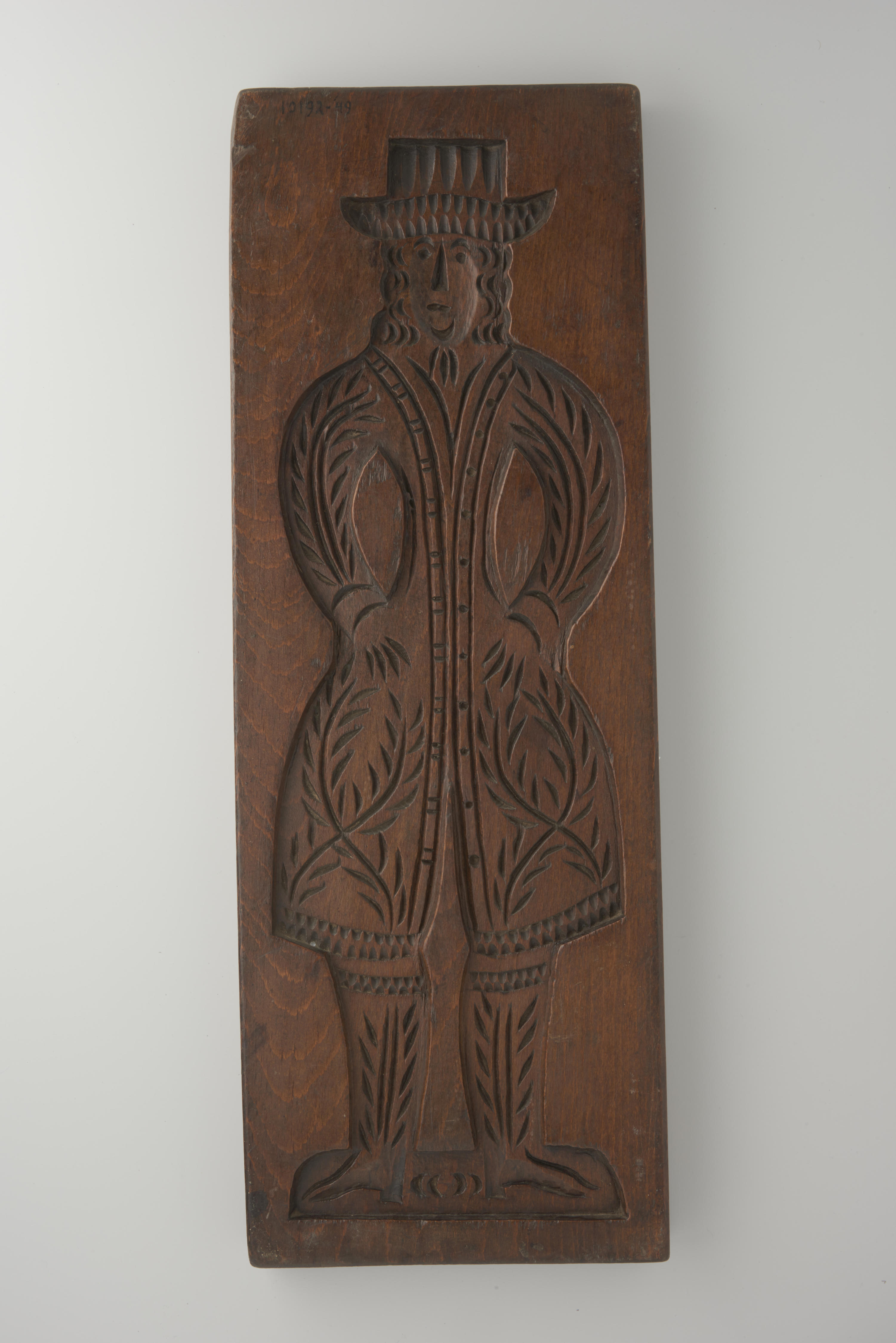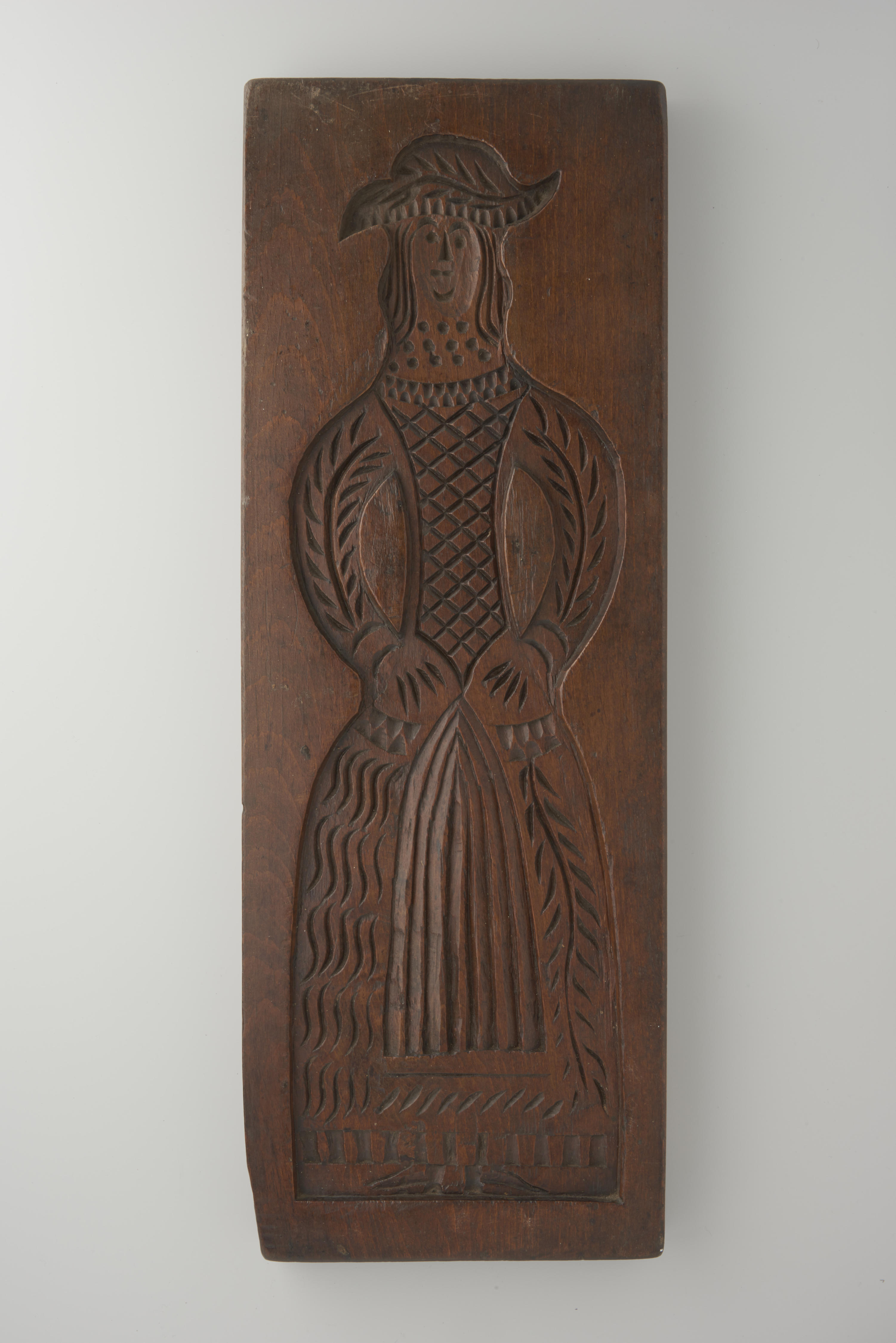 Beukenhouten koekplank. De plank is aan één zijde besneden met een voorstelling van een man en aan de andere zijde met een voorstelling van een vrouw.