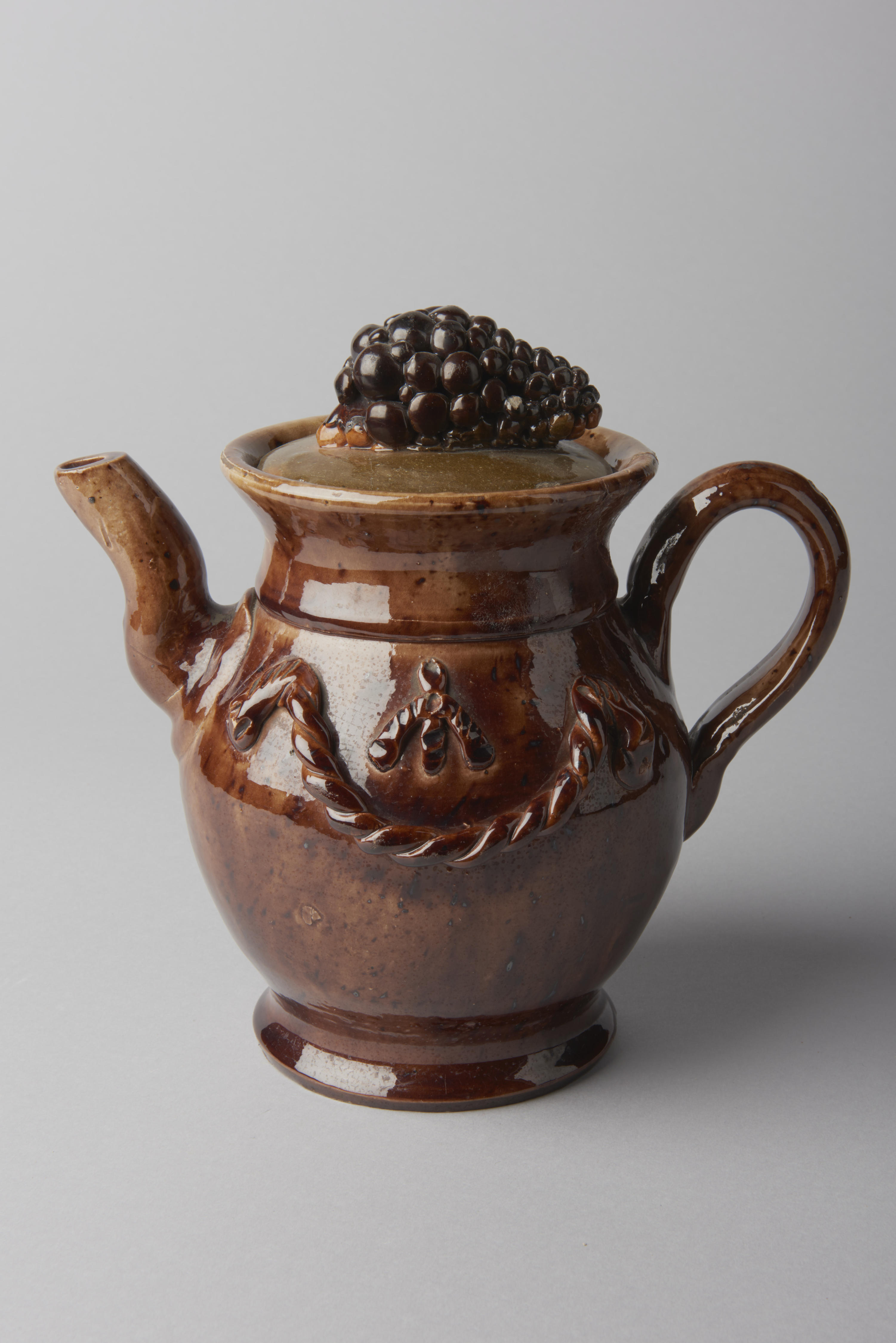 Theepot, versierd met guirlandes. Op het deksel is een versiering in de vorm van een druiventros aangebracht. Deze theepot is gemaakt door de pottenbakker Sprengers in Steijl. De knikvorm van de tuit was Sprengers' uitvinding, bedoeld om morsen bij het uitschenken te voorkomen.